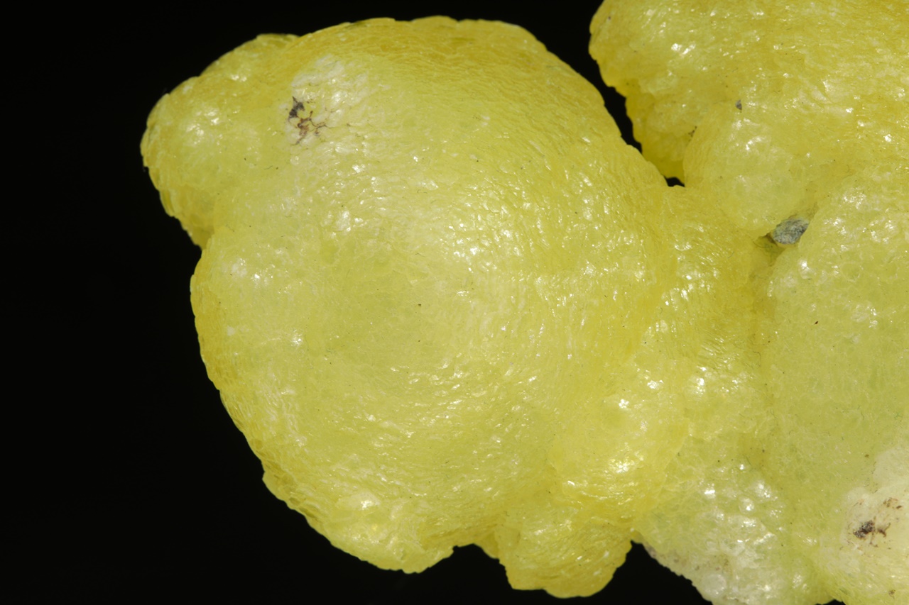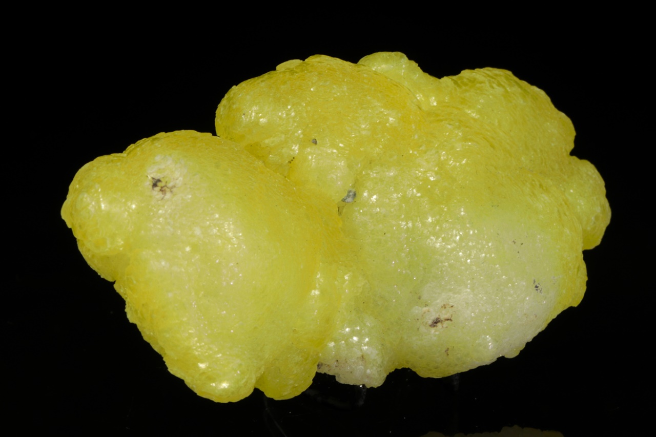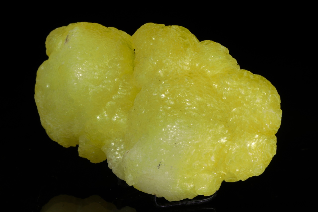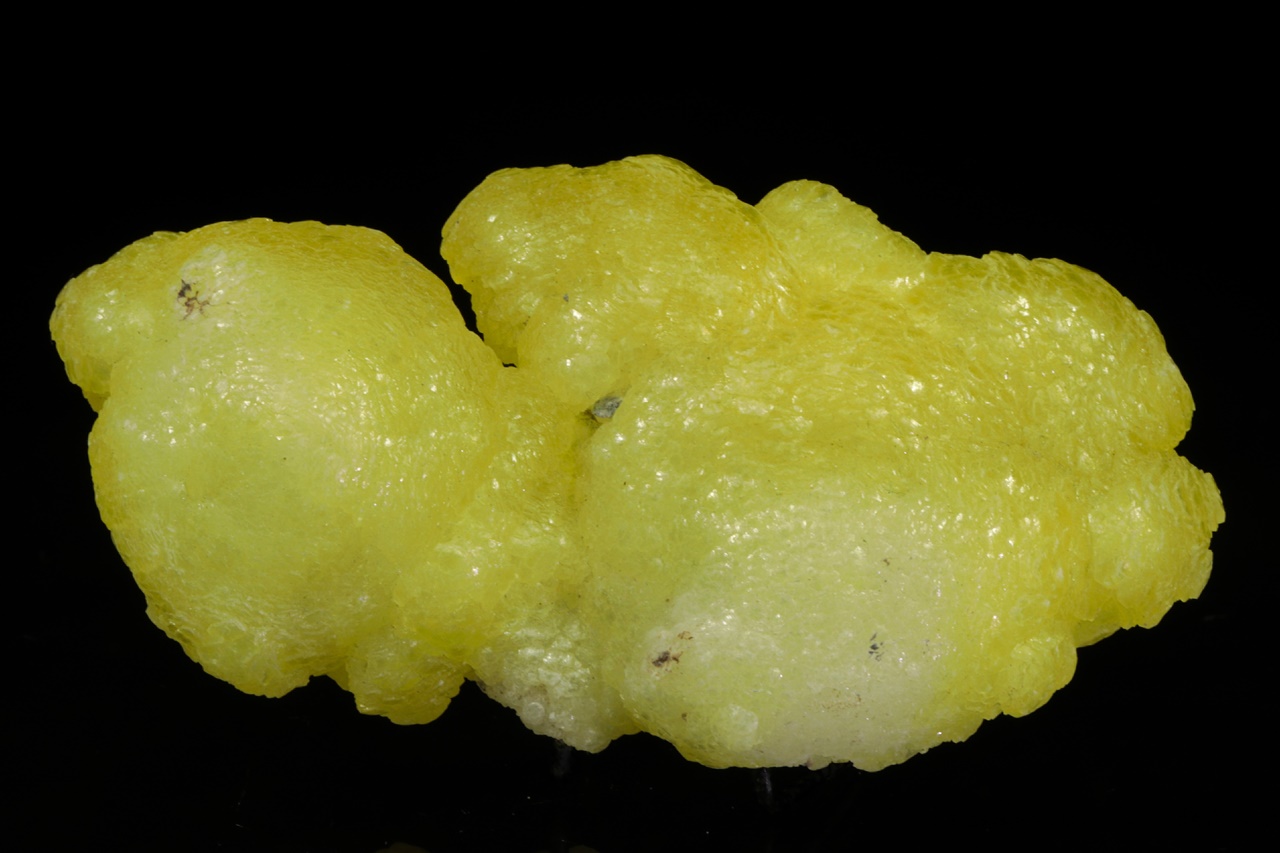 Kanárkově žlutý brucit tvořící voskově lesklé ledvinité agregáty. Velmi pěkný vzorek z vyhlášené lokality tohoto minerálu.