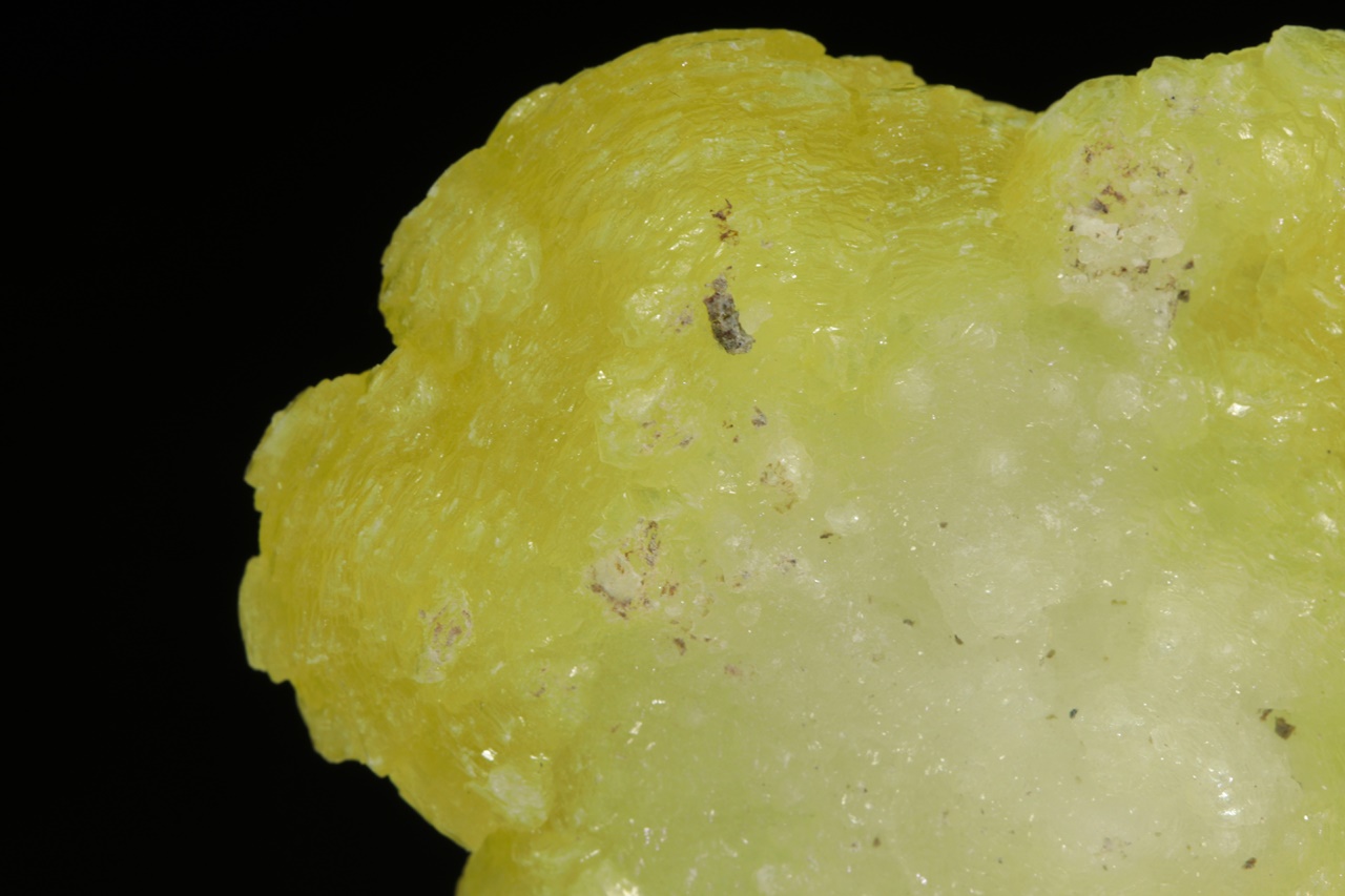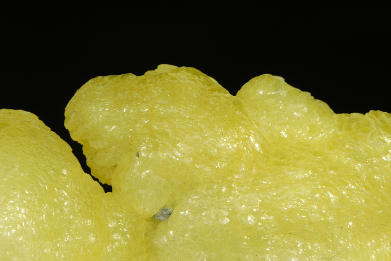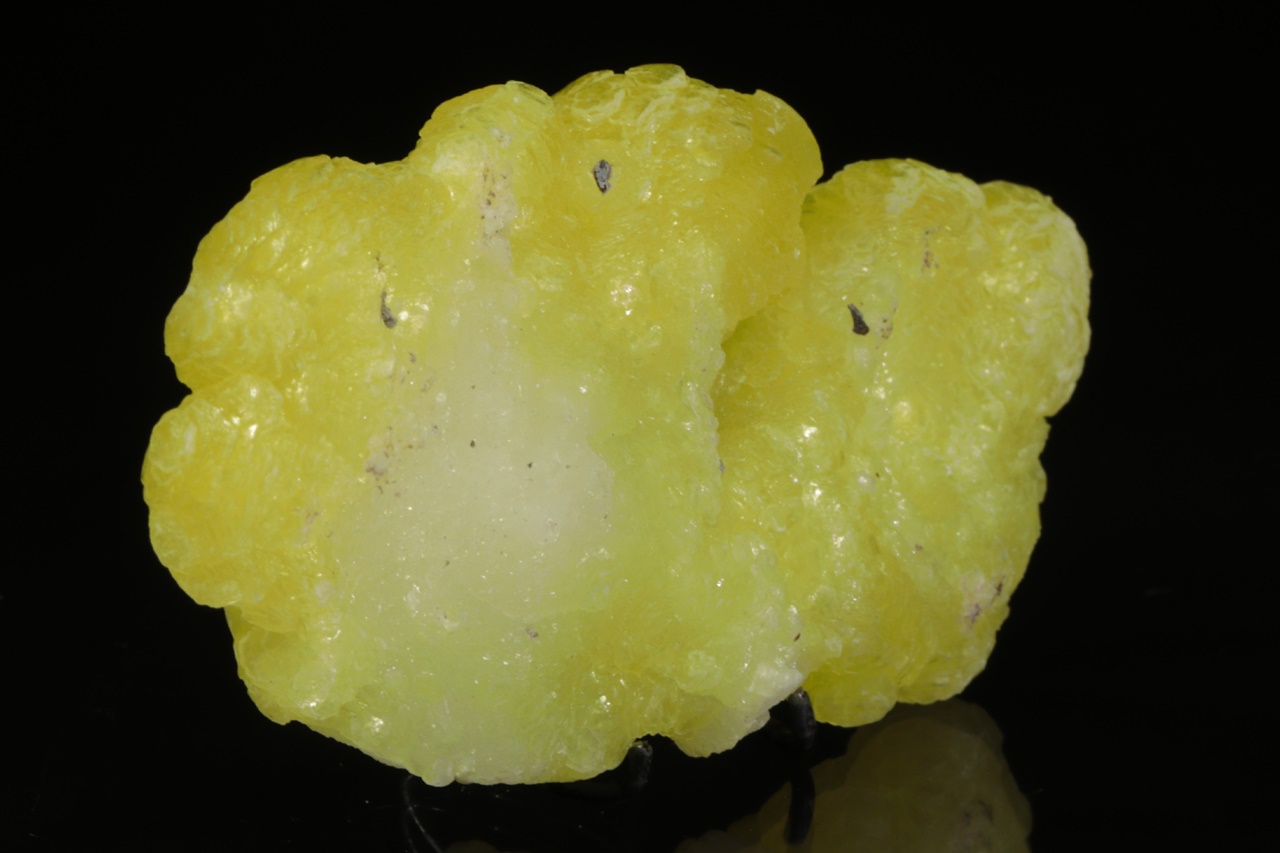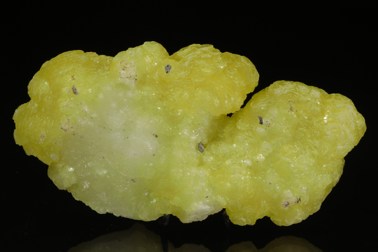 Kanárkově žlutý brucit tvořící voskově lesklé ledvinité agregáty. Velmi pěkný vzorek z vyhlášené lokality tohoto minerálu.