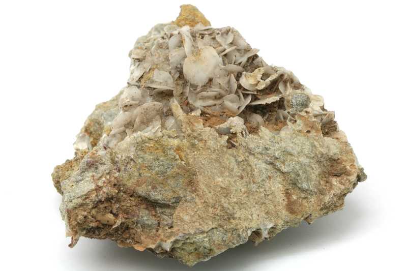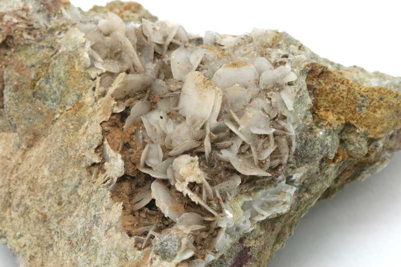 Probe von Calcit aus dem Fundort Jáchymov, Tschechische Republik. Probe von weißem Calcit mit blättrigen Kristallen von bis zu 9 mm Größe.