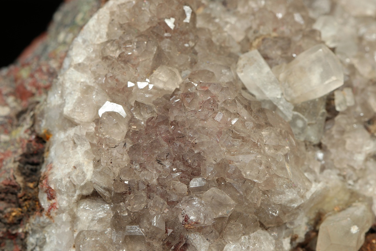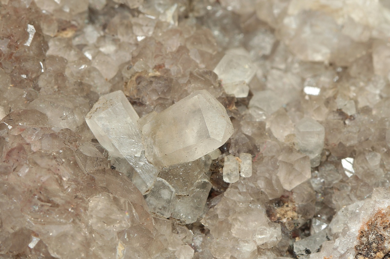 Krystalle von Calcit mit ungewöhnlicher prismatischer Entwicklung, gewachsen auf einem Drusen von heller Záhněda. Der größte Kristall ist 1 cm groß.