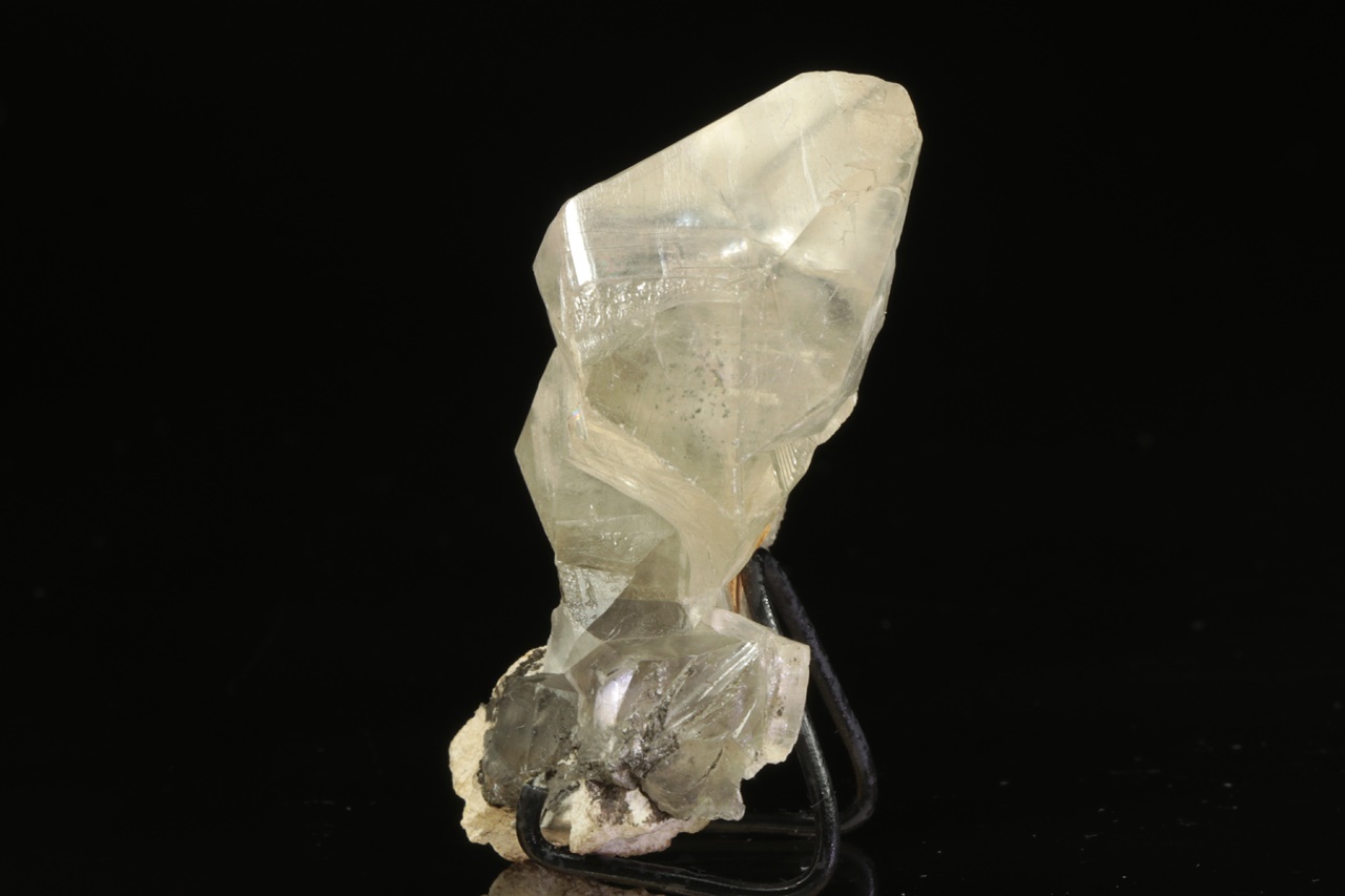 Klarer Skalenoeder-Kristall von Kalcit. Die Spitze des Kristalls ist leider abgeknipst.