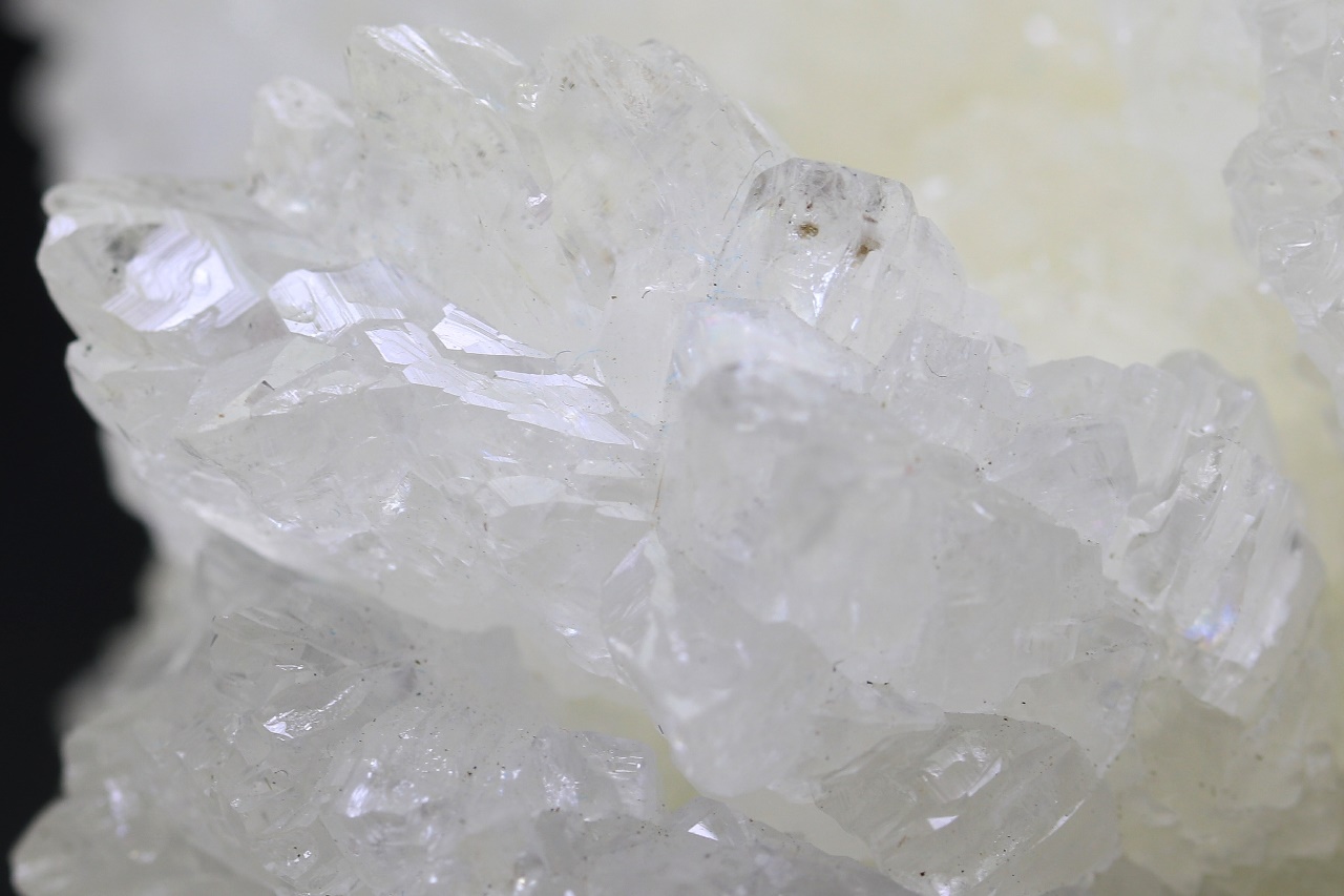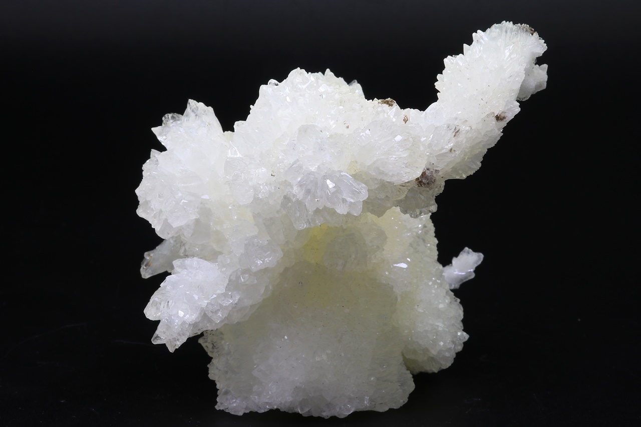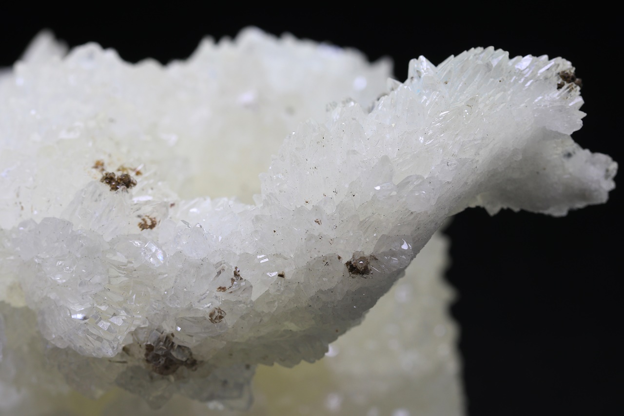 Ein ungewöhnlicher unregelmäßiger Stalaktit, bewachsen mit glänzenden Kristallen aus klarem Kalzit.