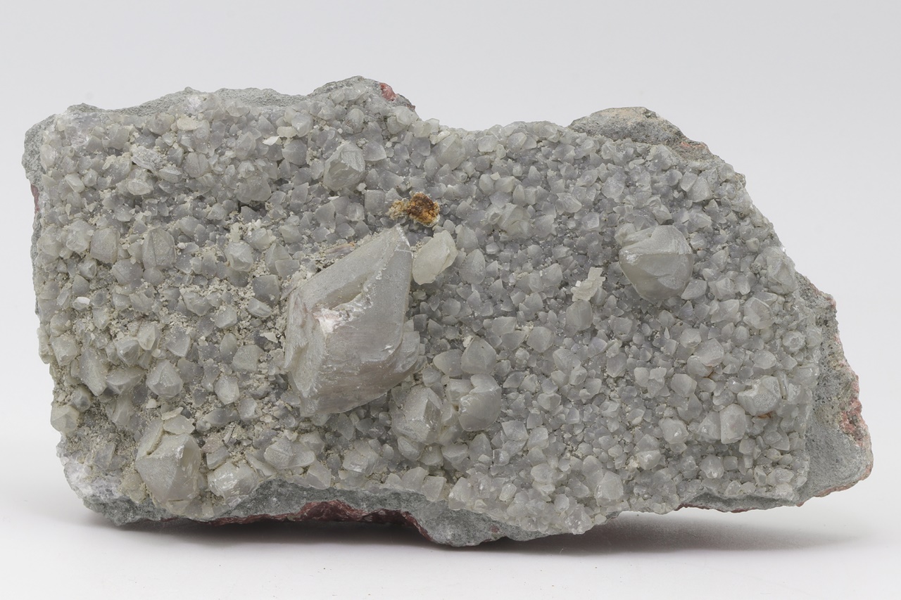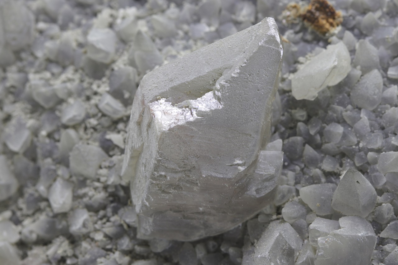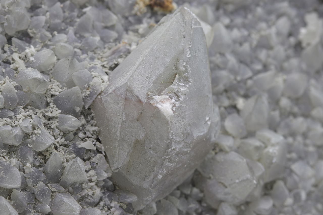 Druse grauer skalenoedrischer Kalzitkristalle, in deren Mitte ein 3,5 cm großer Einzelkristall hervorsticht.