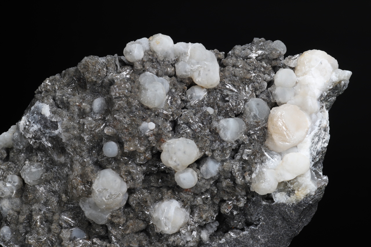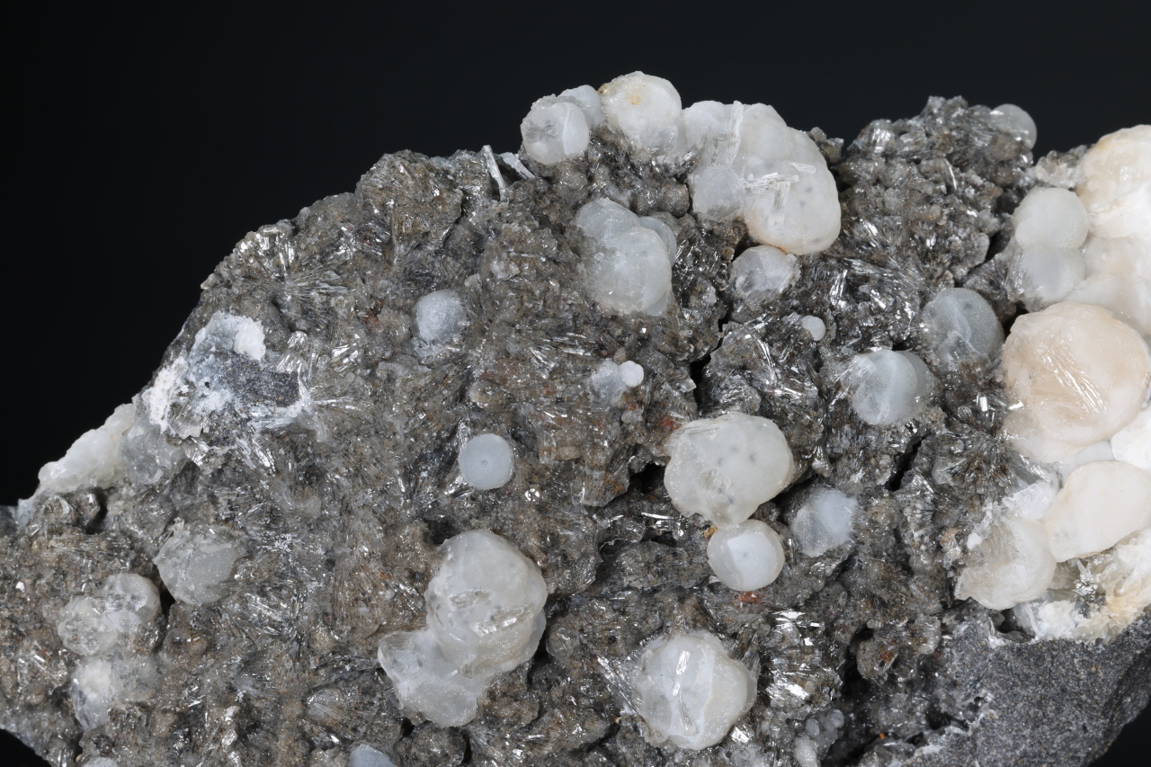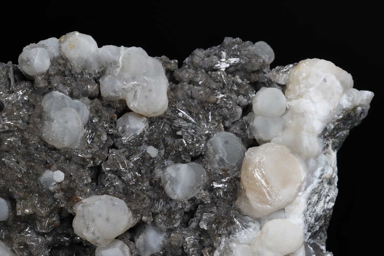 Druse aus weißen bis hell orangefarbenen, sphärischen Aggregaten von Calcit mit einer Größe von bis zu 11 mm, zusammen mit klaren Kristallen von Aragonit, die breit auf der Probe wachsen. Ein ästhetisches Beispiel von Carbonaten aus dem Velké Dravce Steinbruch in der Slowakei .