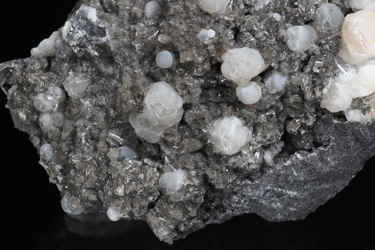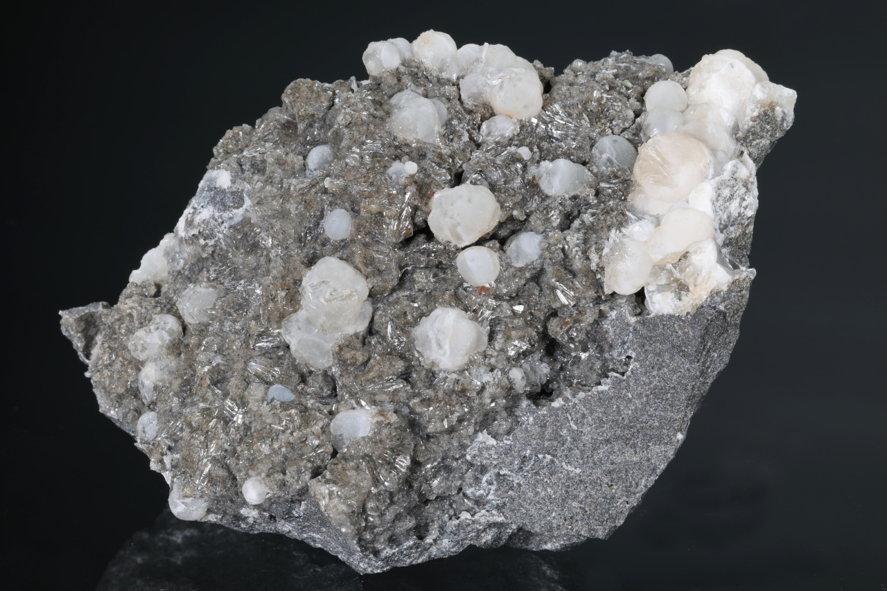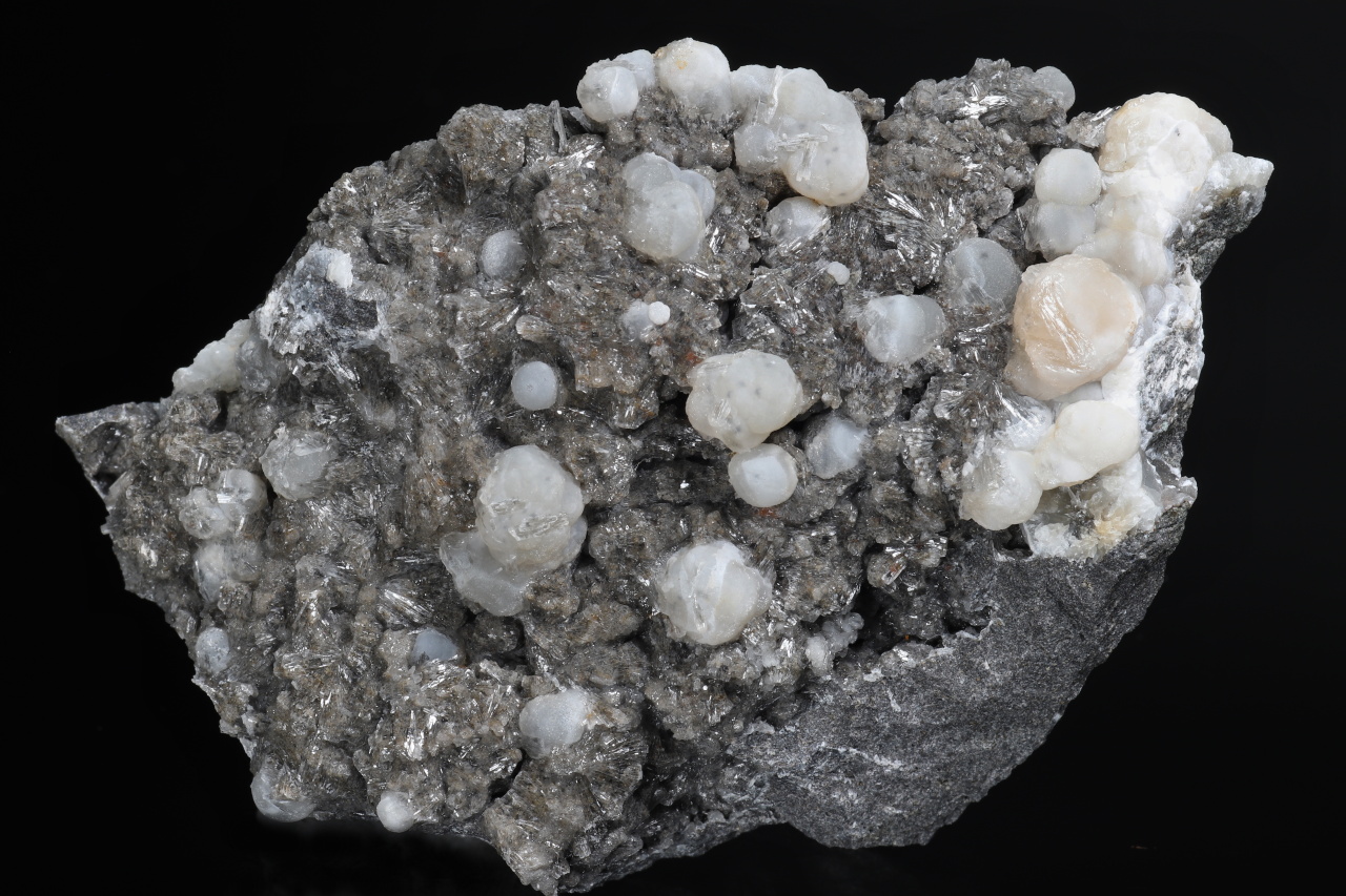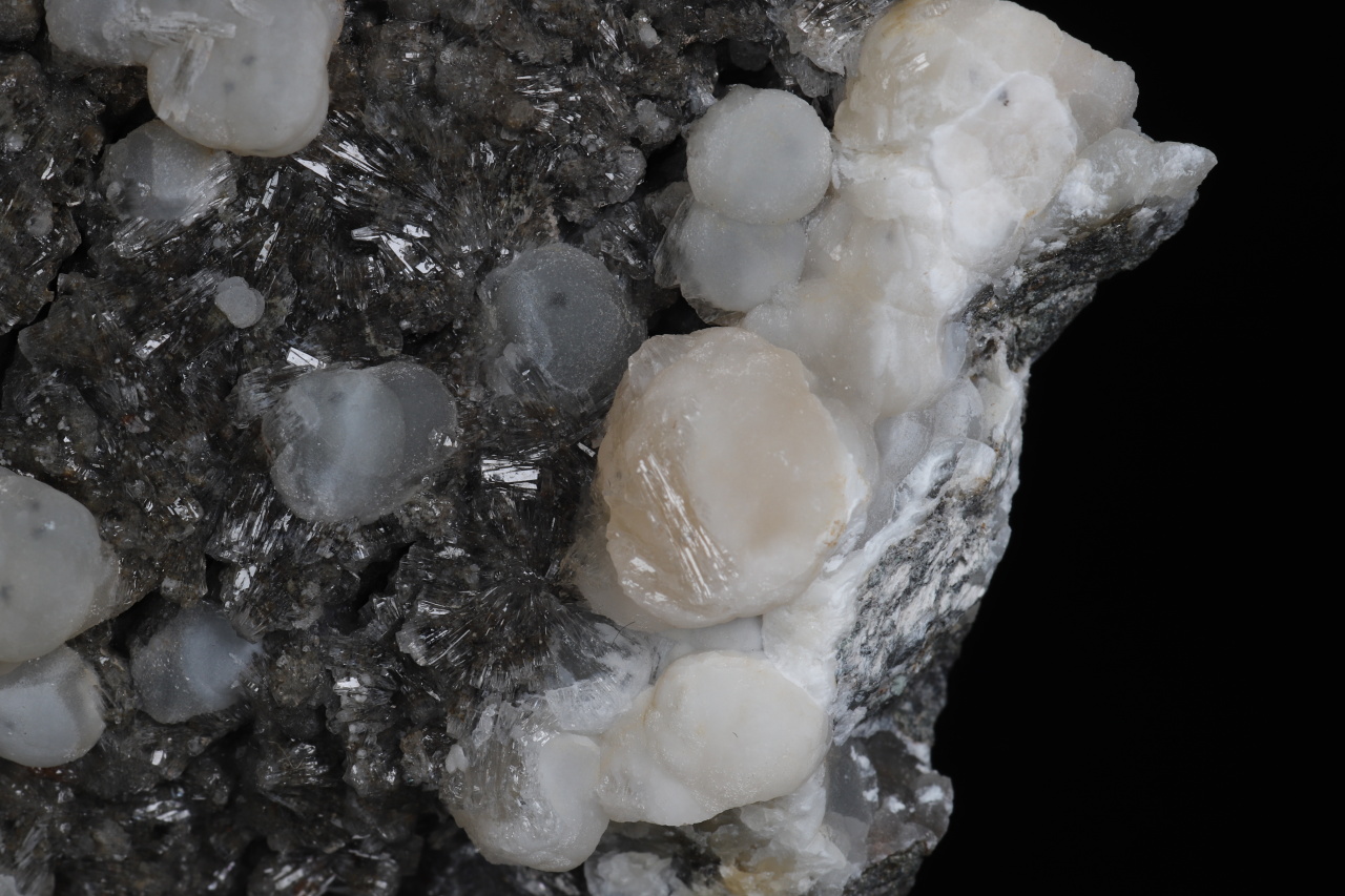 Druse aus weißen bis hell orangefarbenen, sphärischen Aggregaten von Calcit mit einer Größe von bis zu 11 mm, zusammen mit klaren Kristallen von Aragonit, die breit auf der Probe wachsen. Ein ästhetisches Beispiel von Carbonaten aus dem Velké Dravce Steinbruch in der Slowakei .