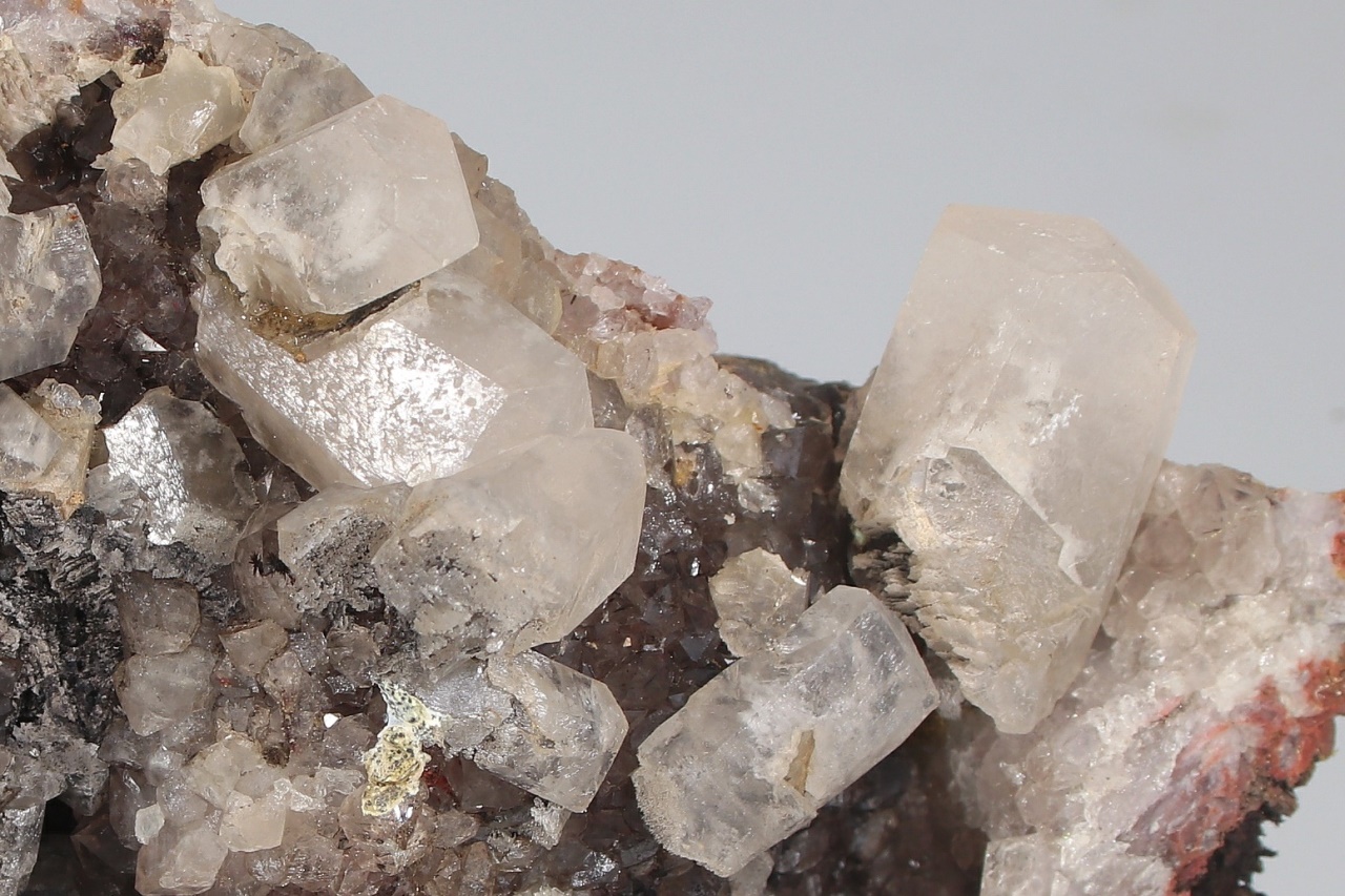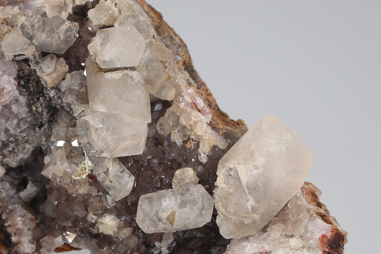 Rauchquartz-Geode mit prismatischen Kalcitkristallen bis zu 2,5 cm Größe.