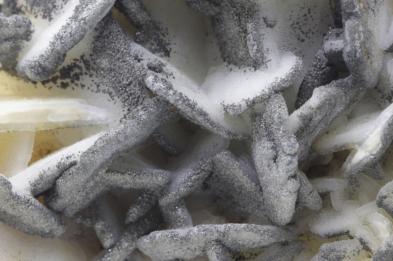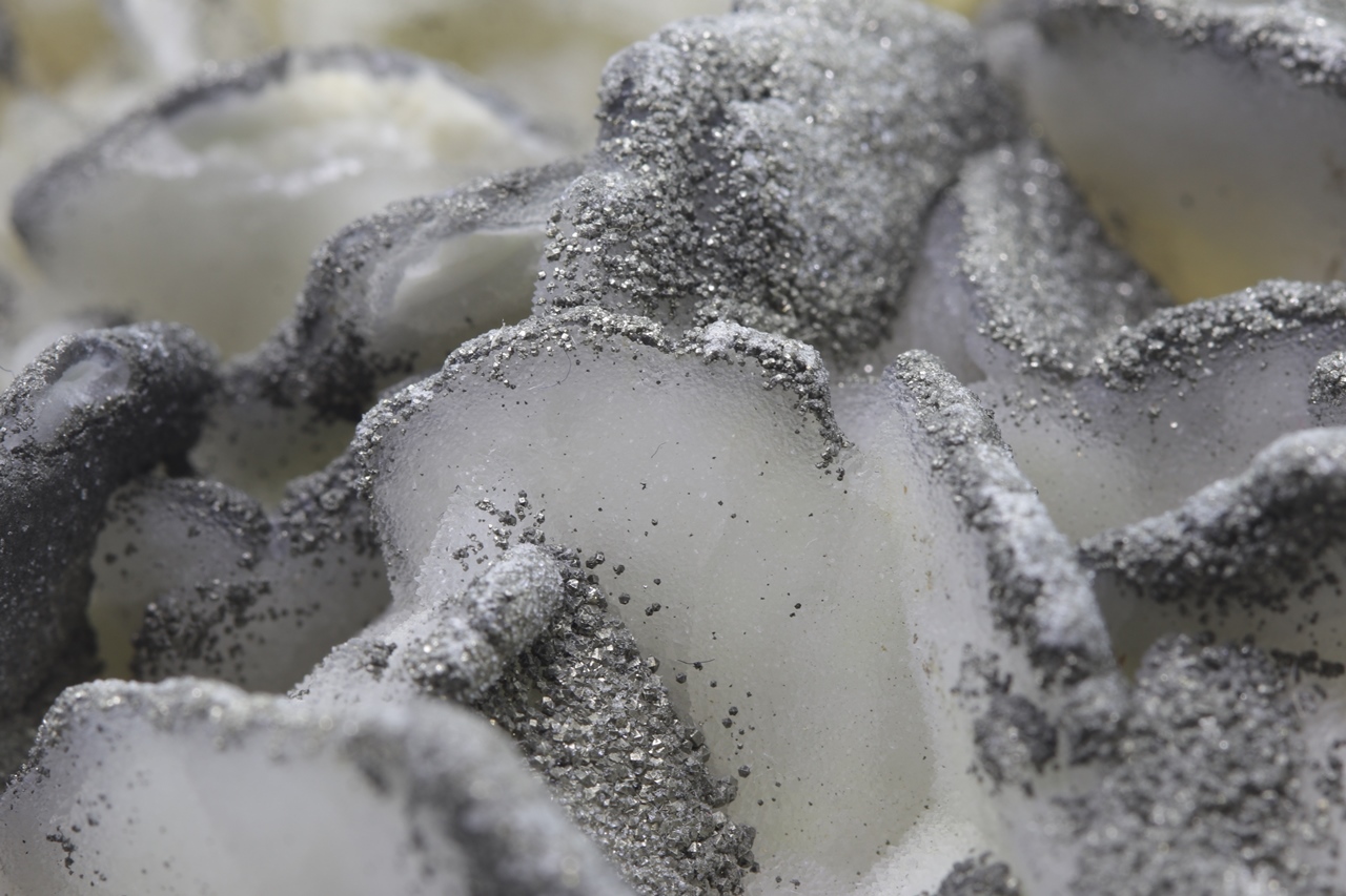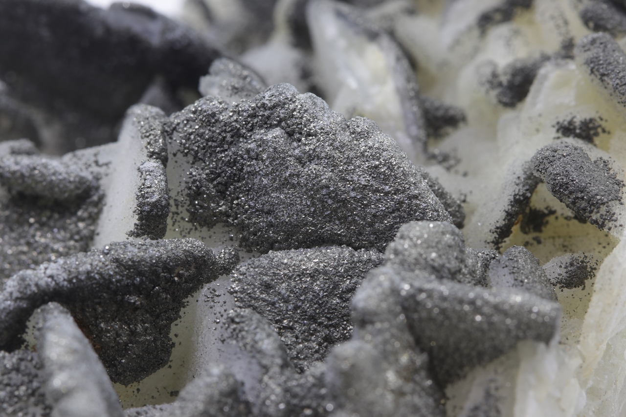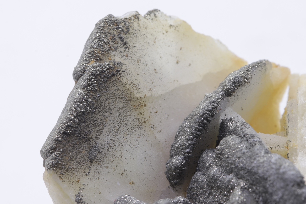 Tabellarische weiße Calcit-Kristalle bis zu 3 cm groß „bestreut“ mit kleinen Kristallen von goldfarbenem Pyrit.