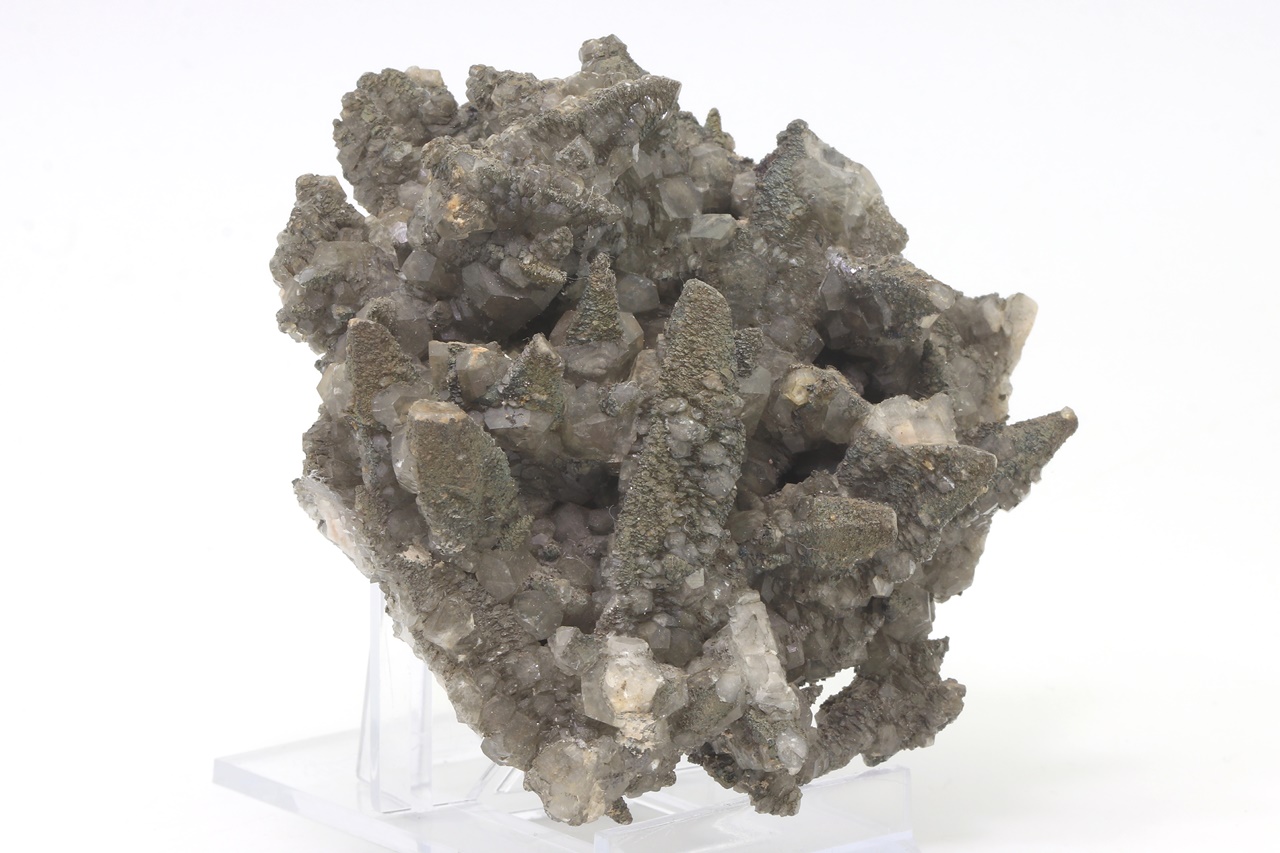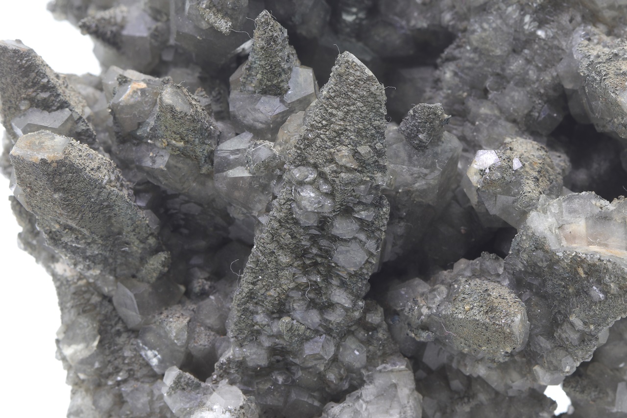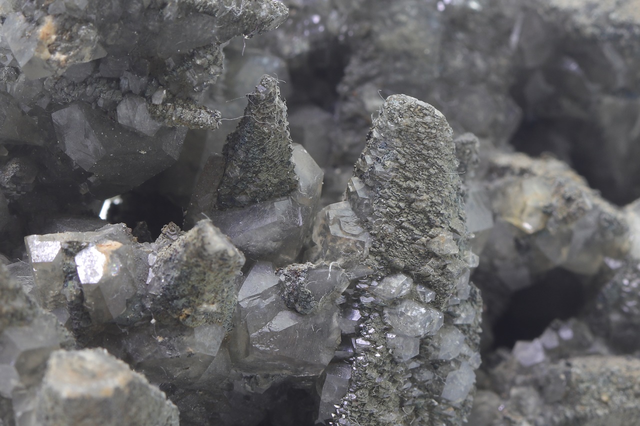 Druse skalenohedrischer Kristalle von dunklem Kalcit bis zu 4 cm Größe, bestreut mit feinem Pyrit.