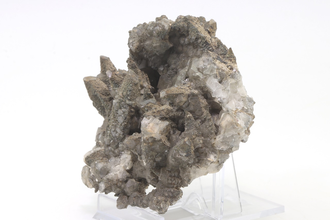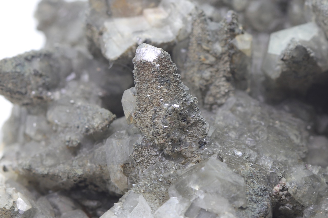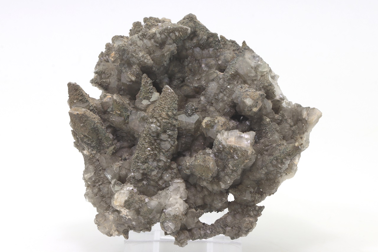 Druse skalenohedrischer Kristalle von dunklem Kalcit bis zu 4 cm Größe, bestreut mit feinem Pyrit.