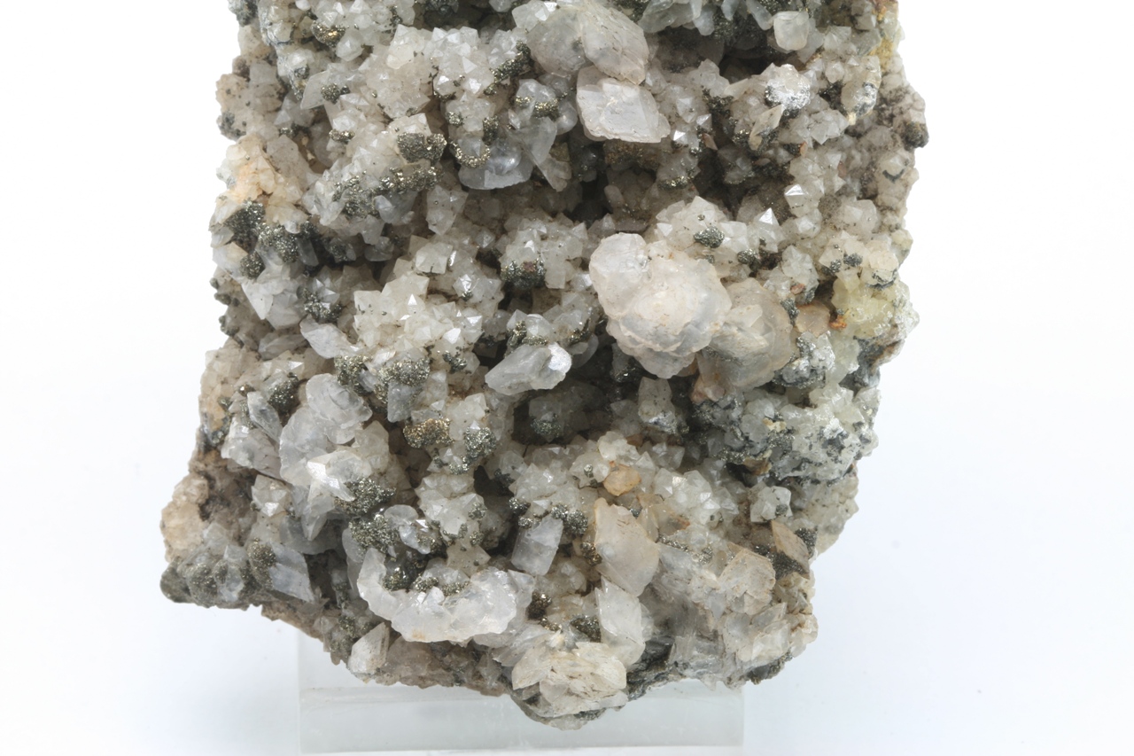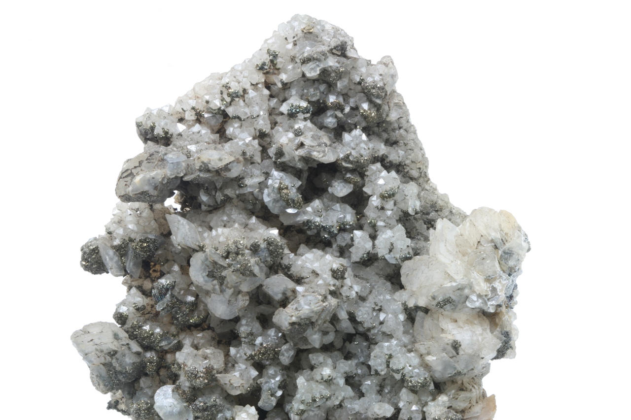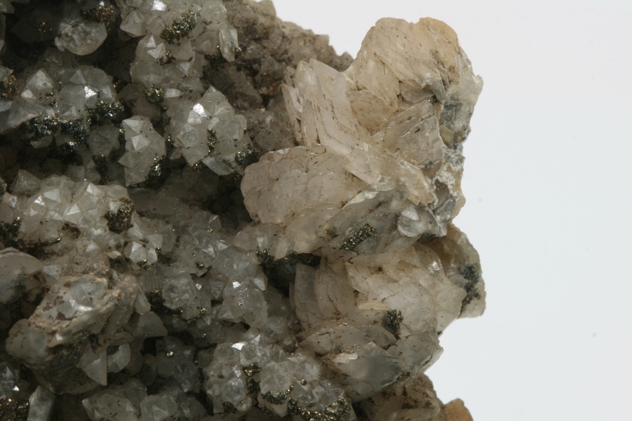 Ästhetische Probe von Kalcit gewachsen auf Quarz mit kleinen Pyrit-Kristallen.