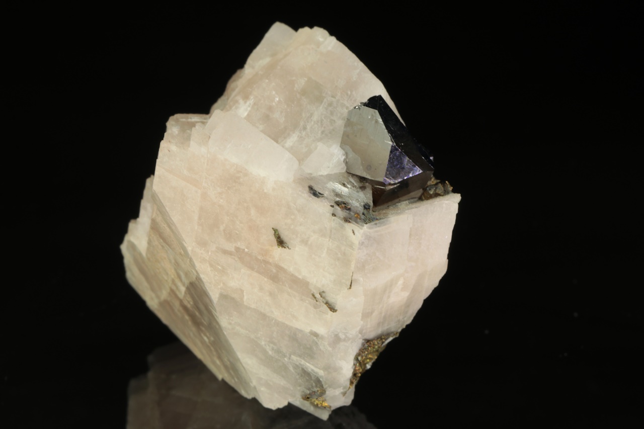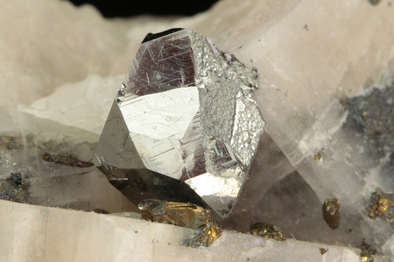 Ein großer Kristall von metallisch glänzendem Carrollit in einer Calcit-Höhle. Die Probe ist natürlich, ungeätzt. Die Größe des Kristalls beträgt 1,5 cm. Der Kristall hat eine leicht beschädigte Spitze.
