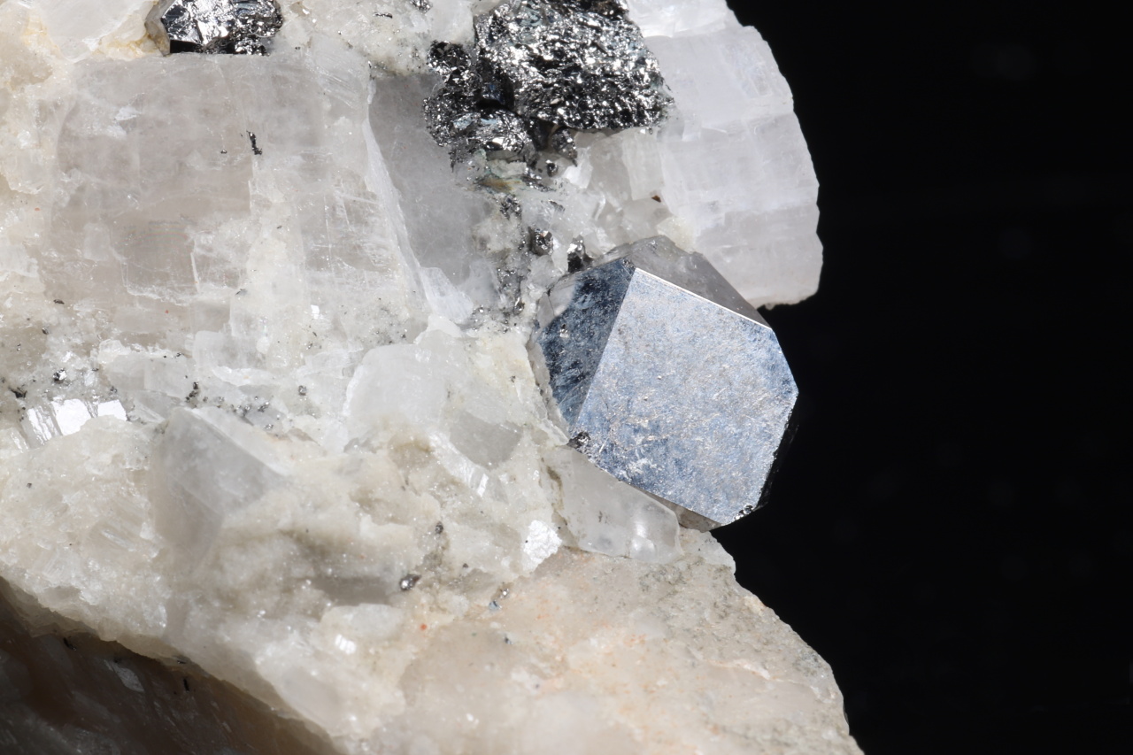 Ein perfekt begrenzter 8 mm großer silberweißer Kristall des seltenen Kupfer- und Kobaltsulfids aus dem afrikanischen Kongo. Schönes Beispiel eines Kristalls und eines körnigen Carrollits, eingewachsen in Kalcit.