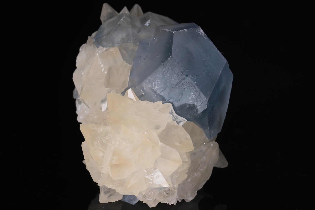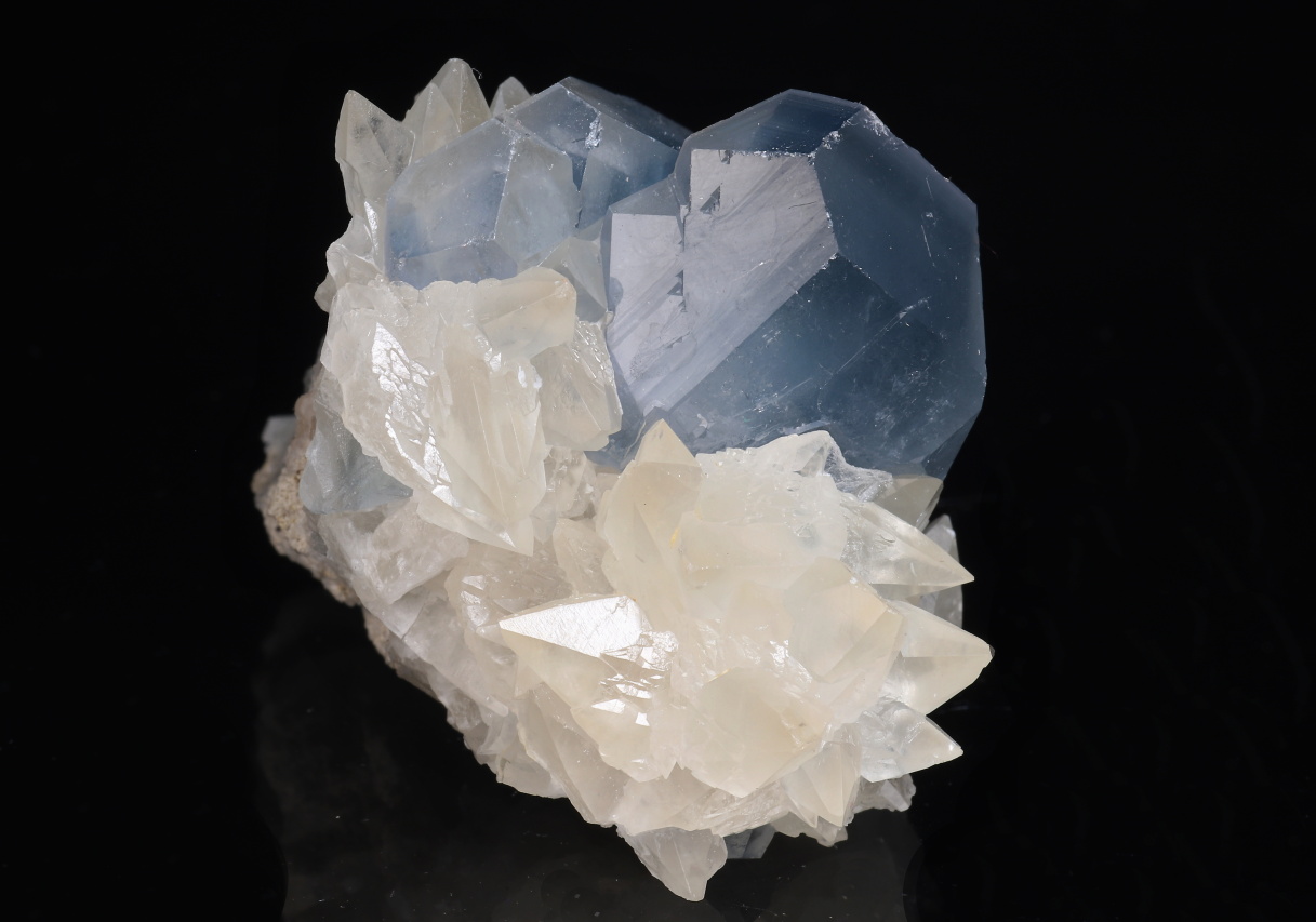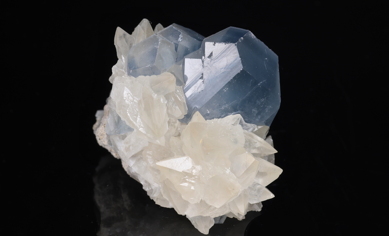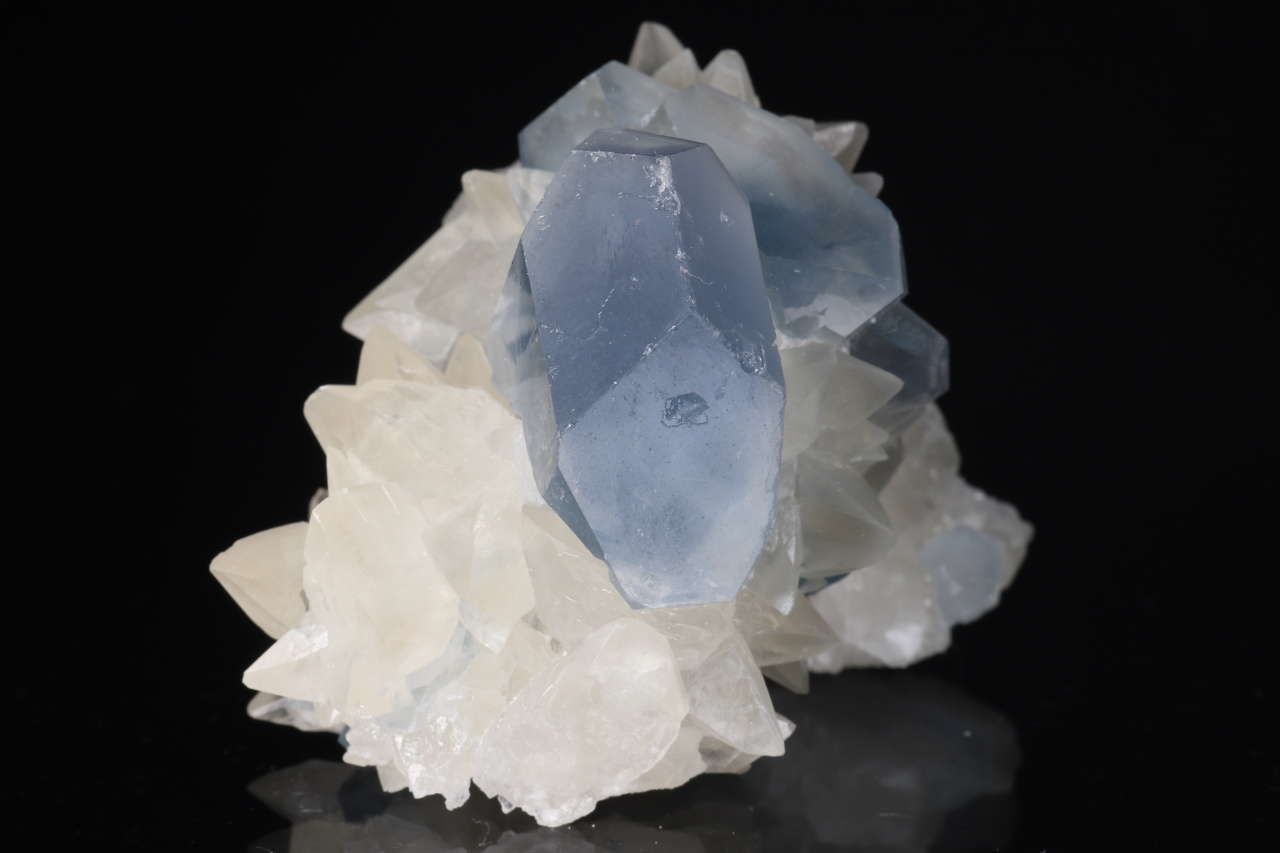 Kontrastní estetický menší vzorek dominantního sytě modrého 22 mm velkého krystalu celestýnu spolu se skalenoedry kalcitu. Velmi pěkná ukázka celestýnu z relativně nových nálezů z Afghánistánu.