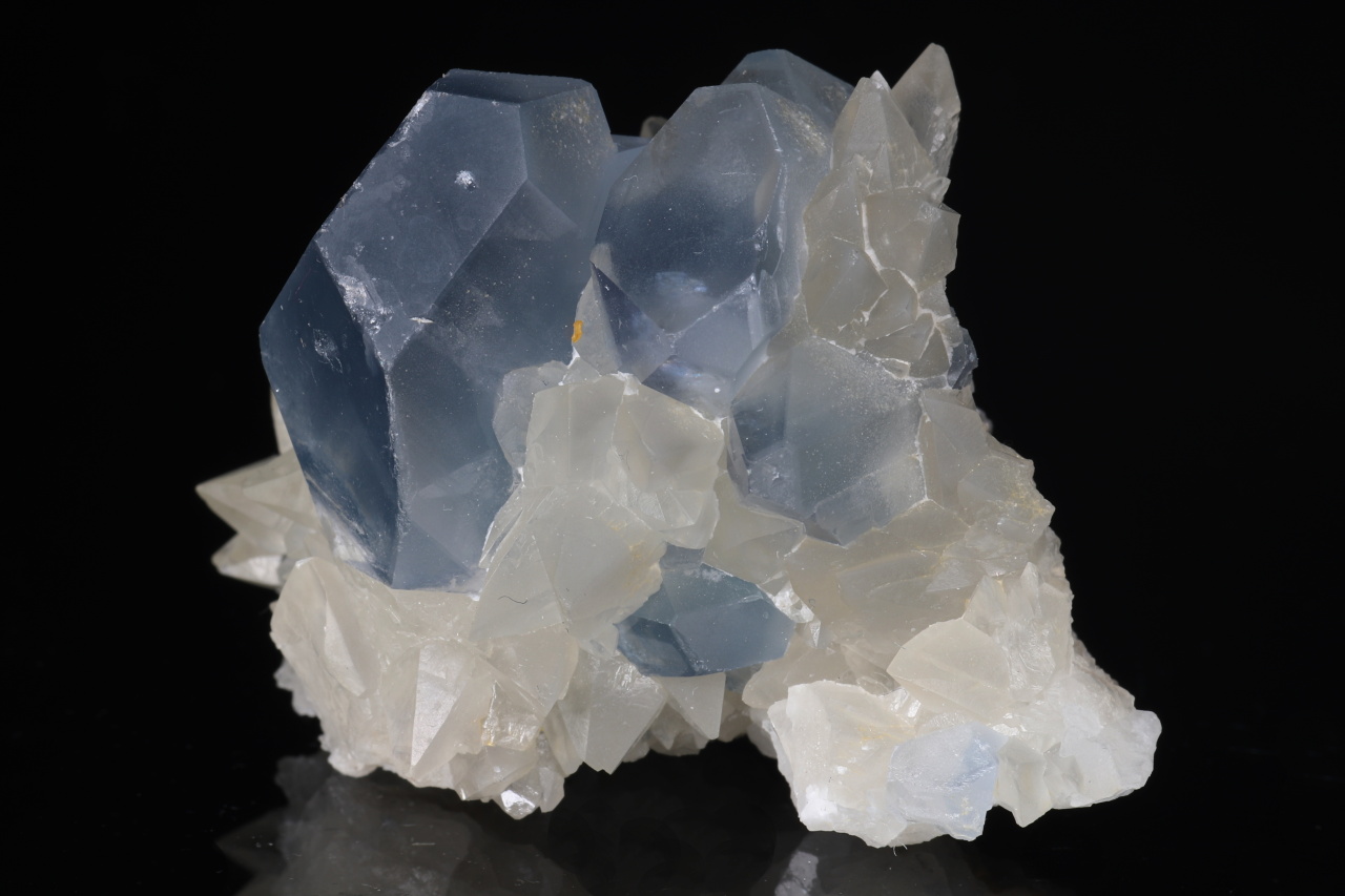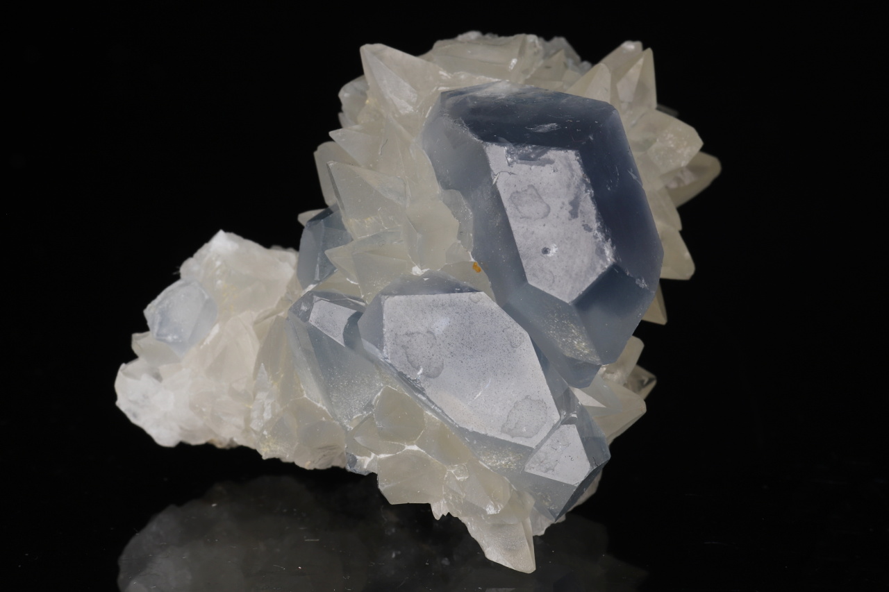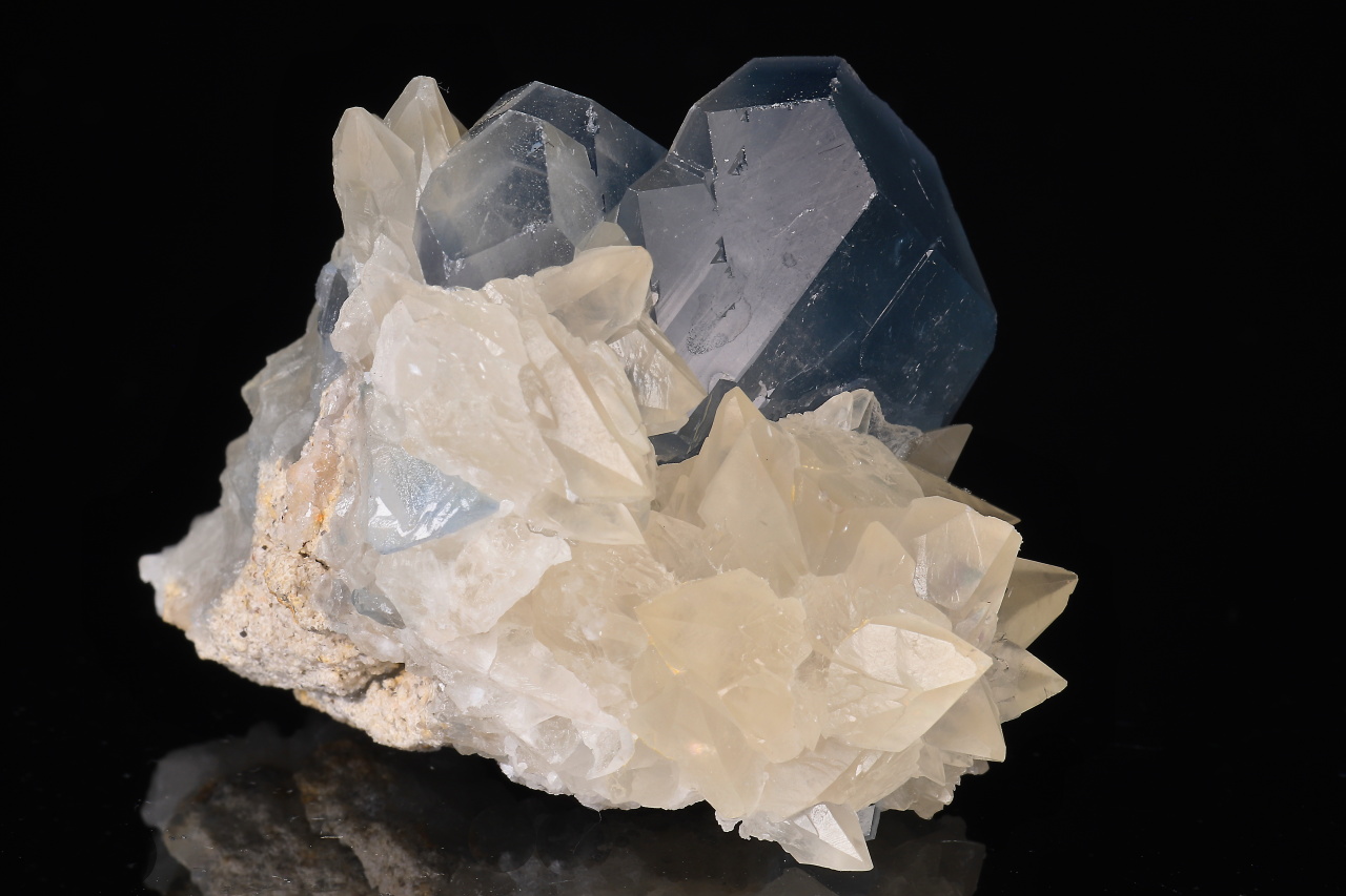 Kontrastní estetický menší vzorek dominantního sytě modrého 22 mm velkého krystalu celestýnu spolu se skalenoedry kalcitu. Velmi pěkná ukázka celestýnu z relativně nových nálezů z Afghánistánu.
