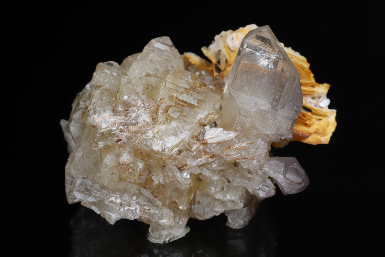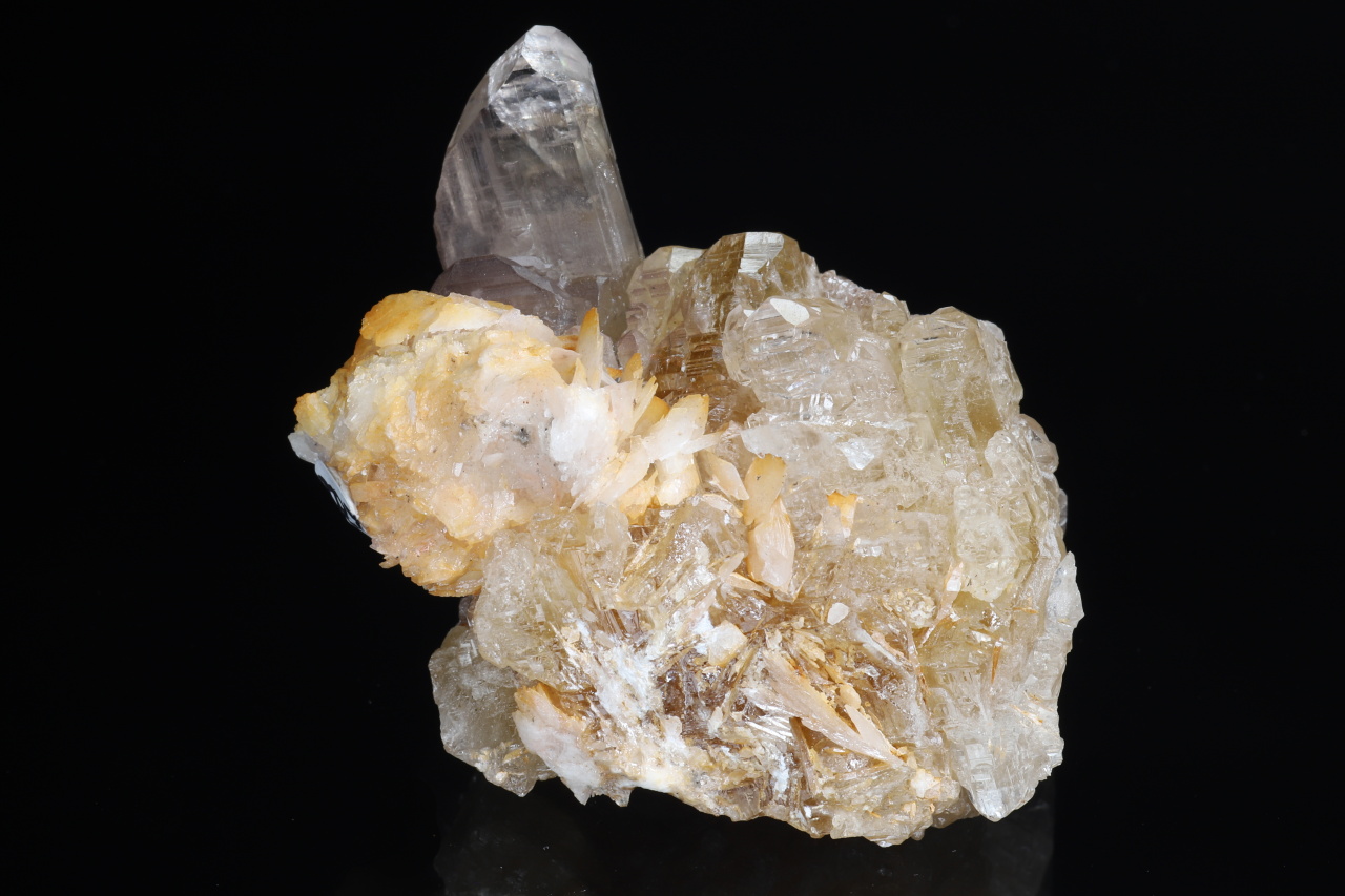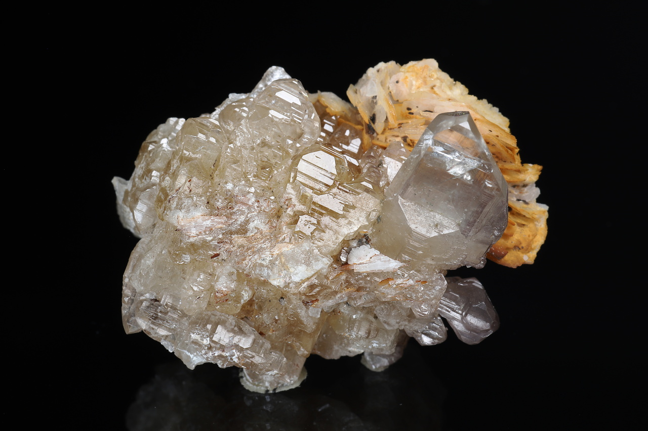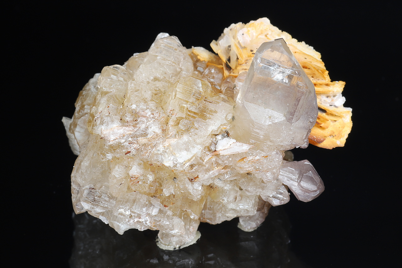 Sehr schöner Druse, der größtenteils aus beige bis bräunlich durchsichtigen, hochglänzenden Cerusit-Kristallen auf Baryt-Kristallen besteht. Sammlerstufe aus dem klassischen marokkanischen Fundort Mibladen .