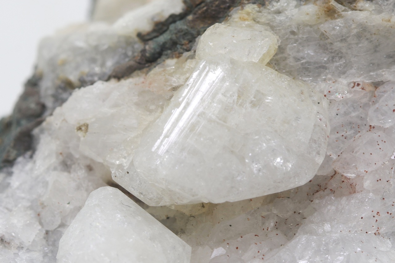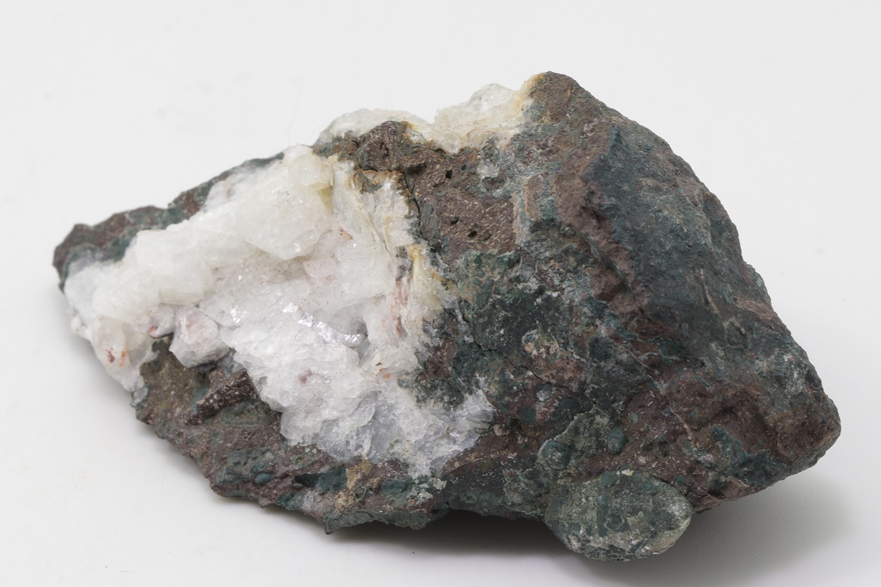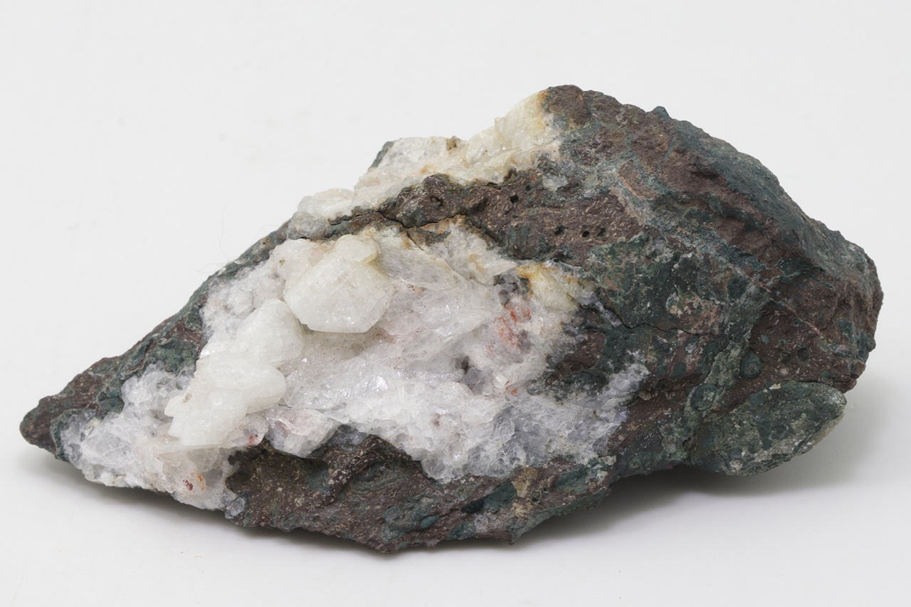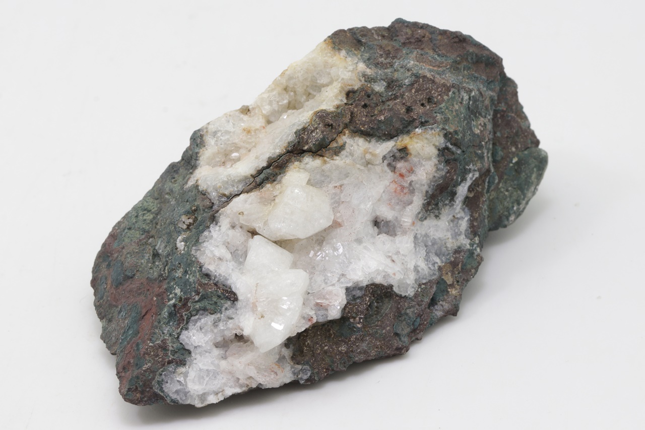 Glänzende, weiße Chabazit-Kristalle bis zu 10 mm Größe, gewachsen in einer Höhle des Melaphyrs.