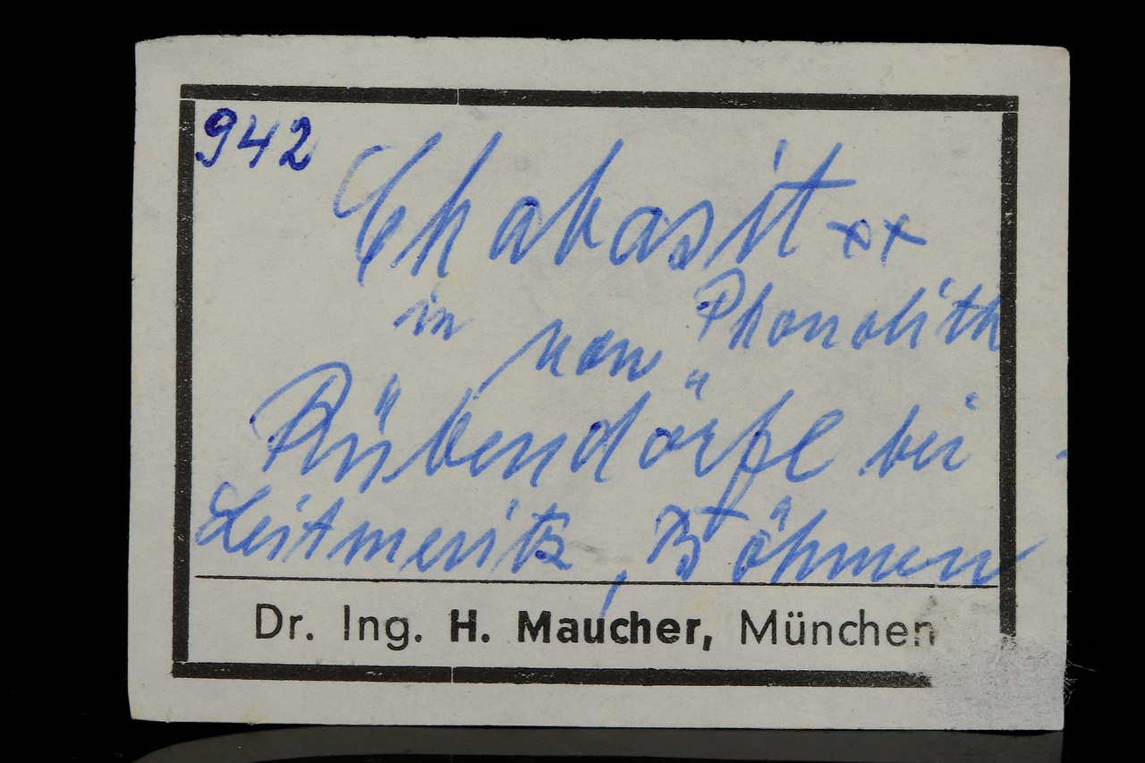 Historische Stufe von weißen, glänzenden Chabasit-Kristallen bis zu 5 mm Größe.
