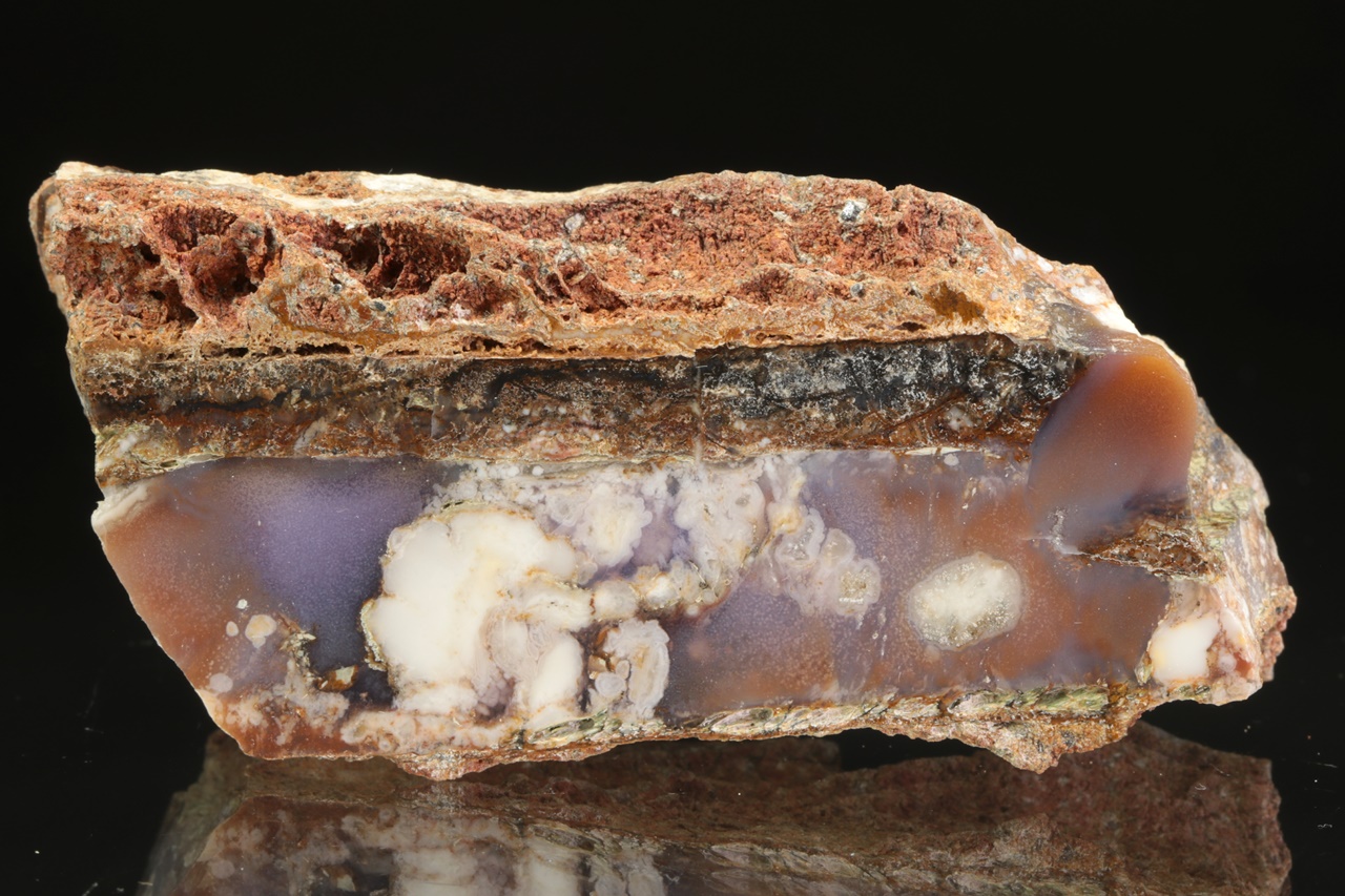 Leštěný vzorek světle fialového, lehce průsvitného chalcedonu s bílými skvrnami.
