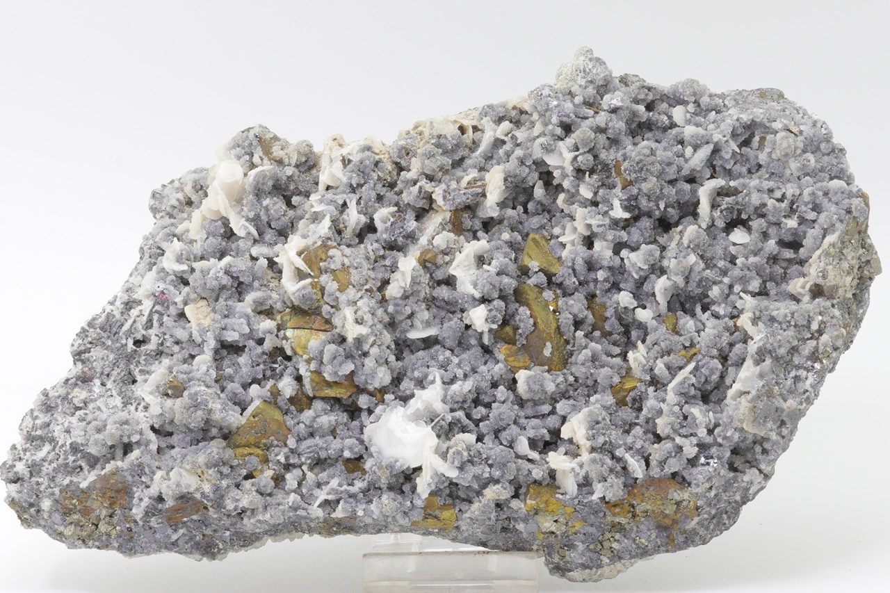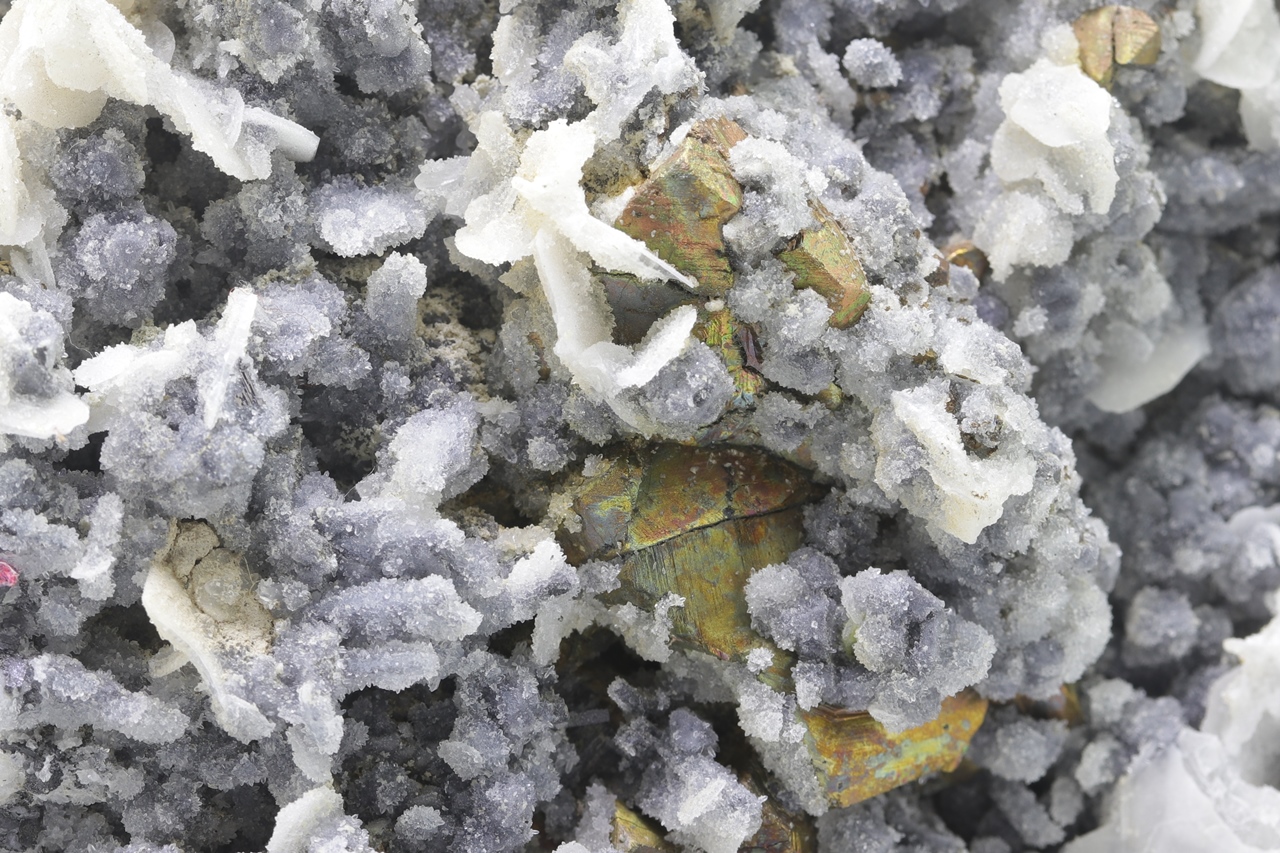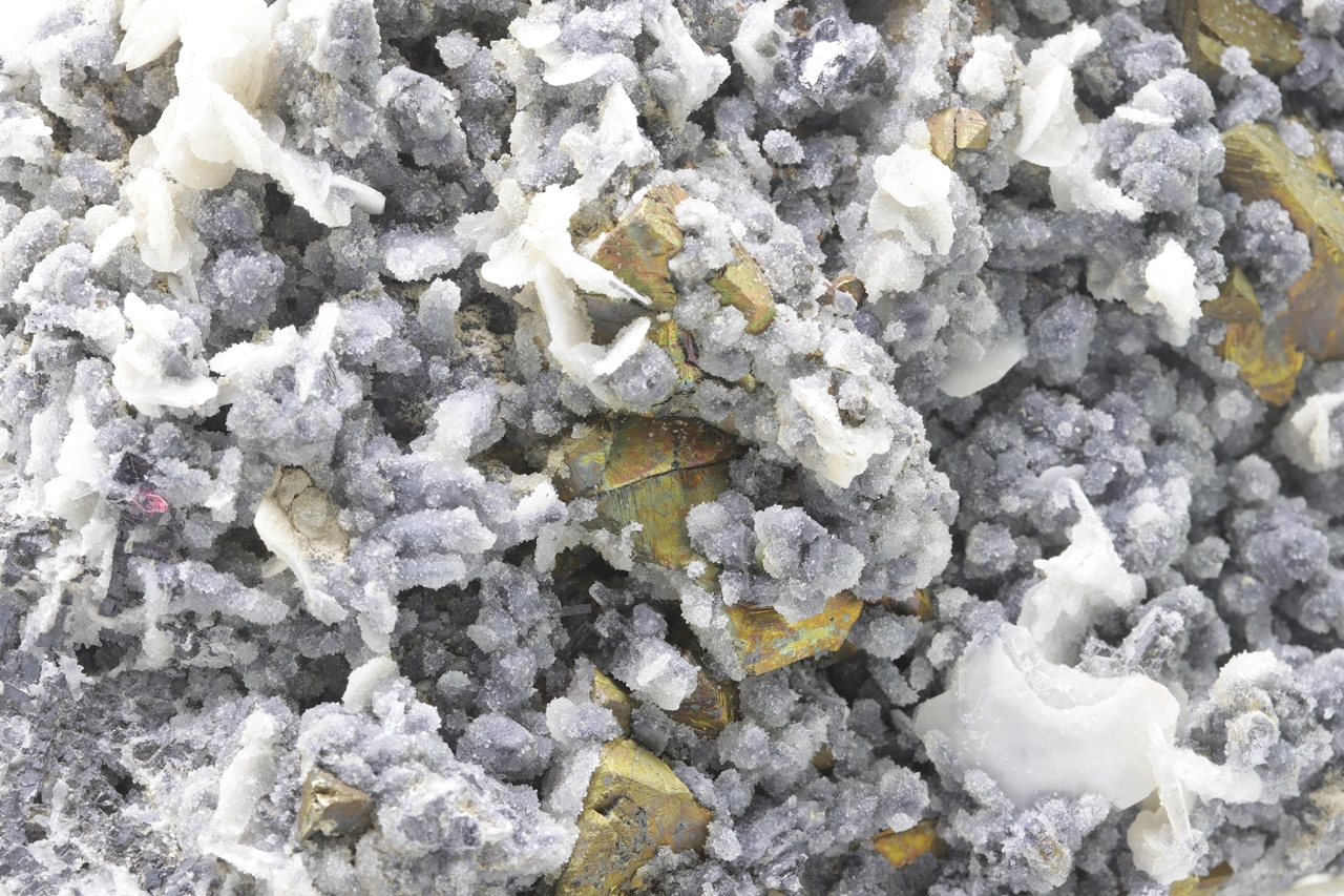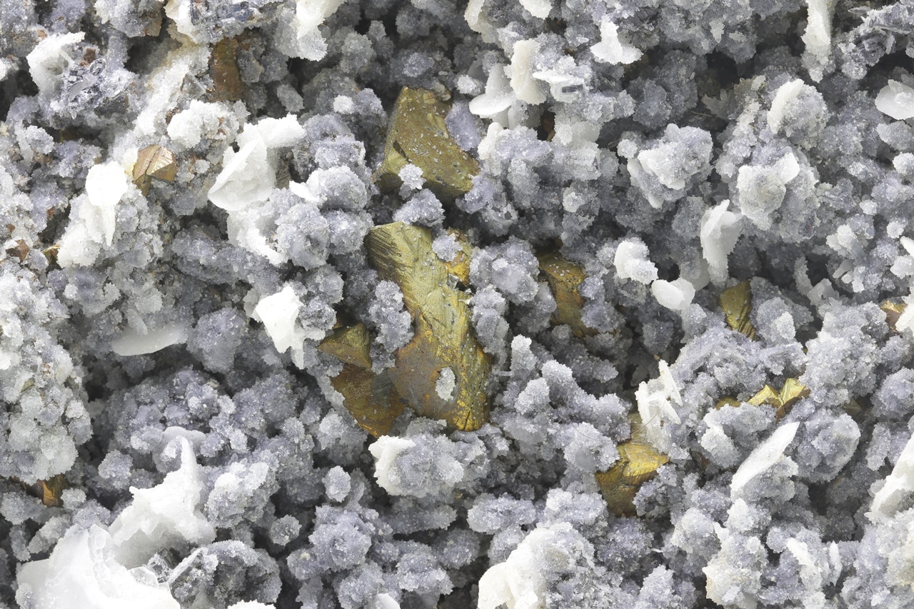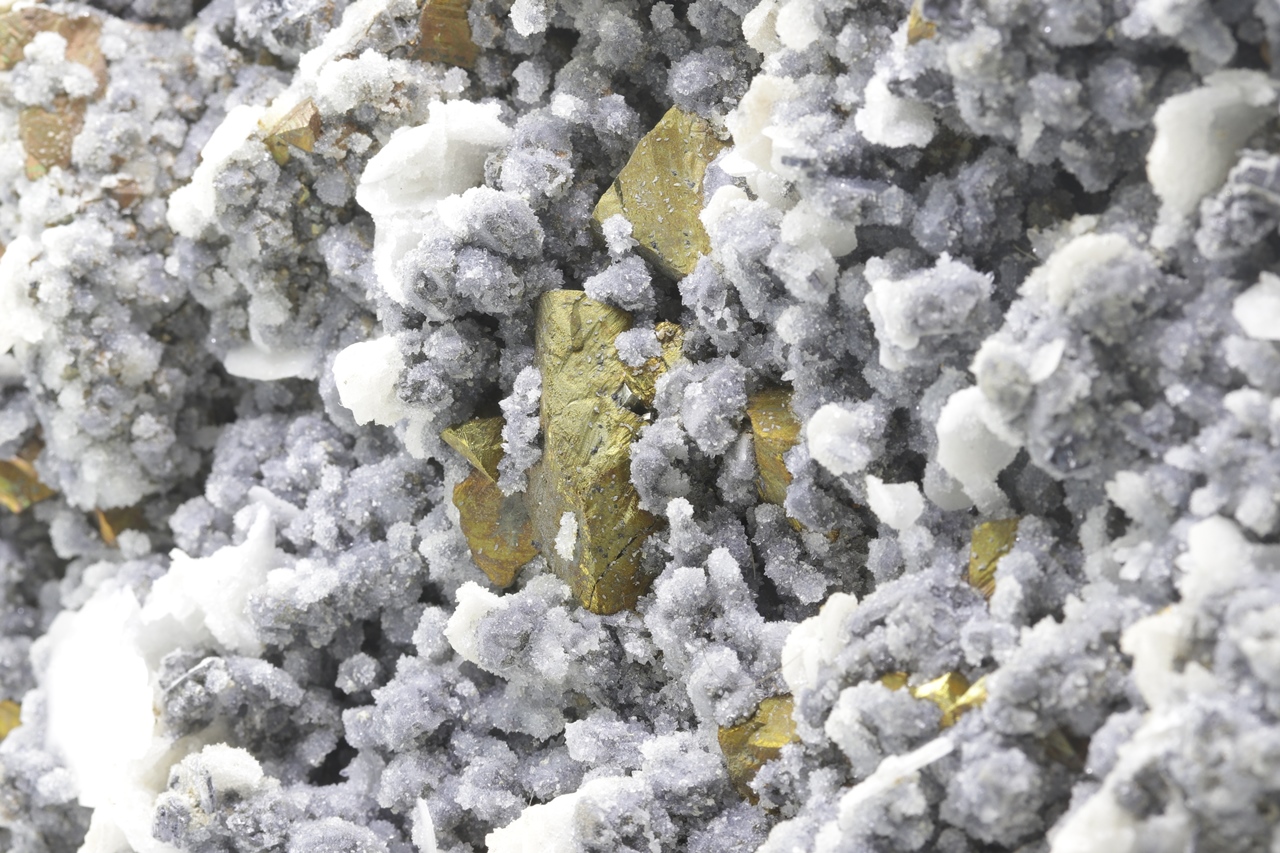 Druse von goldfarbenem Chalkopyrit überwachsen mit feinem grauem Quarz und Tafeln von weißem Baryt.