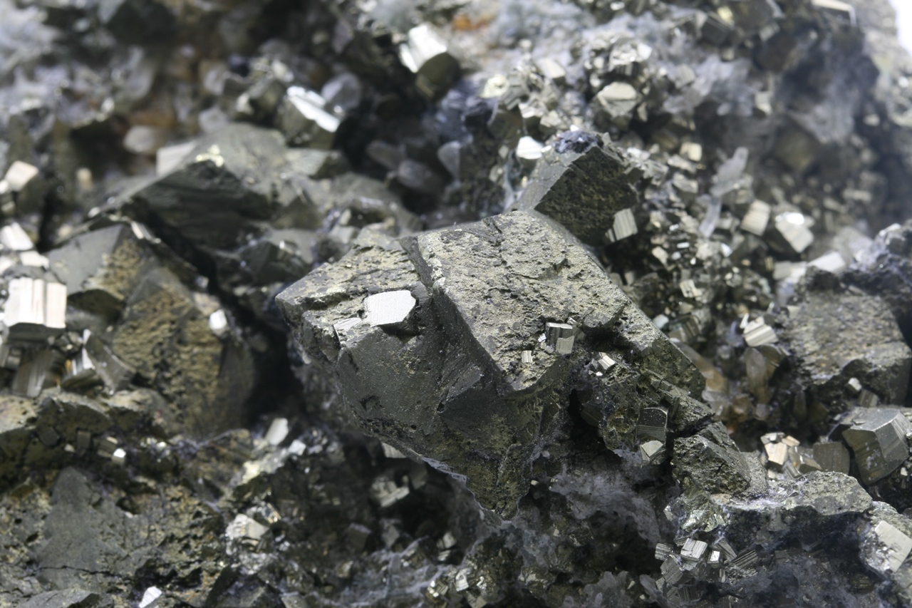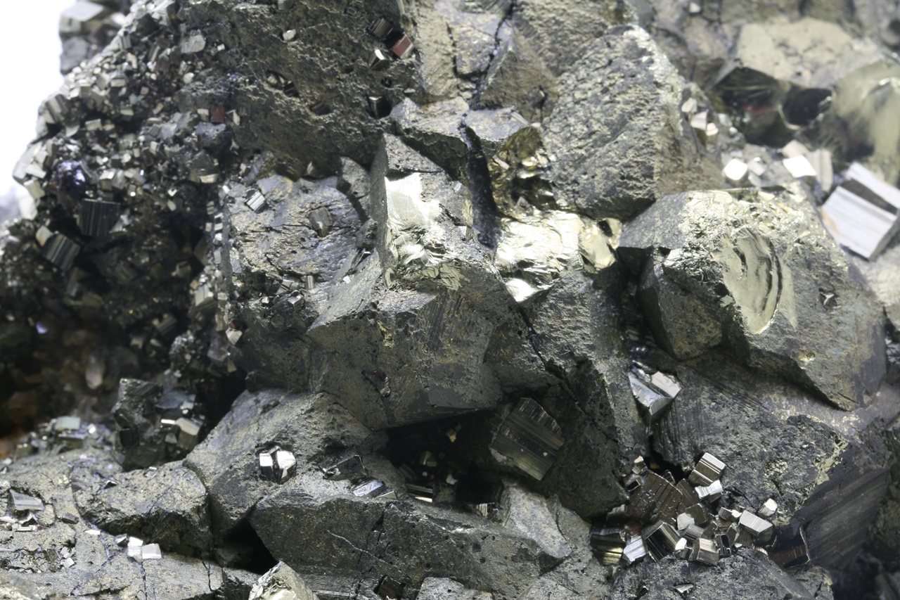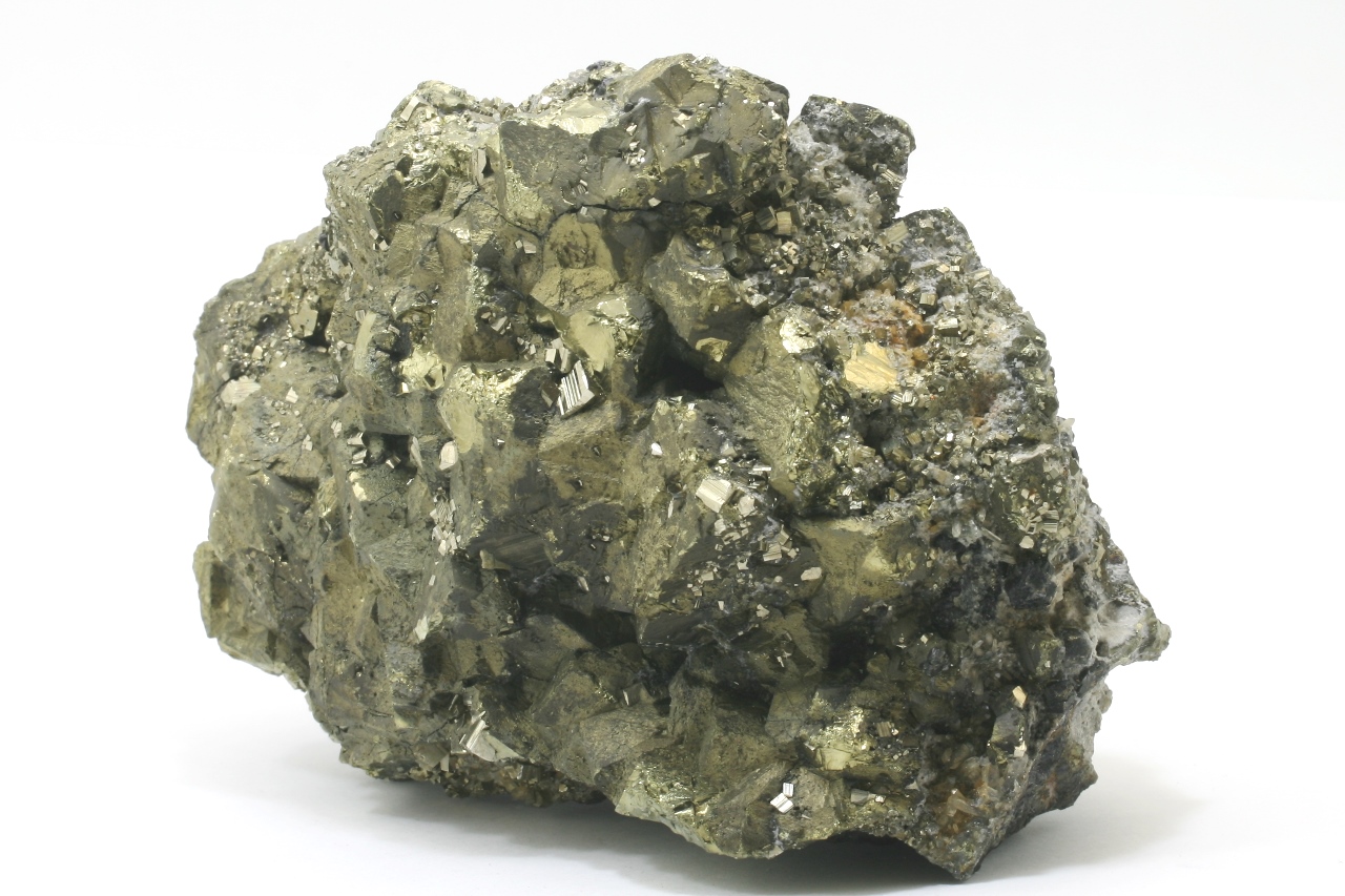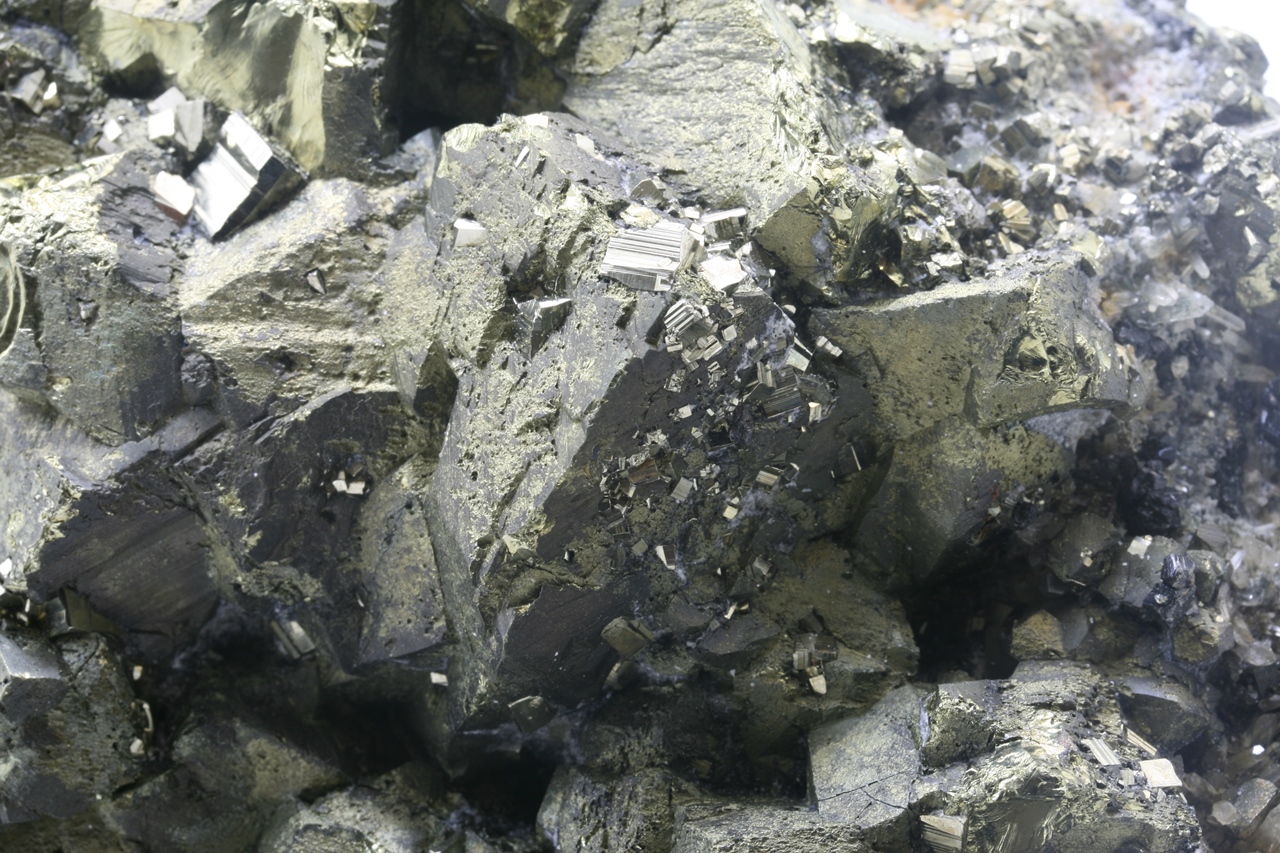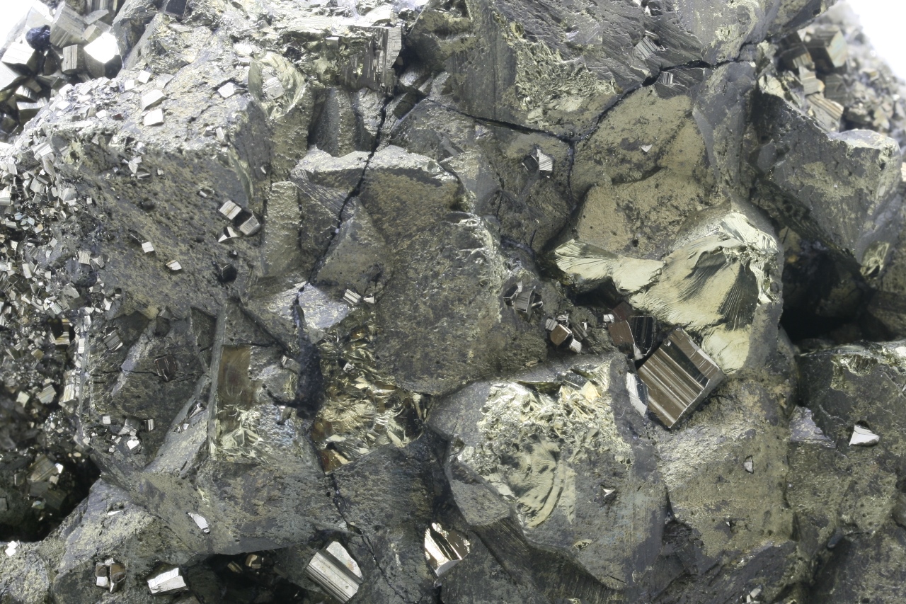 Eine prachtvolle Probe großer Chalkopyrit-Kristalle, die mit kleineren Würfeln von glänzendem Pyrit bewachsen sind. Obwohl zwei Kristalle in der Mitte der Probe beschädigt sind, handelt es sich um ein außergewöhnlich hochwertiges Exemplar.
