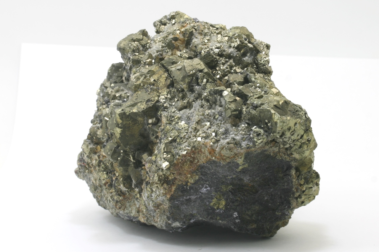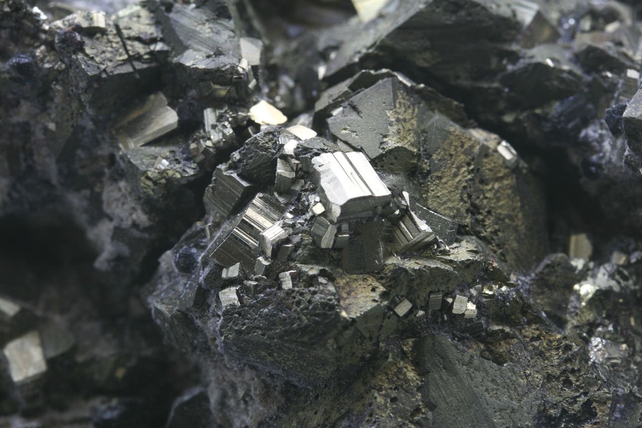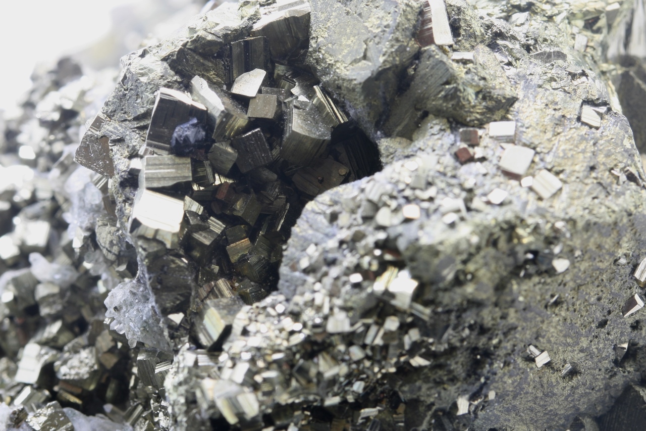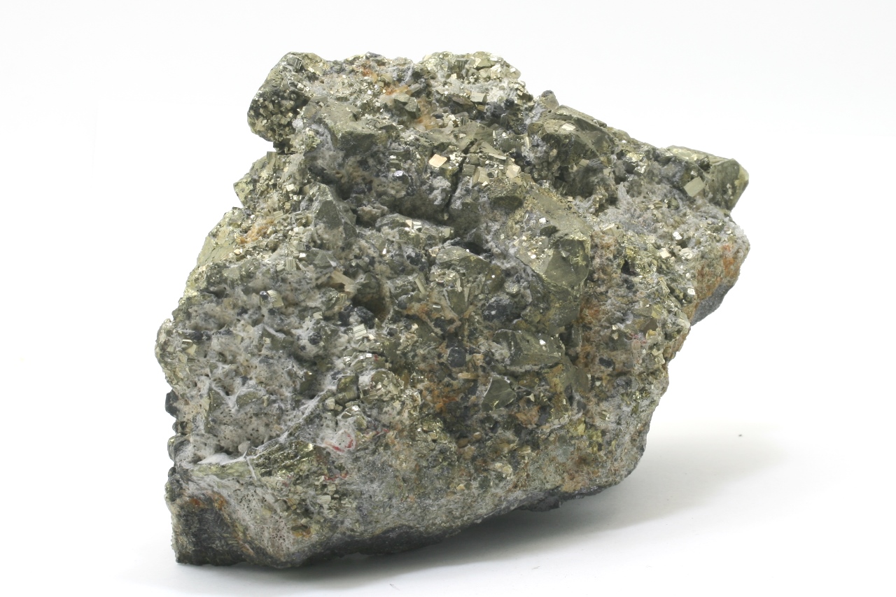 Eine prachtvolle Probe großer Chalkopyrit-Kristalle, die mit kleineren Würfeln von glänzendem Pyrit bewachsen sind. Obwohl zwei Kristalle in der Mitte der Probe beschädigt sind, handelt es sich um ein außergewöhnlich hochwertiges Exemplar.