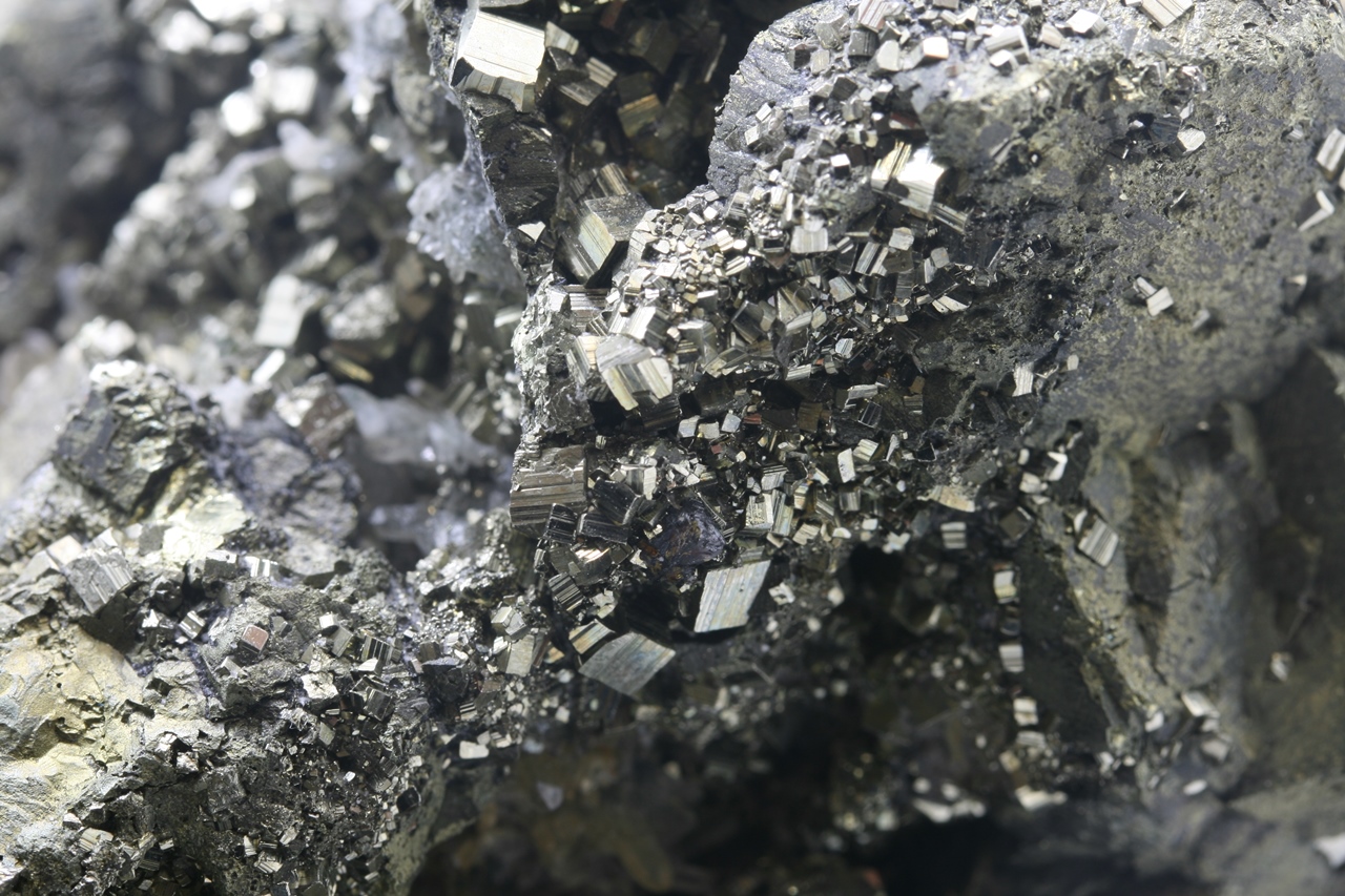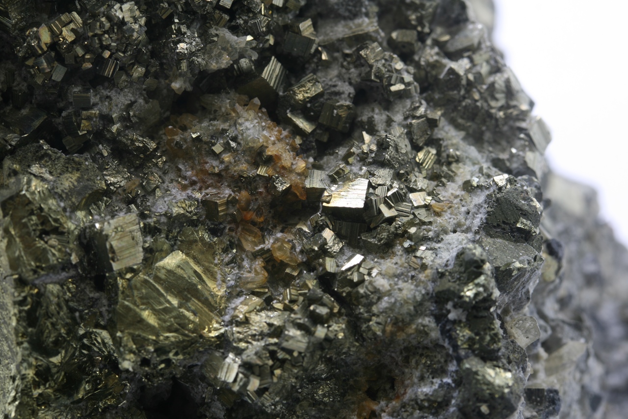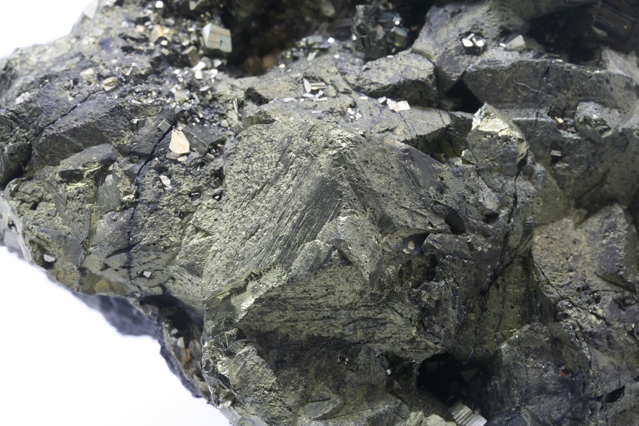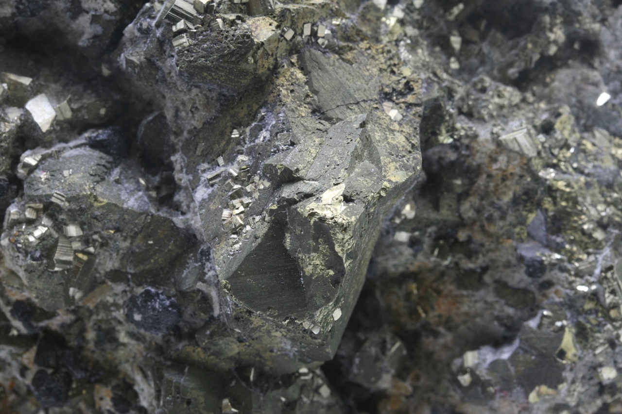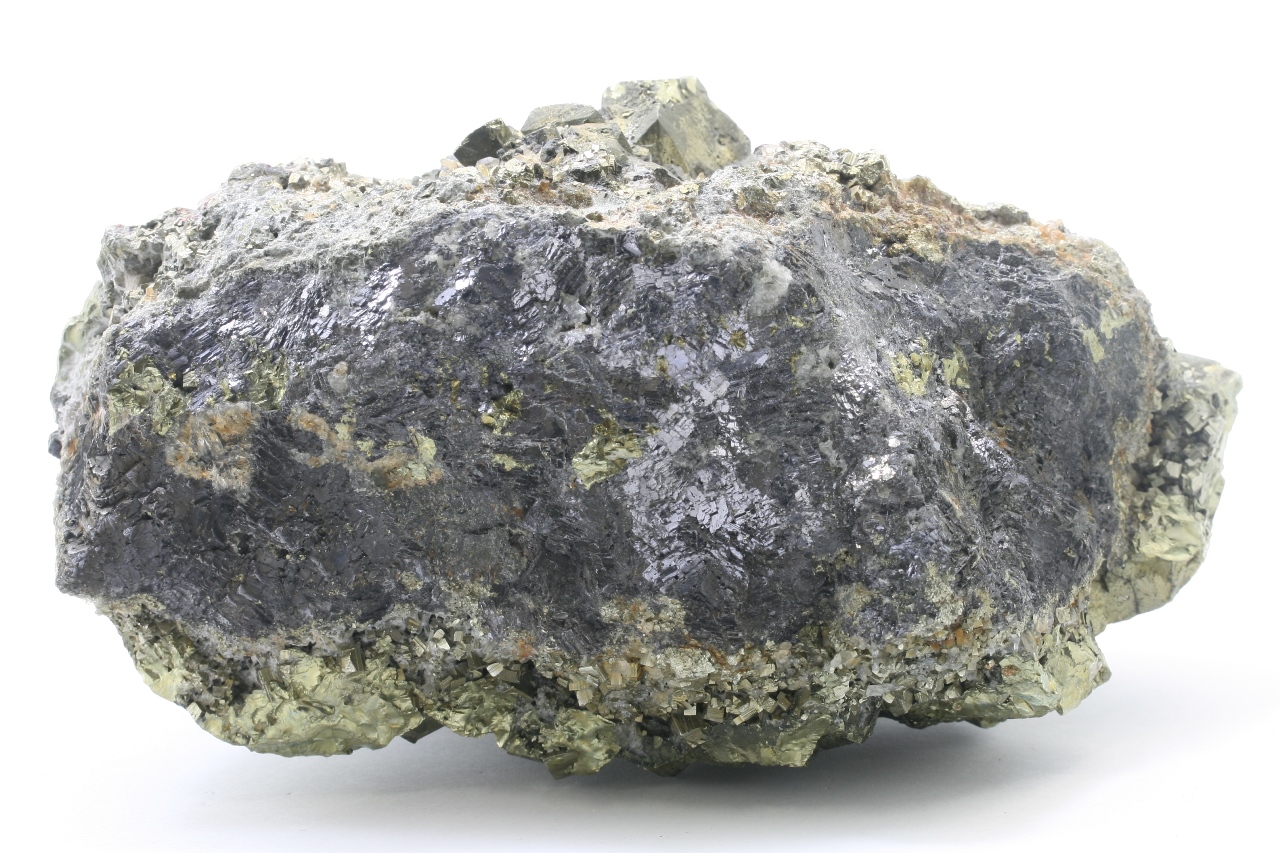 Eine prachtvolle Probe großer Chalkopyrit-Kristalle, die mit kleineren Würfeln von glänzendem Pyrit bewachsen sind. Obwohl zwei Kristalle in der Mitte der Probe beschädigt sind, handelt es sich um ein außergewöhnlich hochwertiges Exemplar.