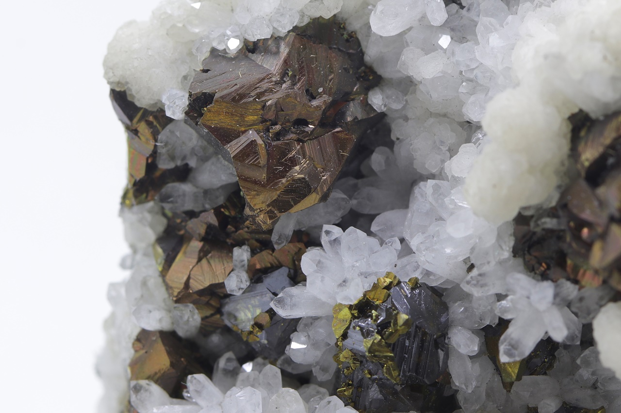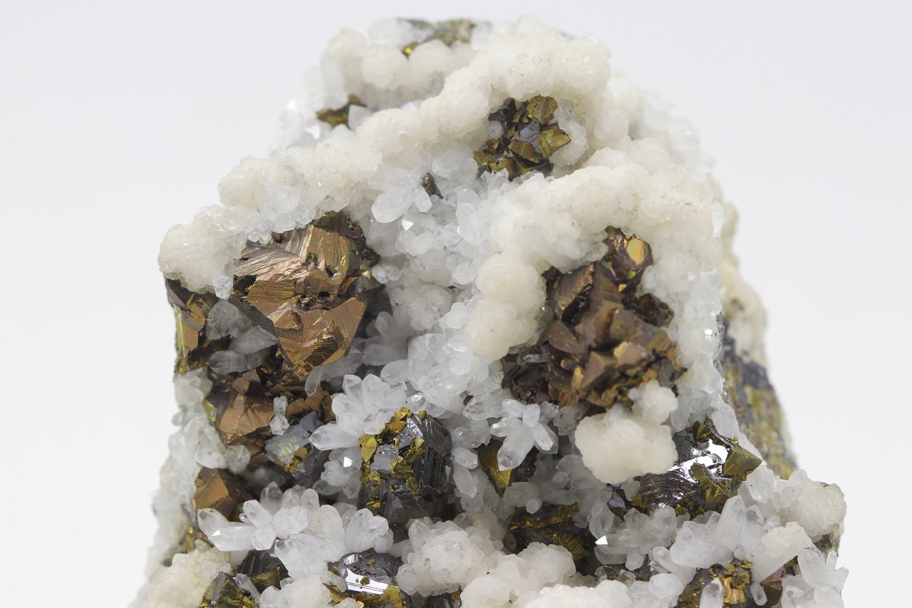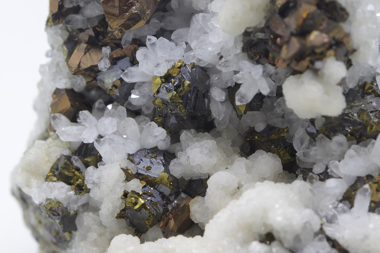 Srostlice kovově lesklých bronzových krystalů chalkopyritu s černými krystaly sfaleritu porostlými drobným zlatým pyritem. Asociaci doplňují krystaly čirého křemene a bílých agregátu kalcitu.