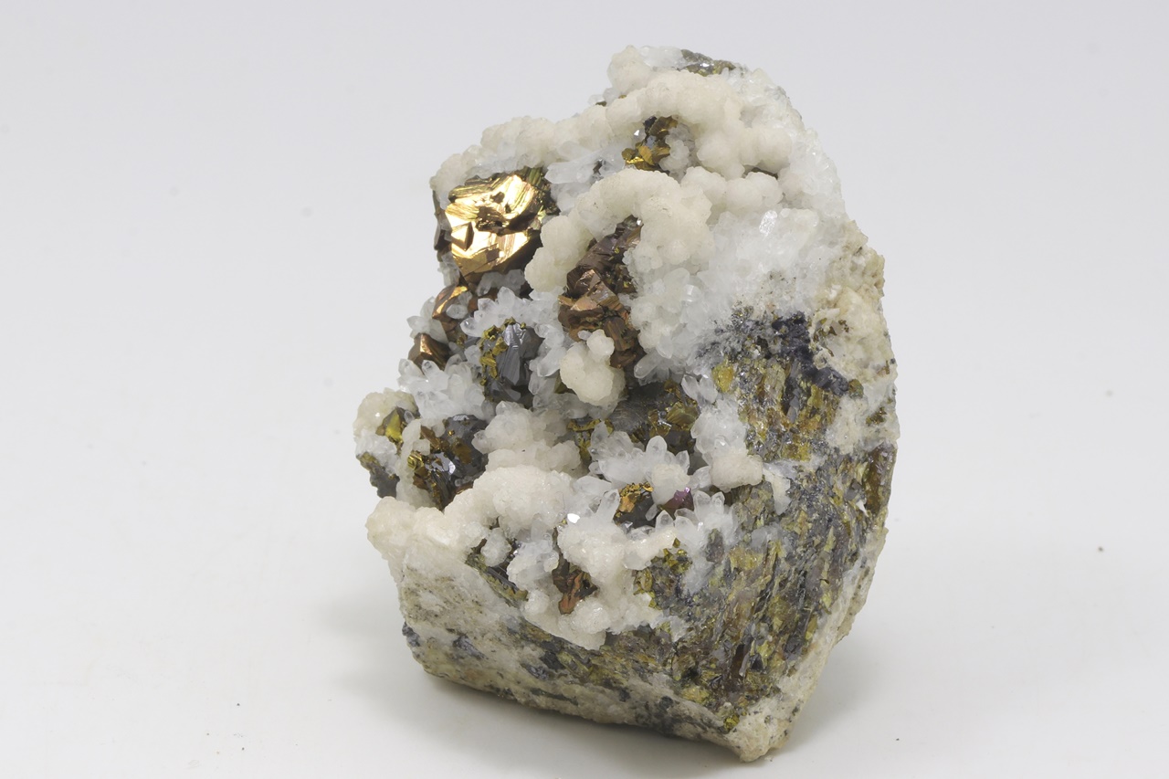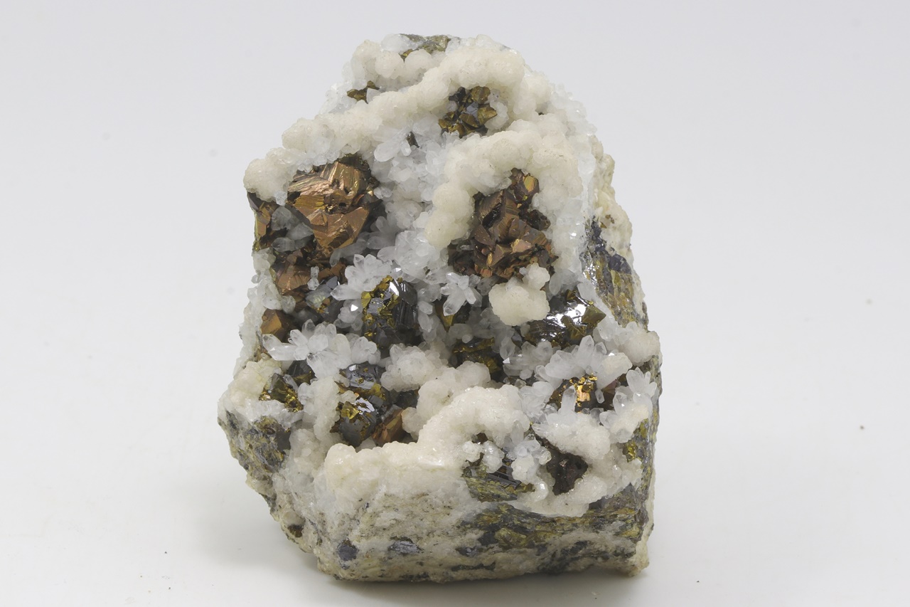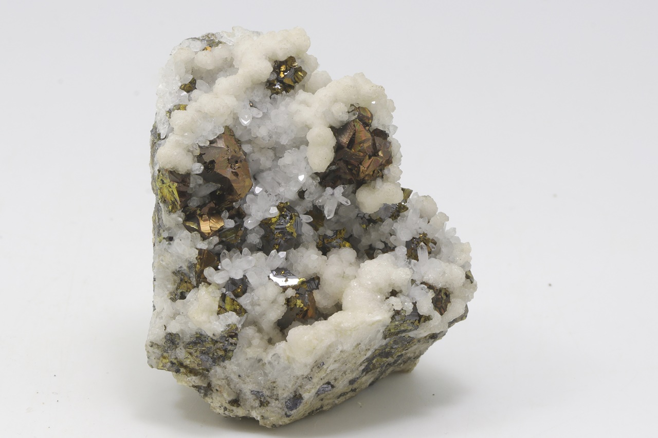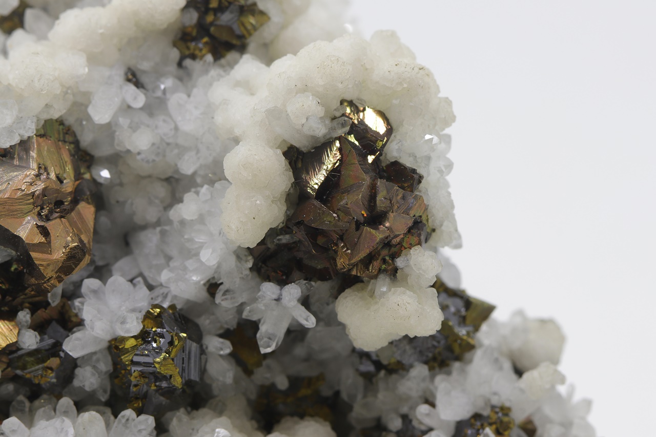 Srostlice kovově lesklých bronzových krystalů chalkopyritu s černými krystaly sfaleritu porostlými drobným zlatým pyritem. Asociaci doplňují krystaly čirého křemene a bílých agregátu kalcitu.
