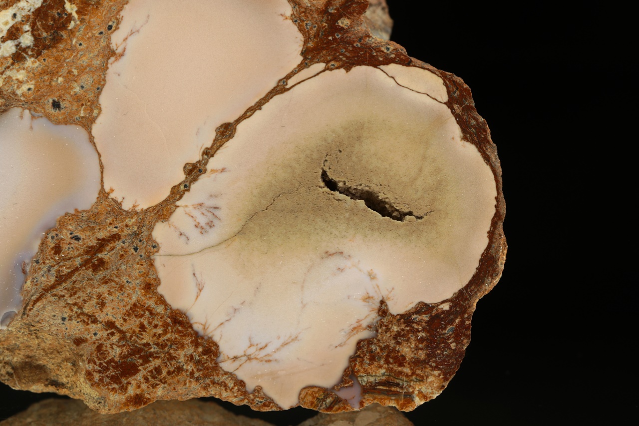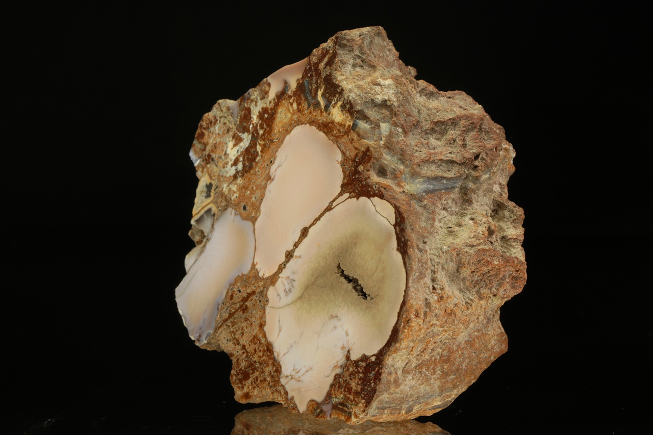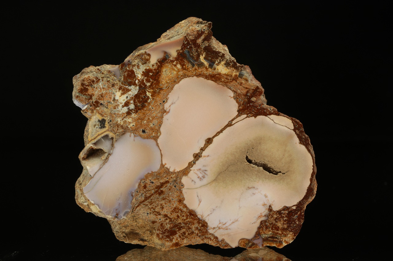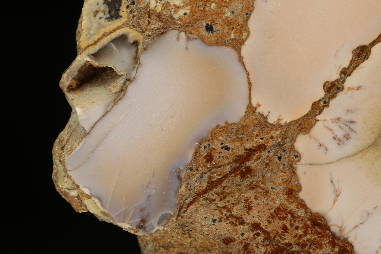 Polierter Probe von hellbeigem Chalcedon mit violetten Tönen.