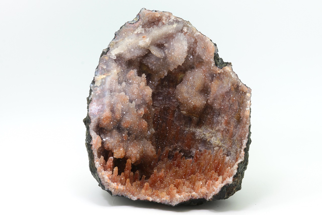 Wunderschöne offene Geode, gefüllt mit Chalcedon, auf dem Quarz-Kristalle gewachsen sind. Im unteren Teil befindet sich ein Wald aus Stalaktiten bis zu 3 cm groß.