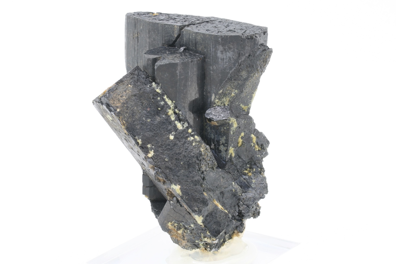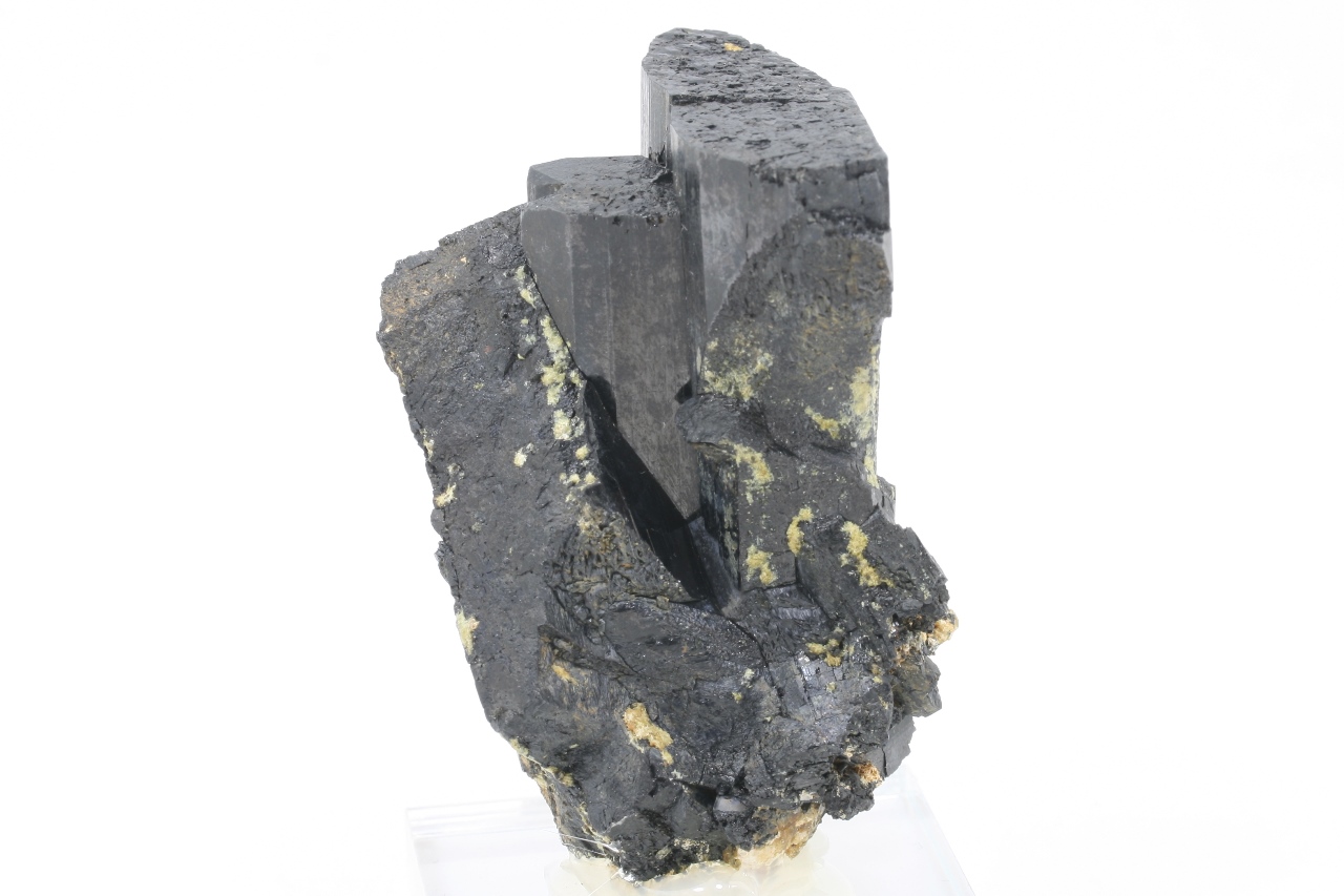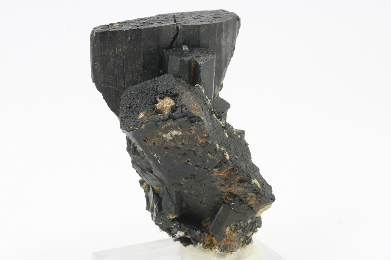 Cluster großer, gut definierter, schwarzer Kristalle eines seltenen Silikats aus Fe, Mg, Ti und seltenen Erden.
