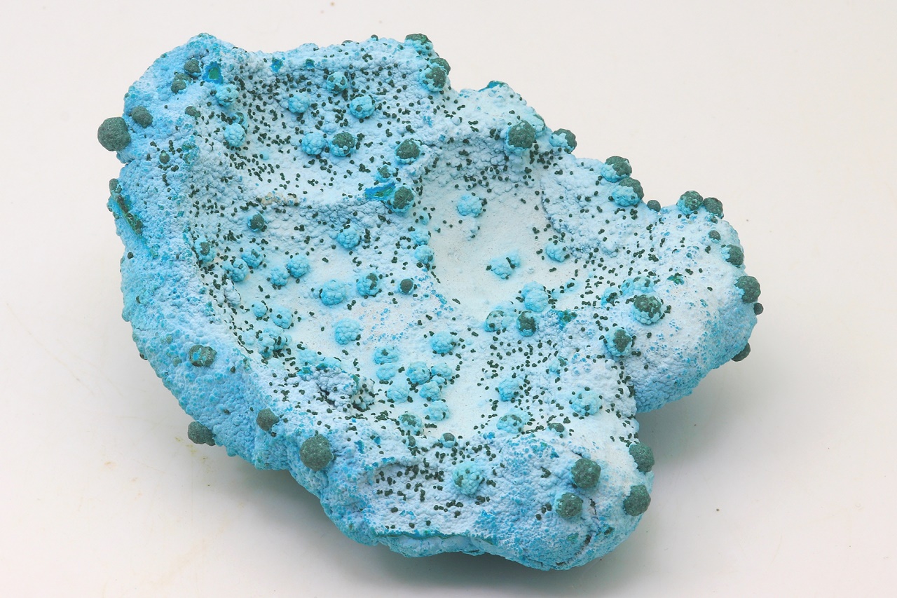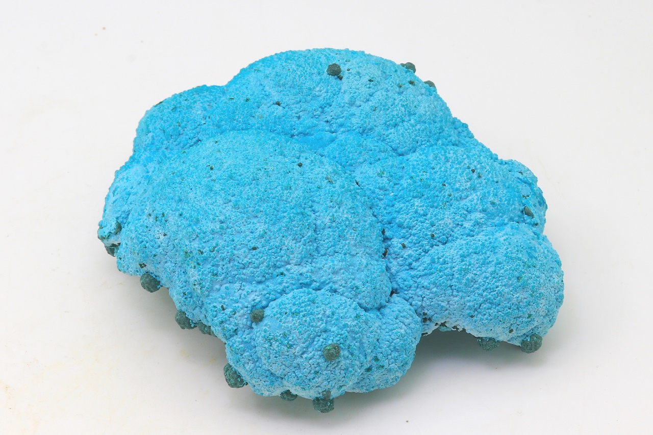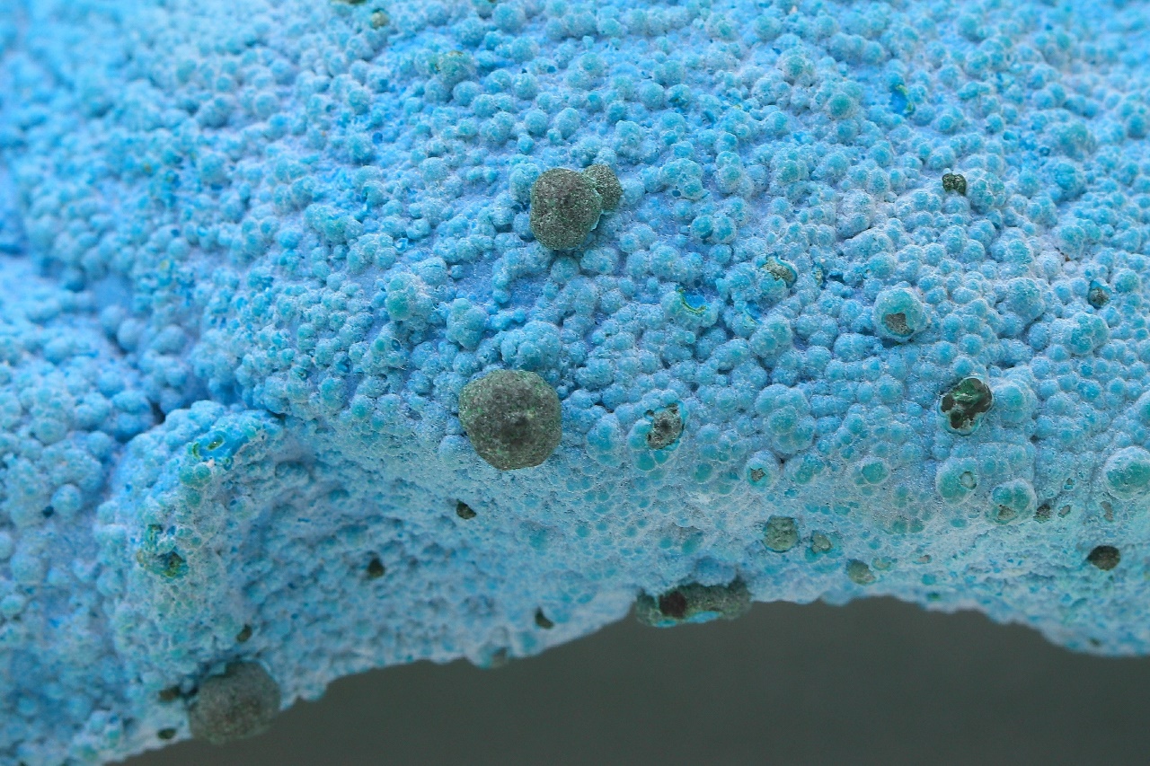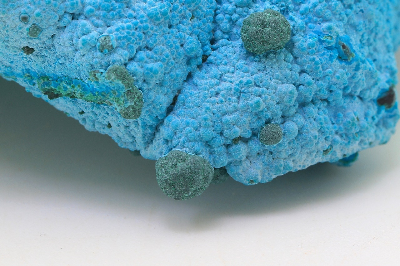 Wunderschön blauer Chrysokoll von weltweiter Qualität, der nierenförmige Aggregate bildet, die mit ca. 1 mm großen kugelförmigen Aggregaten desselben Minerals und bis zu 5 mm großen Kugeln aus Malachit bedeckt sind. Die Probe ist stabilisiert, daher verliert sie mit der Zeit kein Wasser und somit auch keine Farbe.