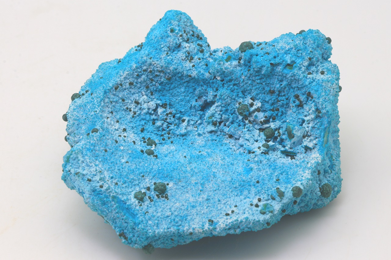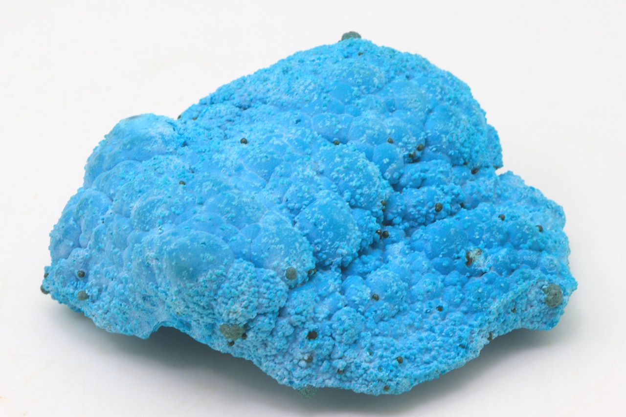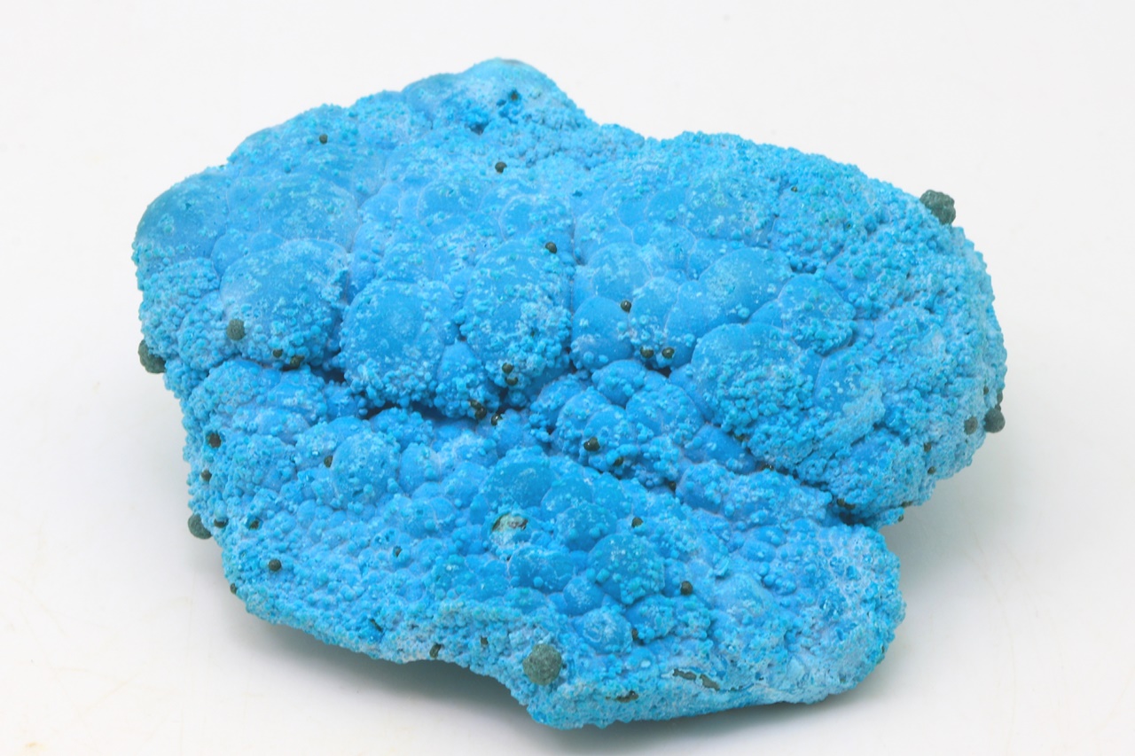 Wunderschöner blau Chrysokol von weltweiter Qualität bildet nierenförmige Aggregate, die mit etwa 1 mm großen kugelförmigen Aggregaten desselben Minerals und bis zu 4 mm großen Kugeln aus Malachit bedeckt sind. Die Probe ist stabilisiert, deshalb verliert sie im Laufe der Zeit kein Wasser und damit auch nicht die Farbe.