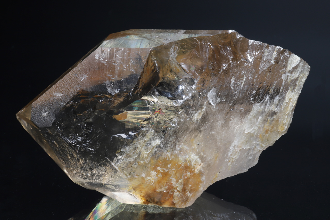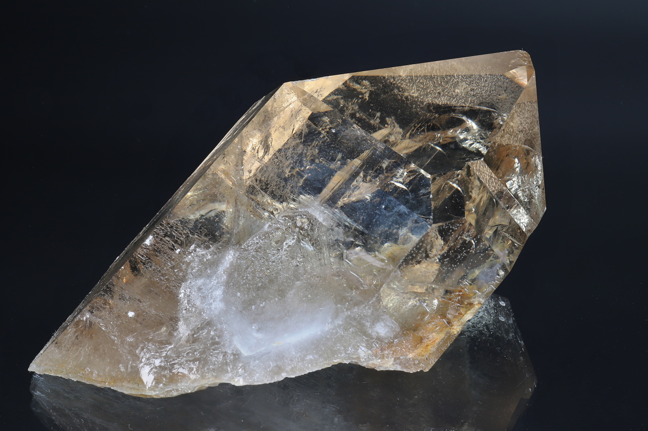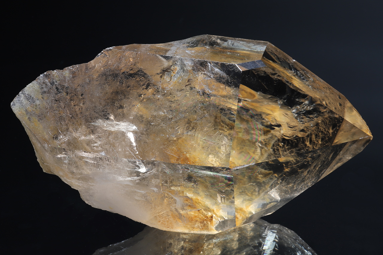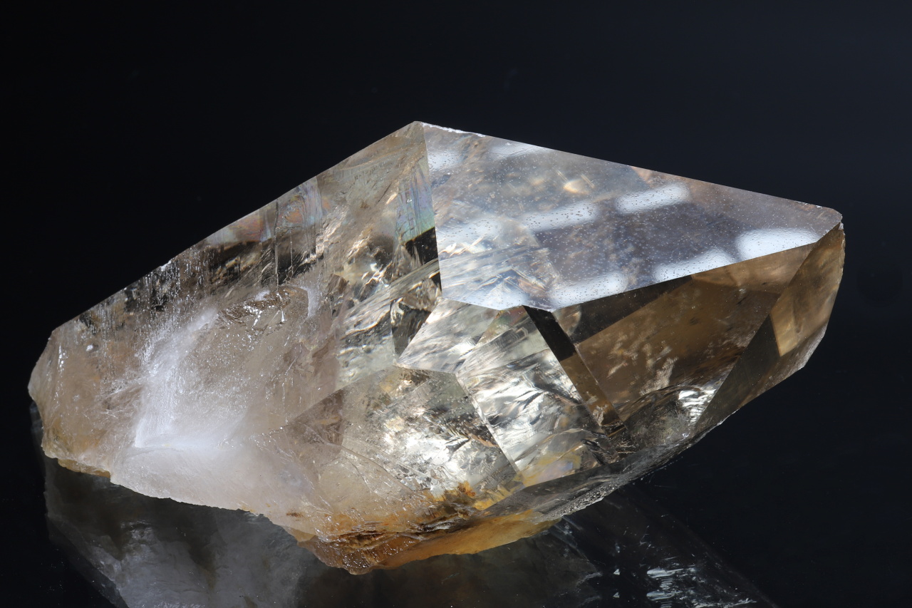 Freier, perfekt ausgebildeter, abgeflachter Kristall von sehr reinem Citrin. Der Kristall hat einige Beschädigungen bis zu 1 cm auf den Kristallflächen auf der Vorderseite.