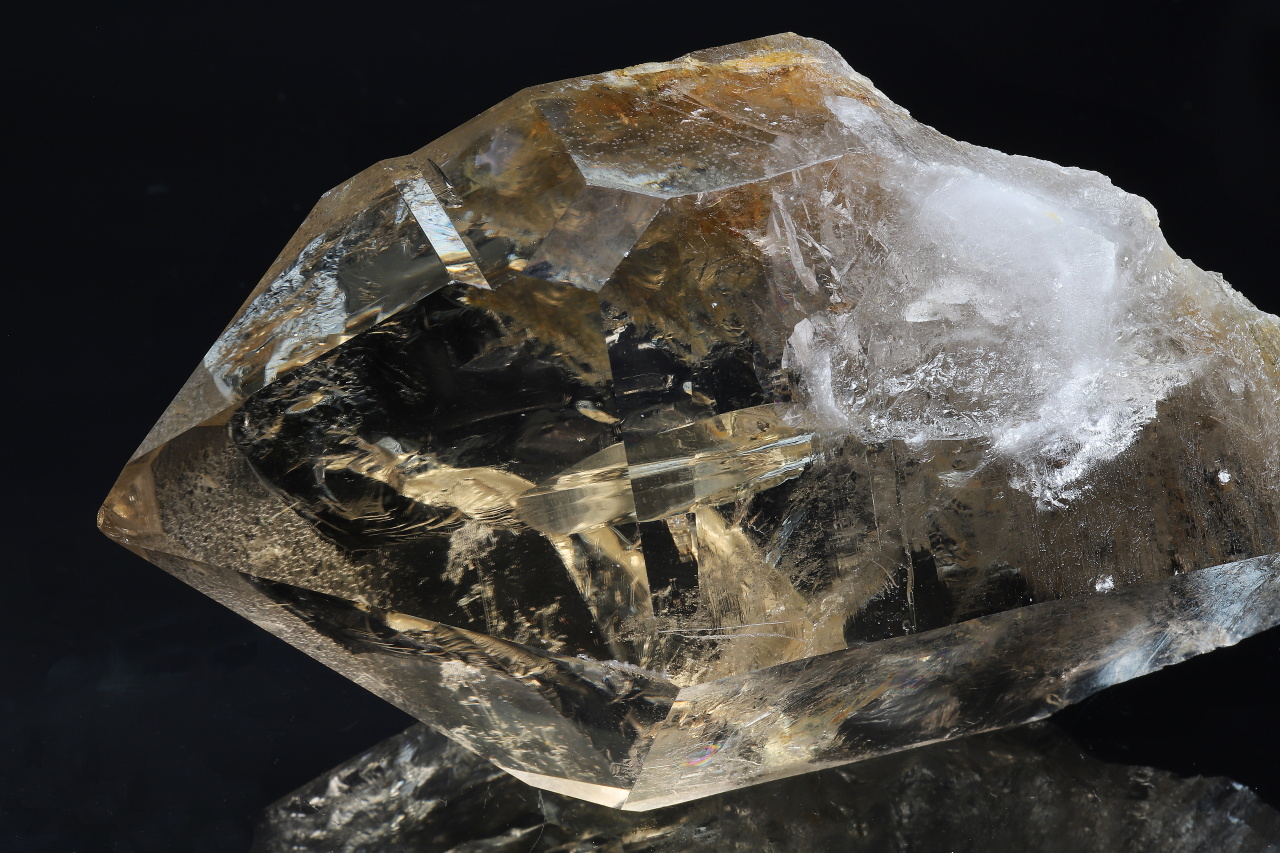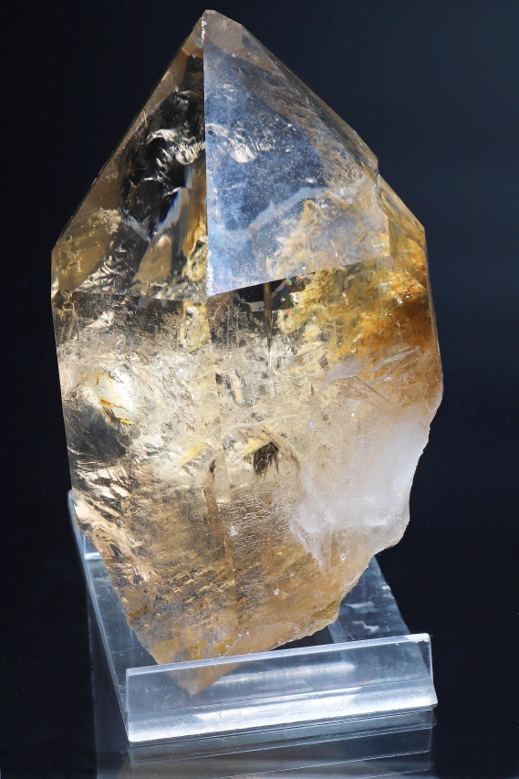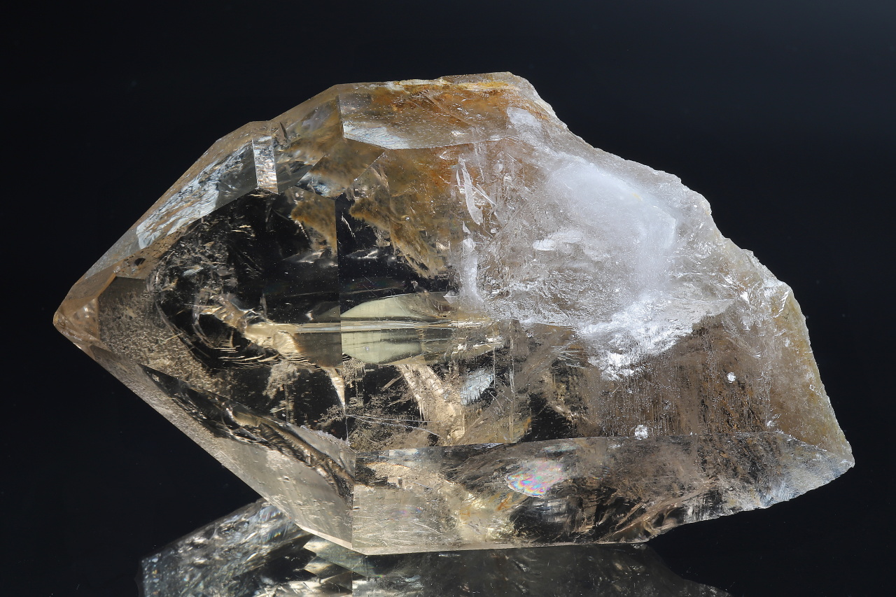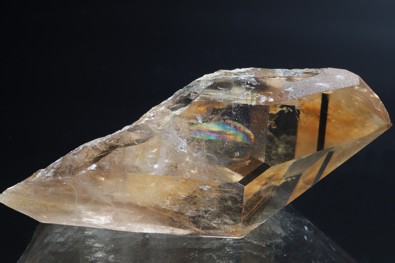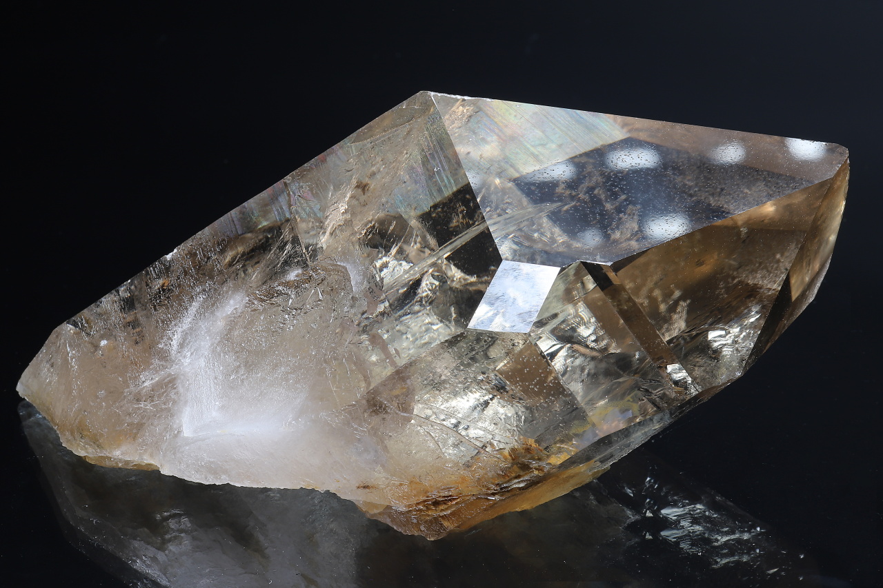 Freier, perfekt ausgebildeter, abgeflachter Kristall von sehr reinem Citrin. Der Kristall hat einige Beschädigungen bis zu 1 cm auf den Kristallflächen auf der Vorderseite.