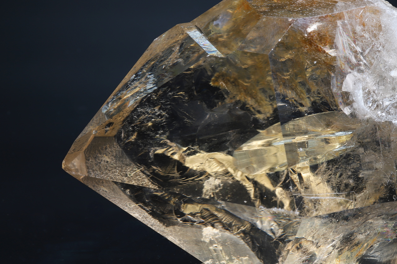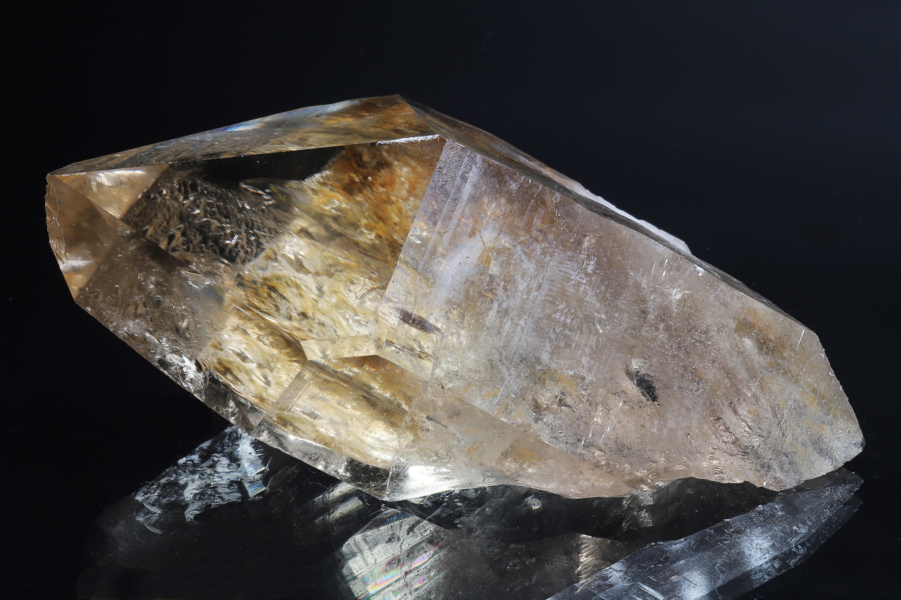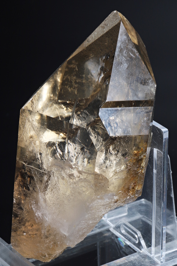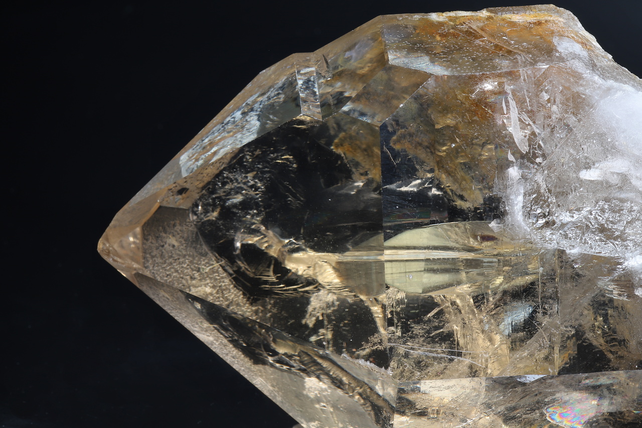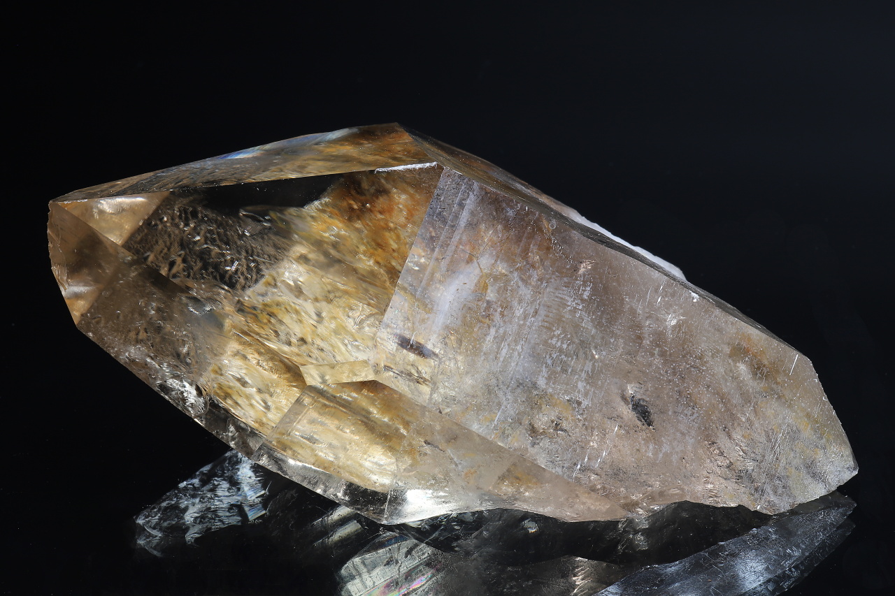 Freier, perfekt ausgebildeter, abgeflachter Kristall von sehr reinem Citrin. Der Kristall hat einige Beschädigungen bis zu 1 cm auf den Kristallflächen auf der Vorderseite.