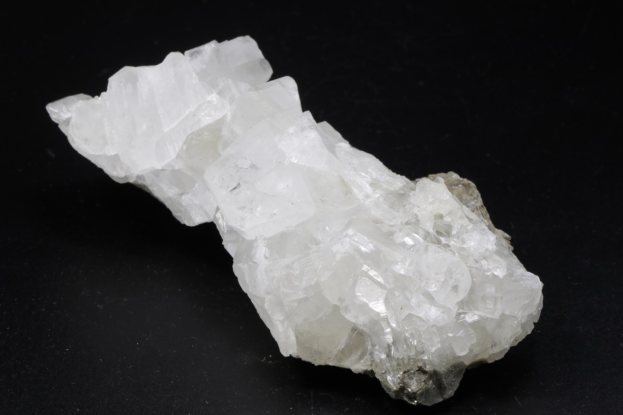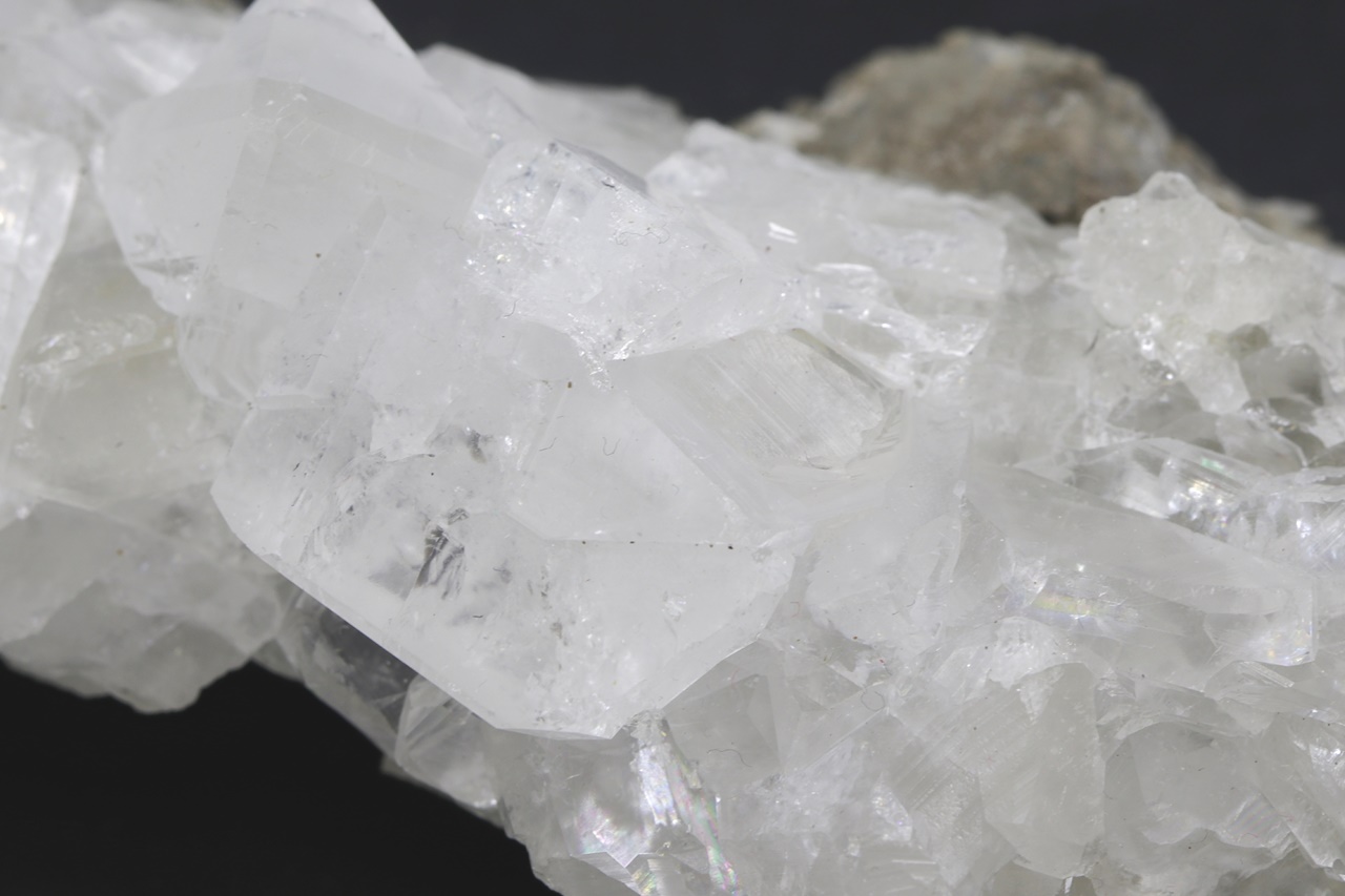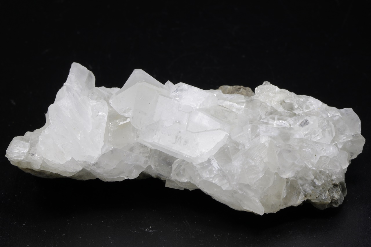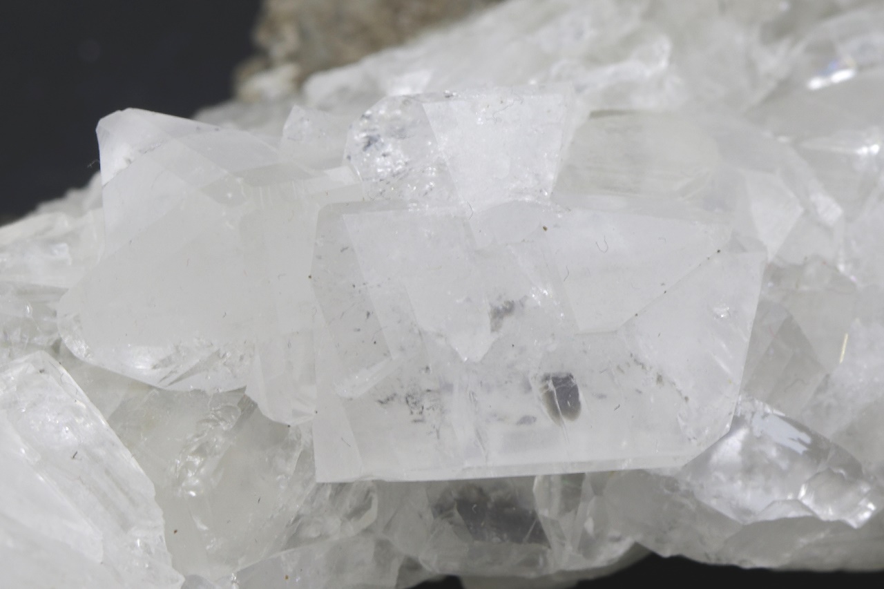 Druse klarer Kristalle eines seltenen Calciumborats. Der größte Kristall ist 23 mm groß.
