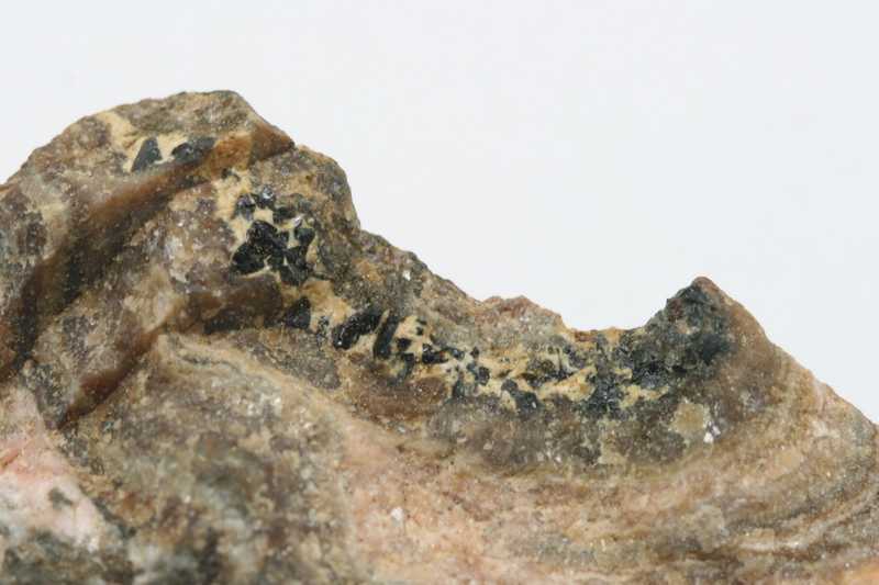 Kleine schwarze Körner aus Eisensilikat. Die Ader mit Cronstedtitem ist 2 mm breit【4:0†cz_to_de.json】.