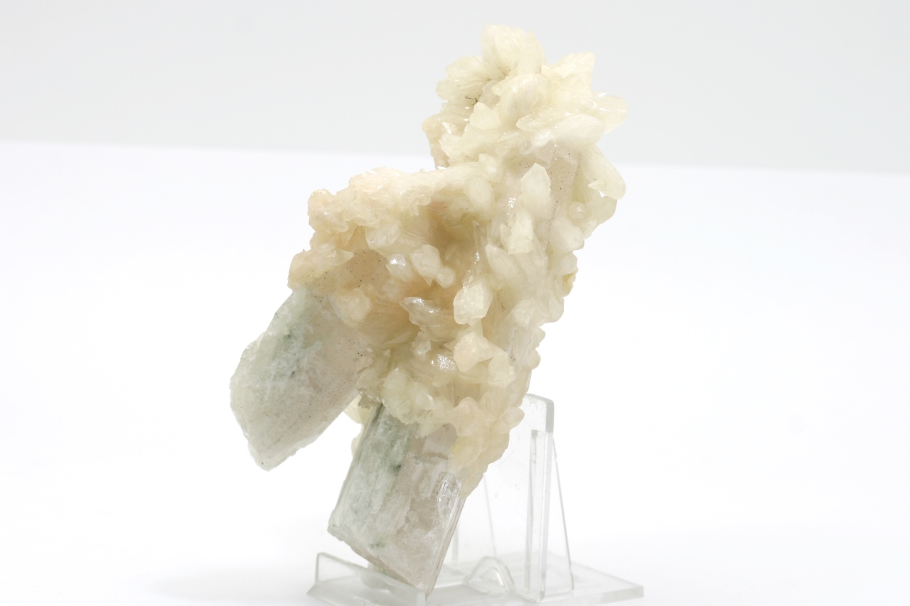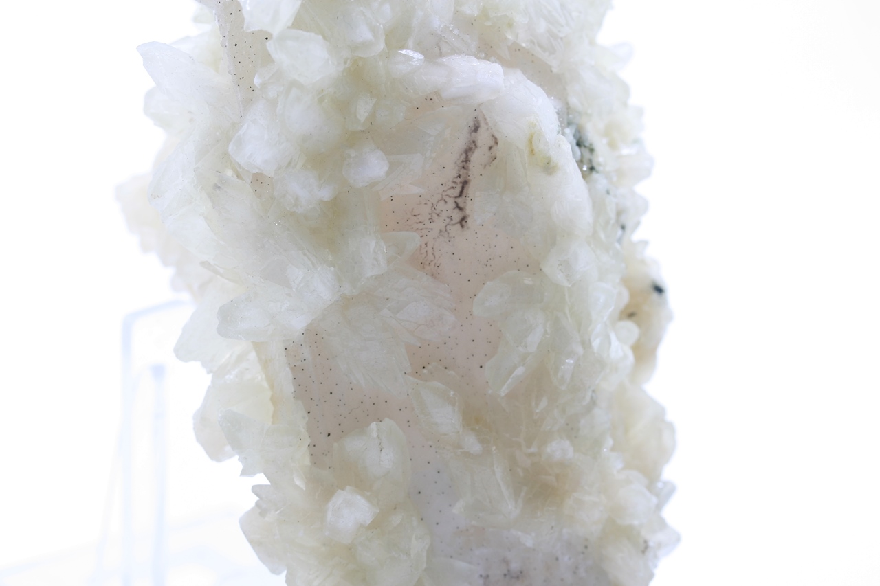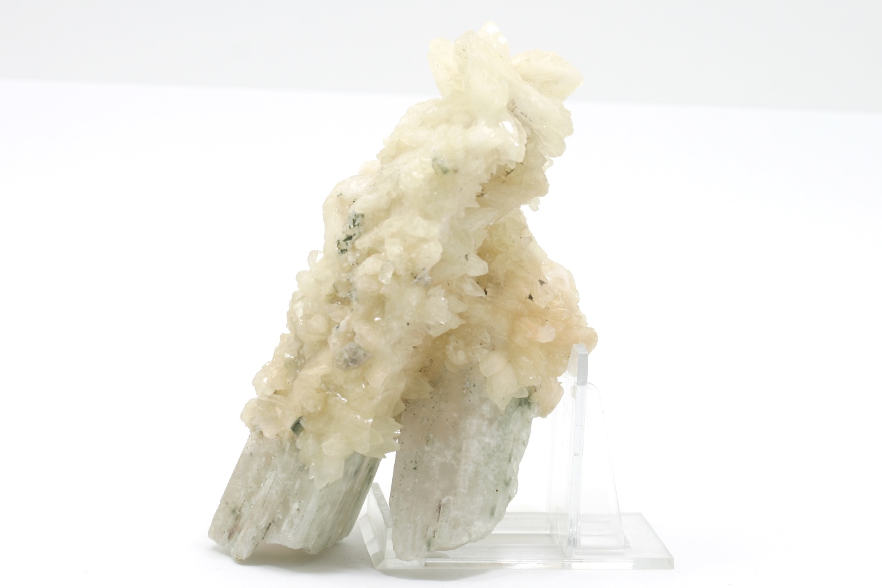 Cluster von zwei großen weißgrauen Kristallen von Danburit mit einer Größe von 12 und 7 cm, bewachsen mit kleineren weißen Kalkitkristallen.