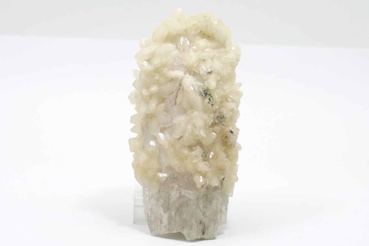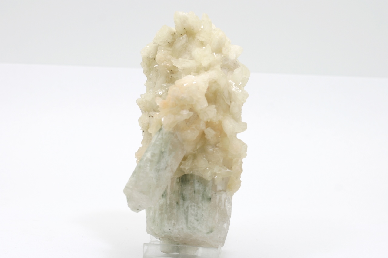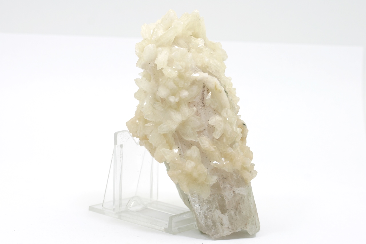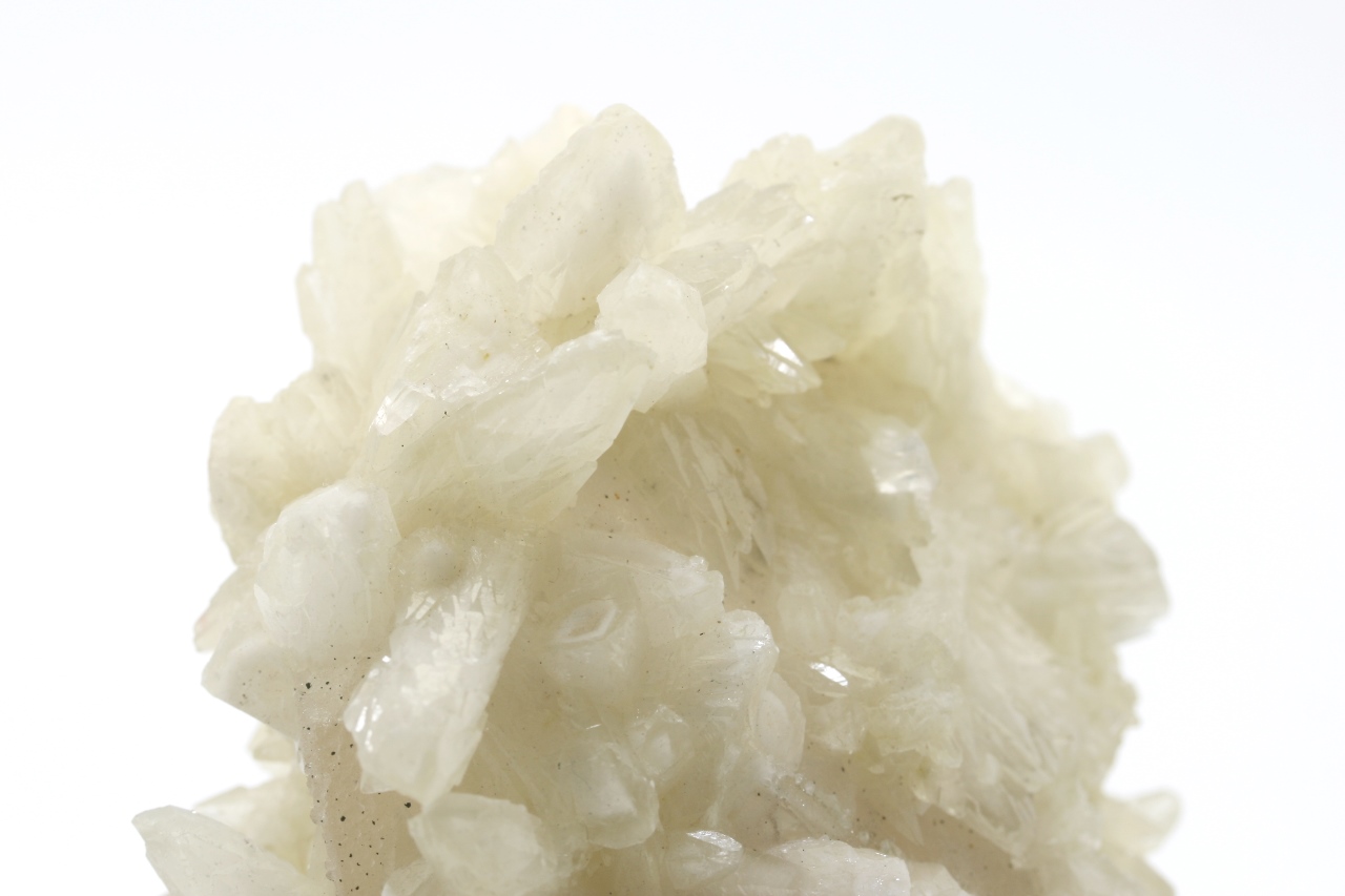 Cluster von zwei großen weißgrauen Kristallen von Danburit mit einer Größe von 12 und 7 cm, bewachsen mit kleineren weißen Kalkitkristallen.