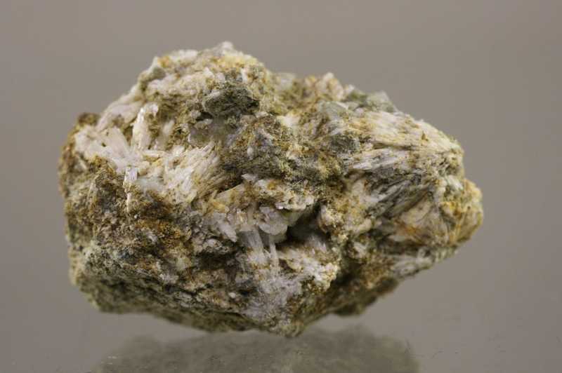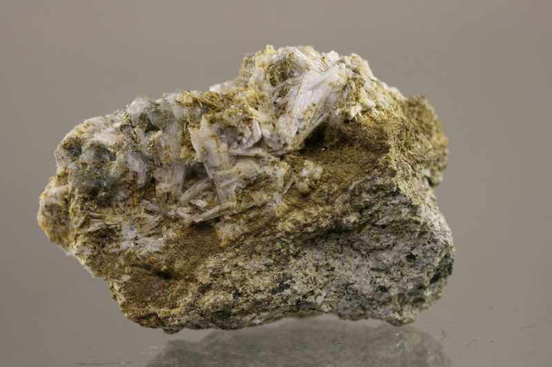 Hochwertige Mineralstufe aus dem Fundort Maglovec. Glänzende weiße säulenförmige Kristalle von Danburit zusammen mit Fakolith.