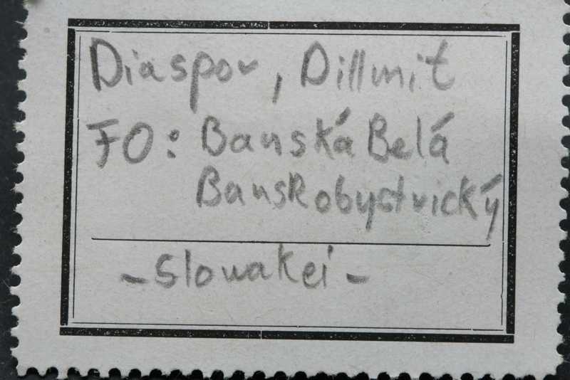Probe von Diaspor aus der Lokalität Banská Belá, Slowakei. Probe von rosa Diaspor-Kristallen im weißen Dillnit.