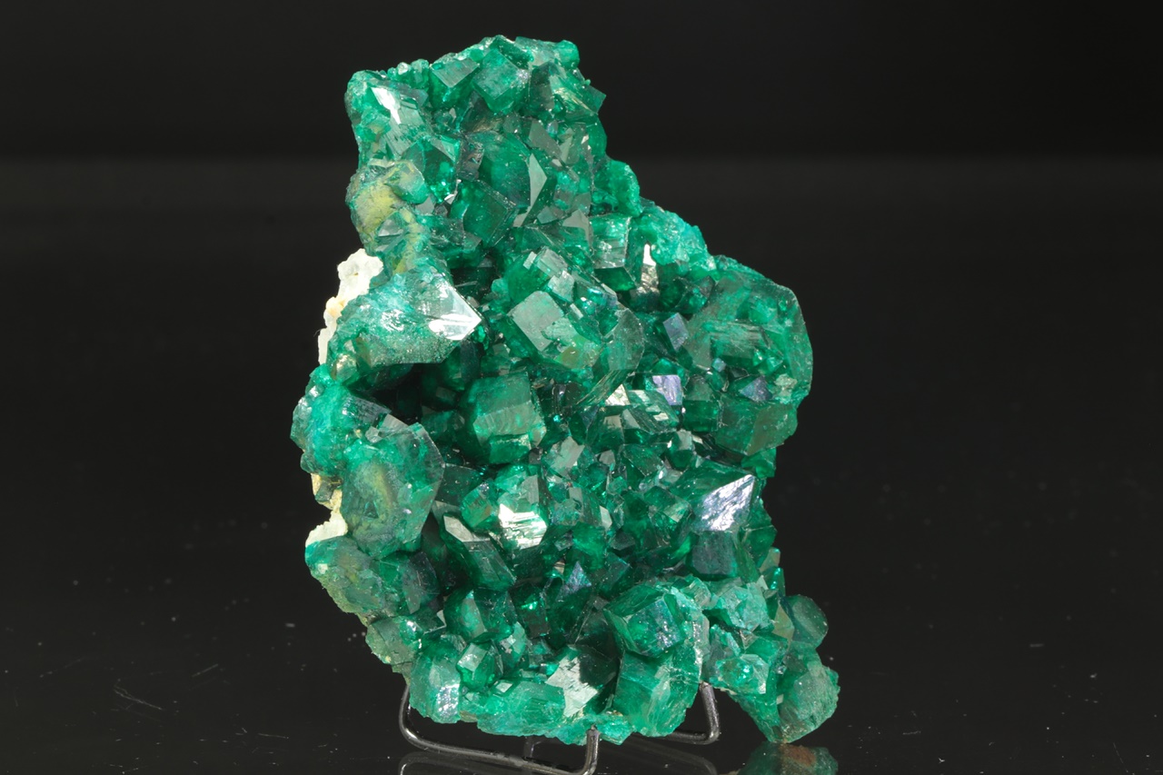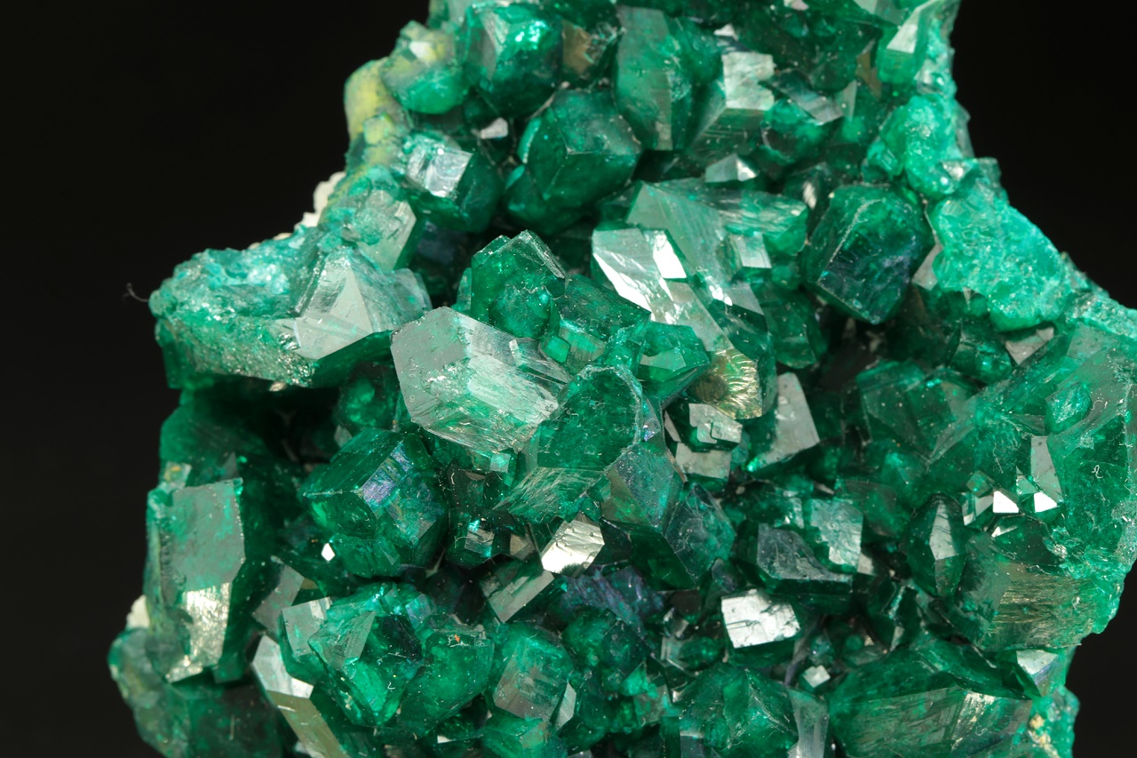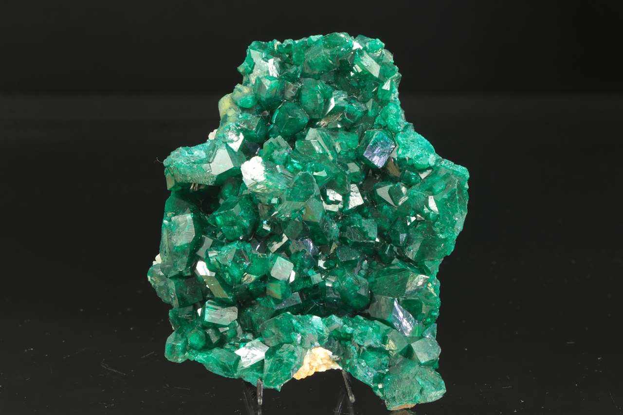 Nádherná drúza intenzivně zelených, lesklých krystalů dioptasu ze slavné namibijské lokality. Největší krystaly jsou až 1,5 cm velké.