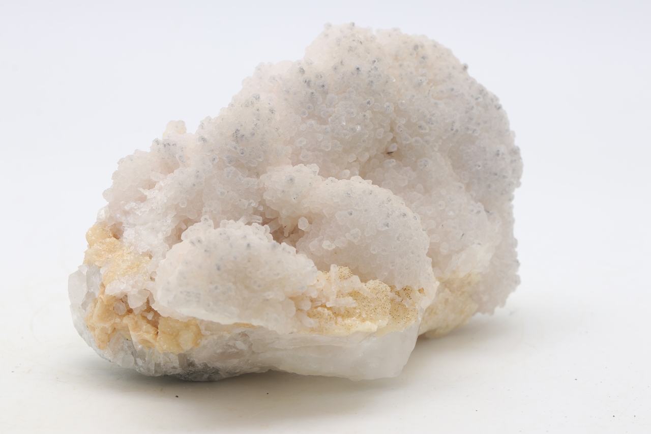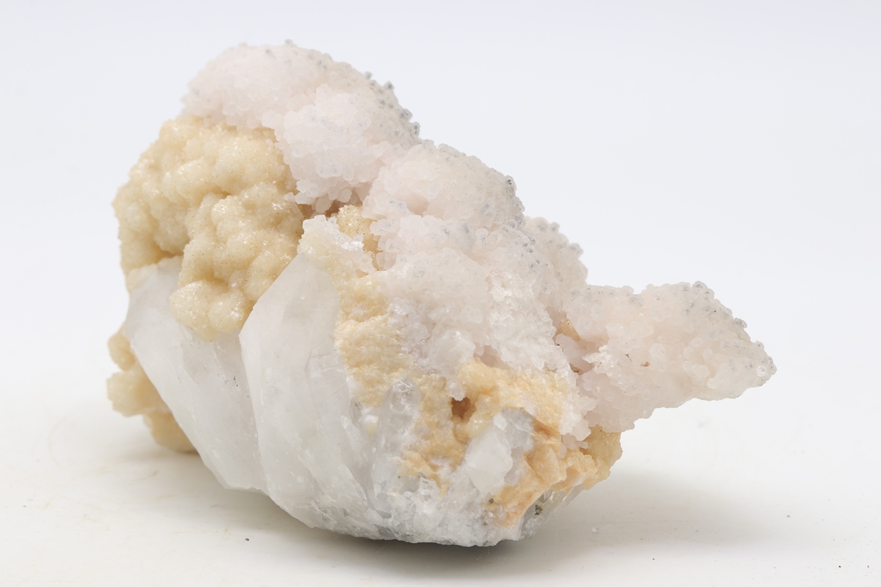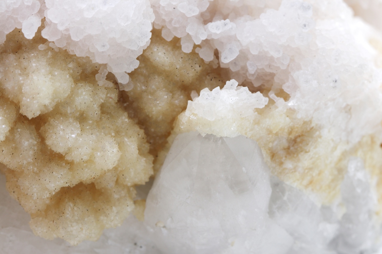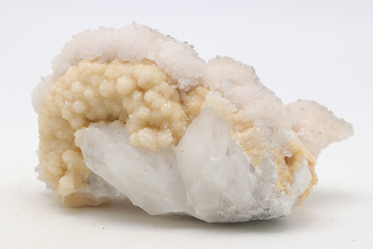 Kristall überwachsen mit orangefarbigem Dolomit und weißem Calcit mit schön ausgebildeten Kristallen.
