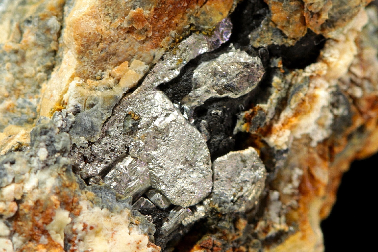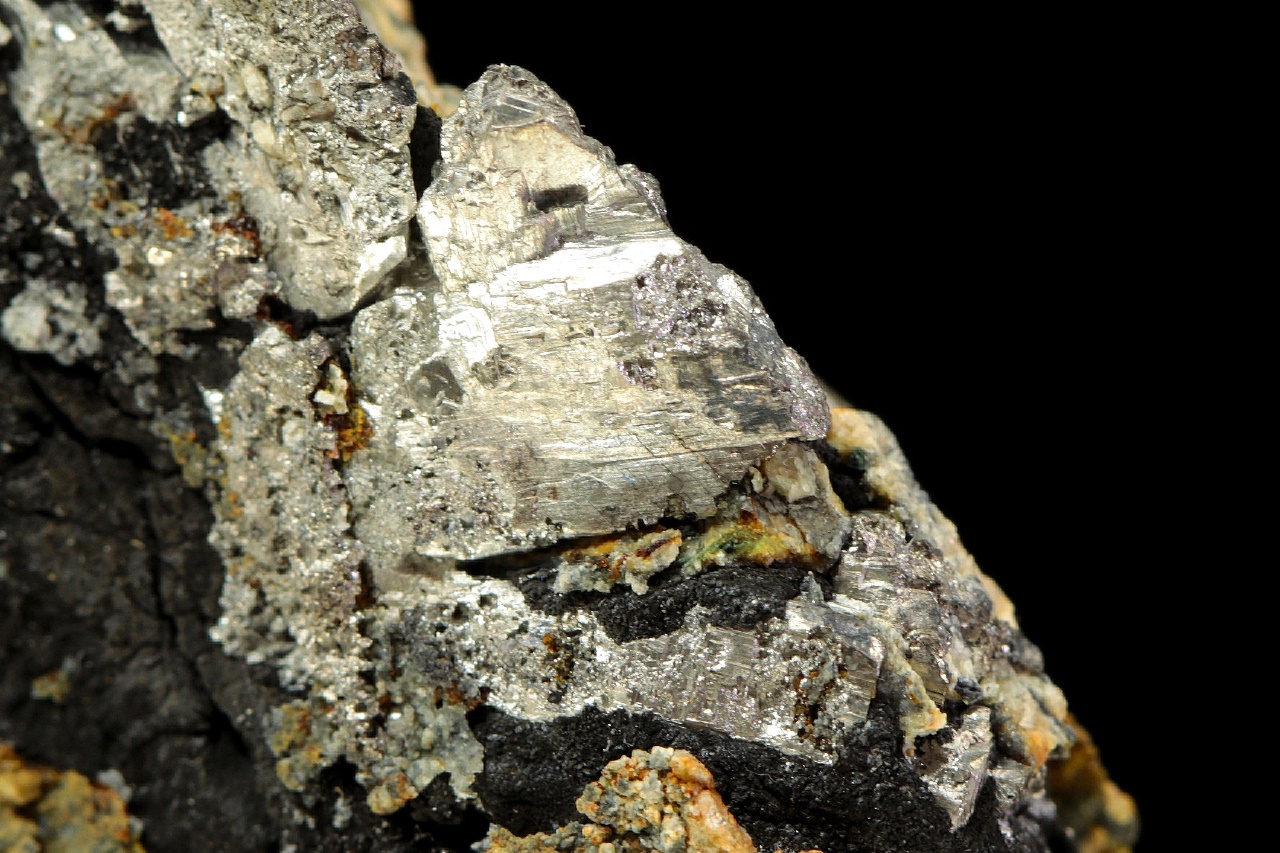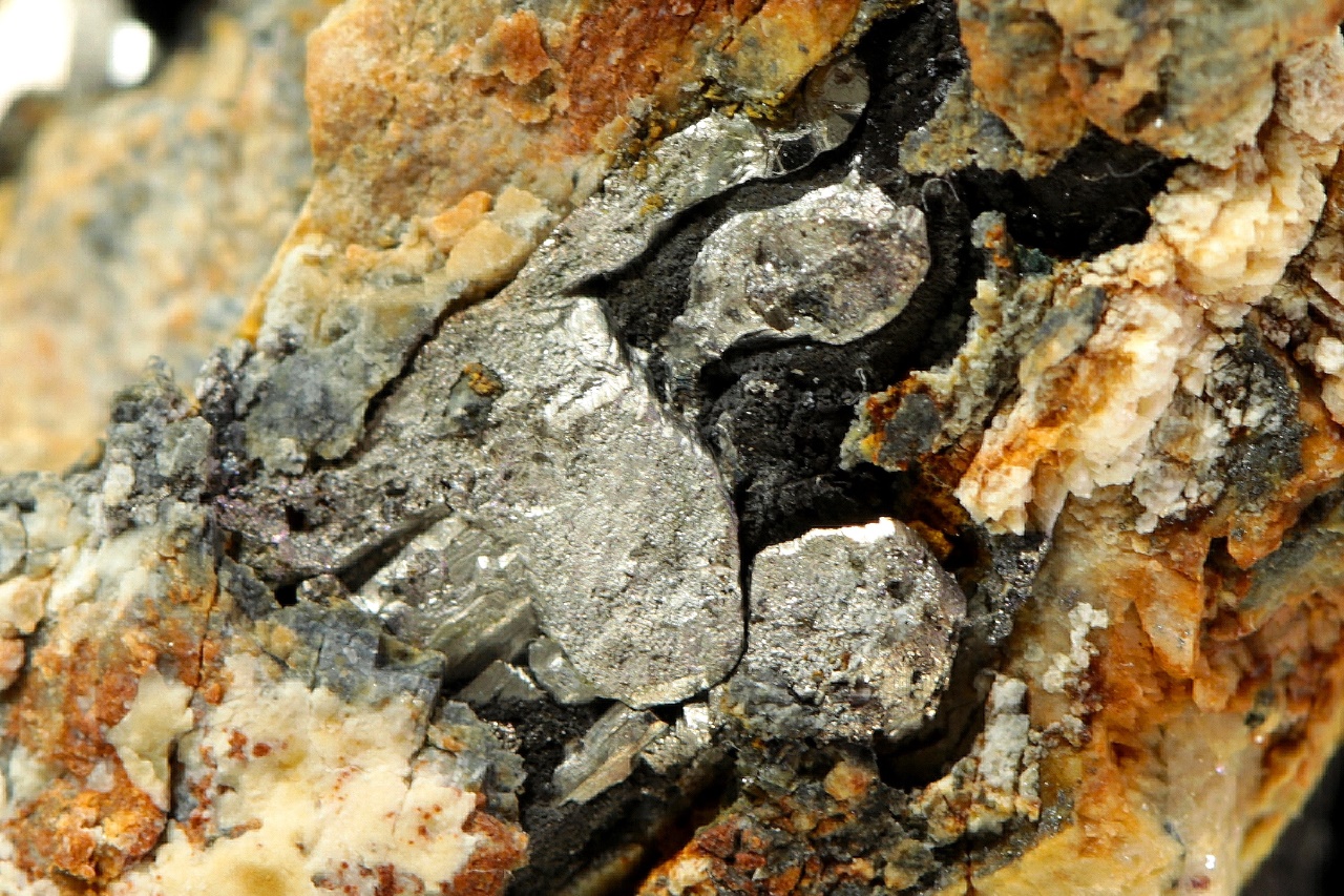 Vzork rozvětvené žíly černého arsenu se stříbrně lesklými krystaly dyskrazitu.
