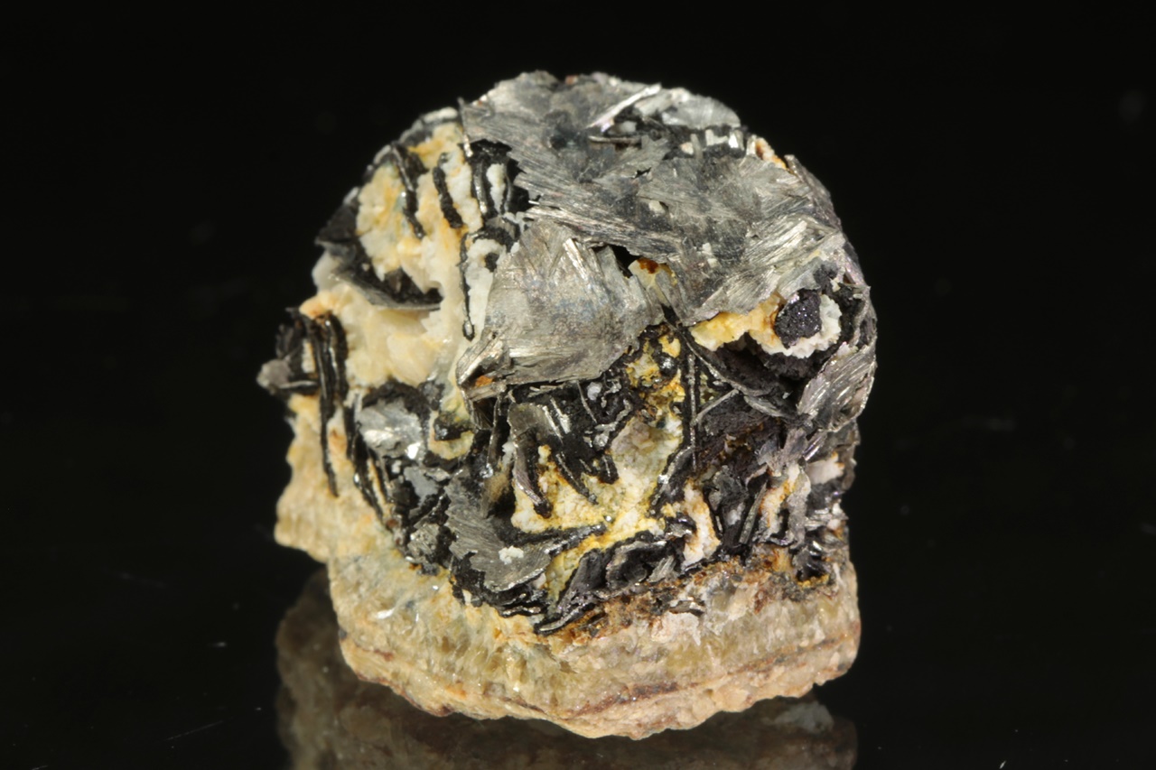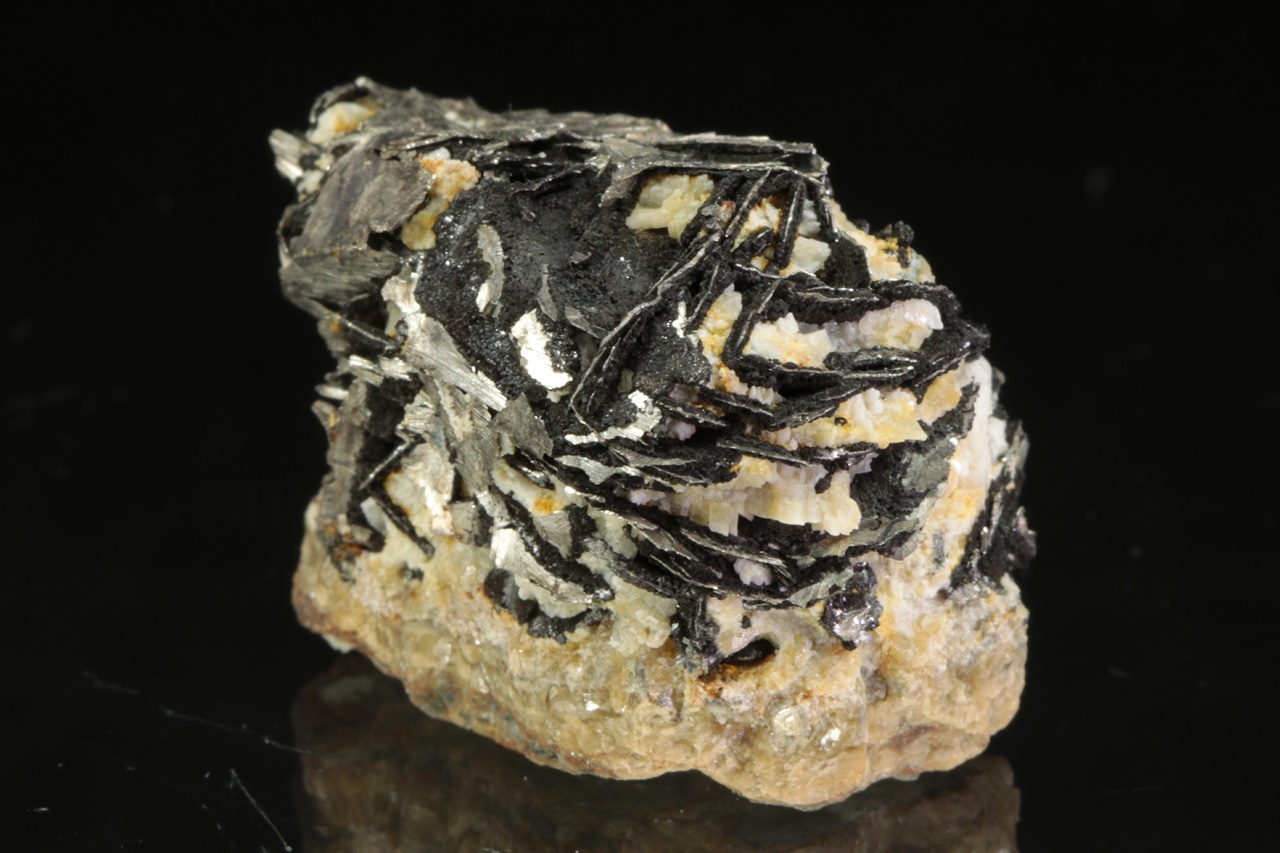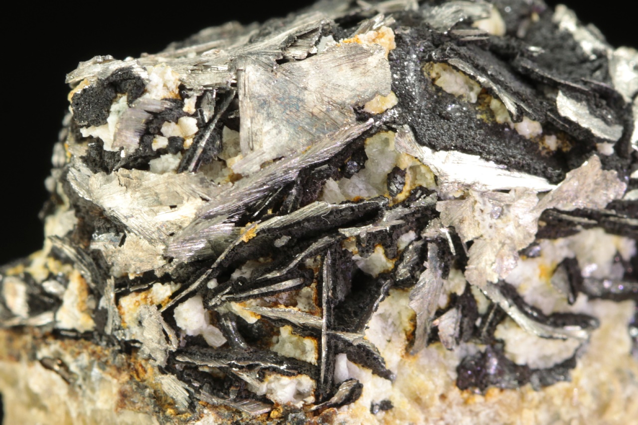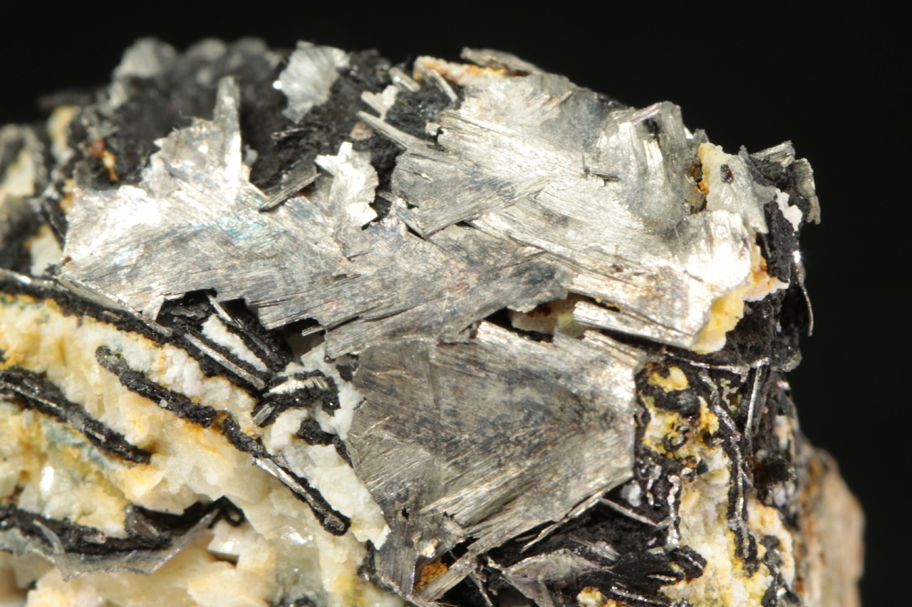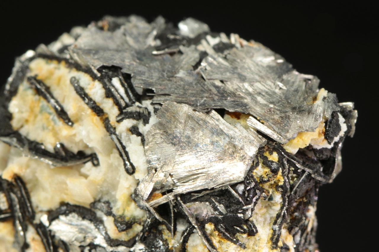 Metallisch glänzende, lamellenartige Dyskrazit-Kristalle teilweise überwachsen von einer dünnen Schicht schwarzen Arsens.