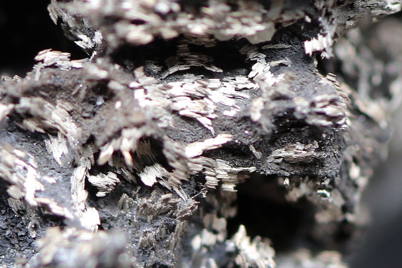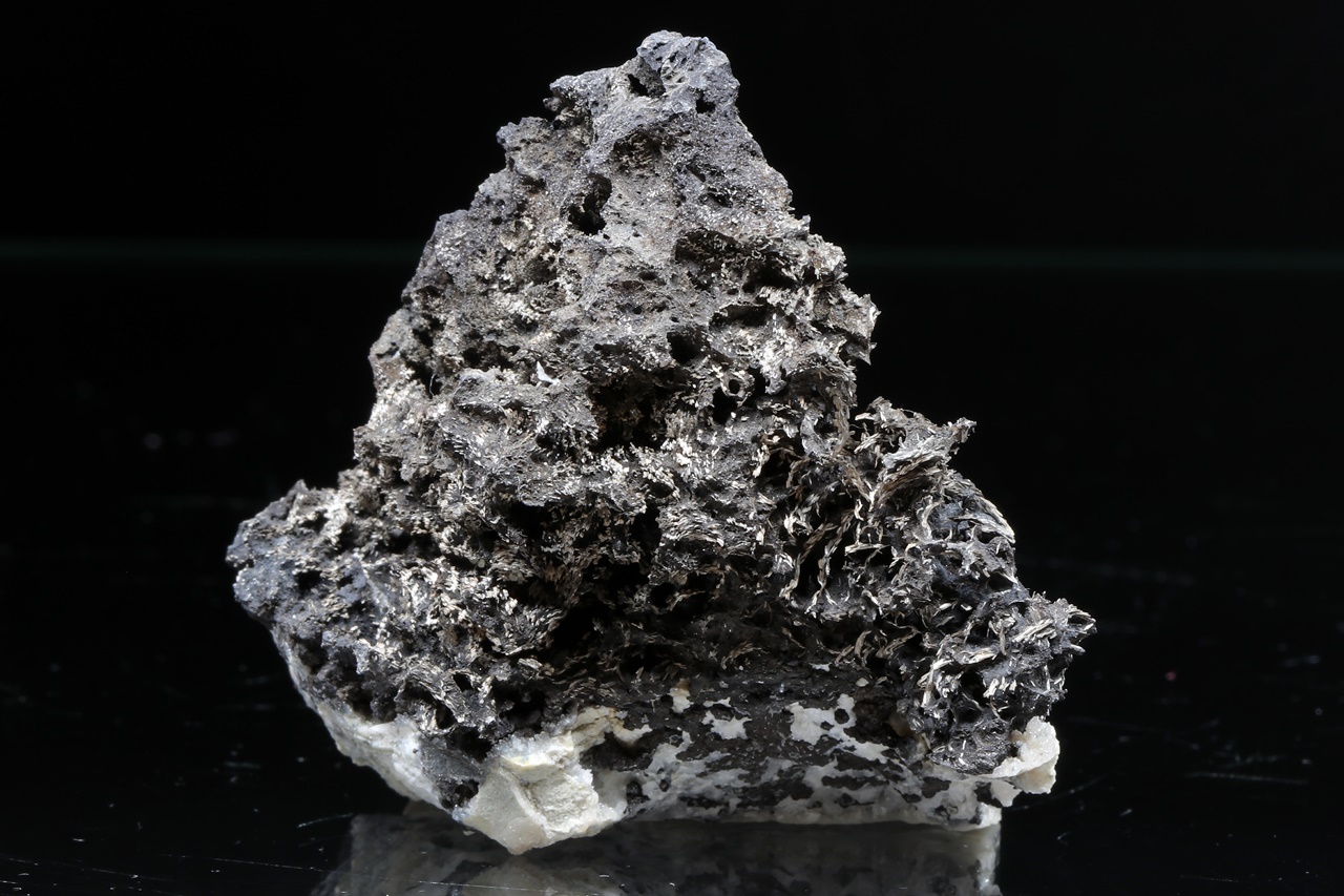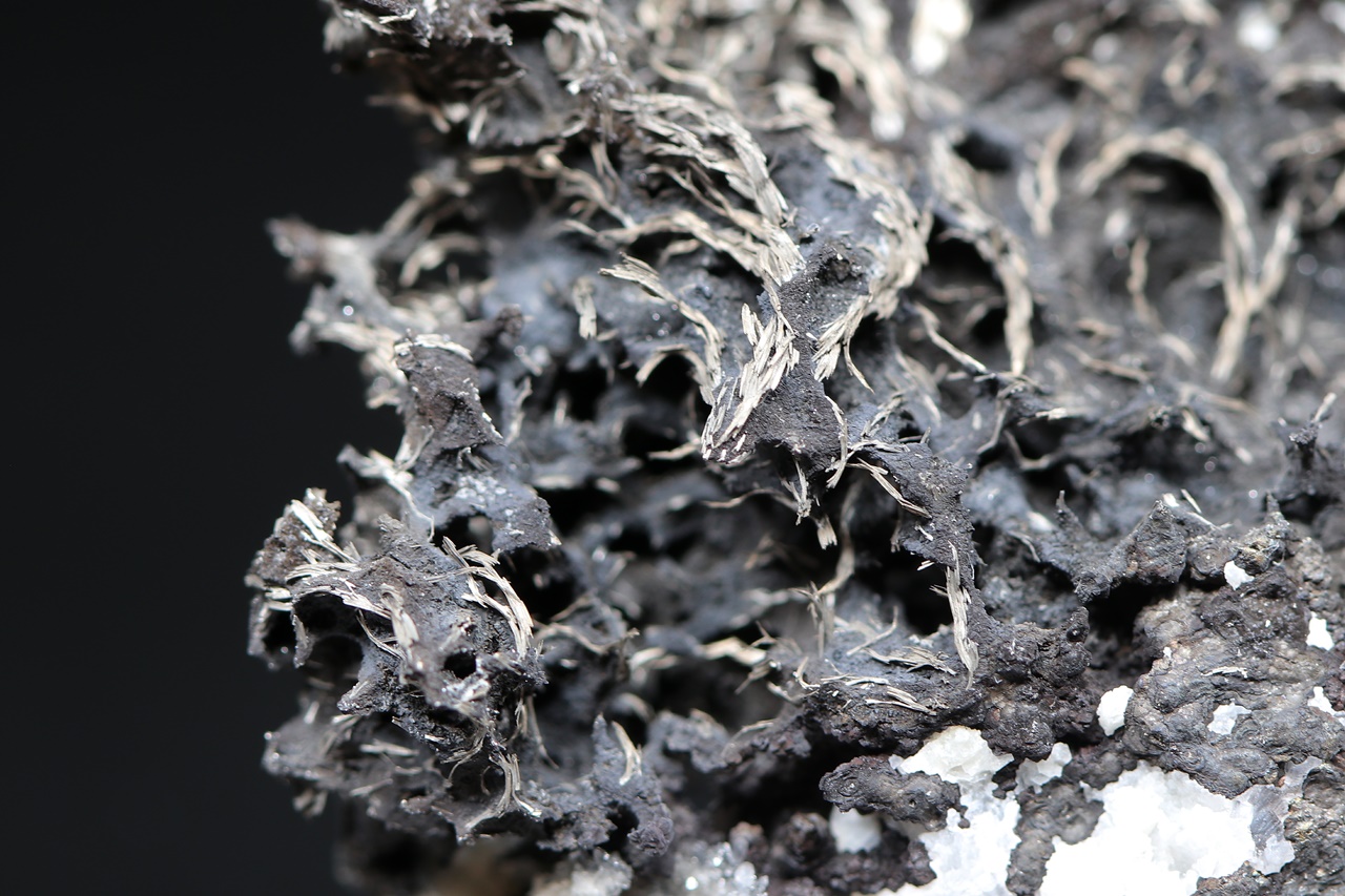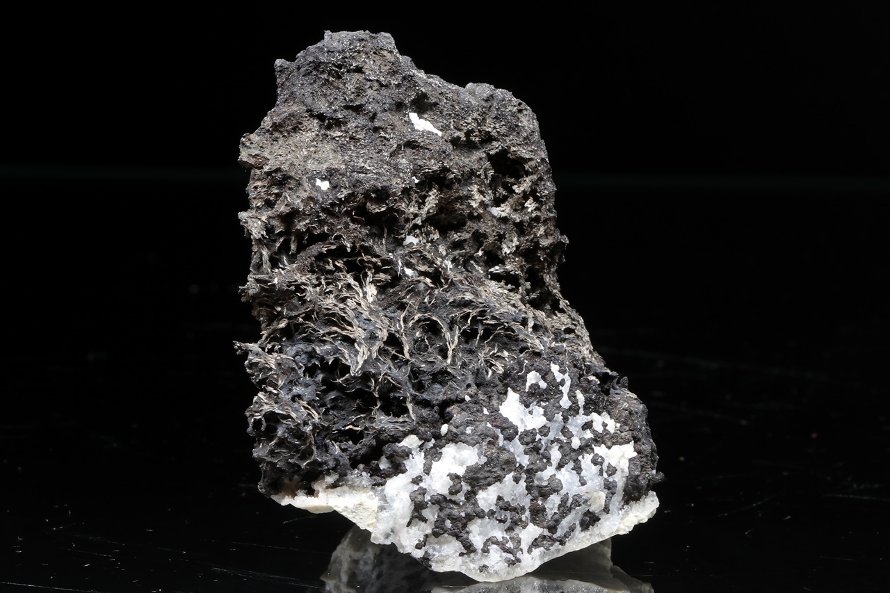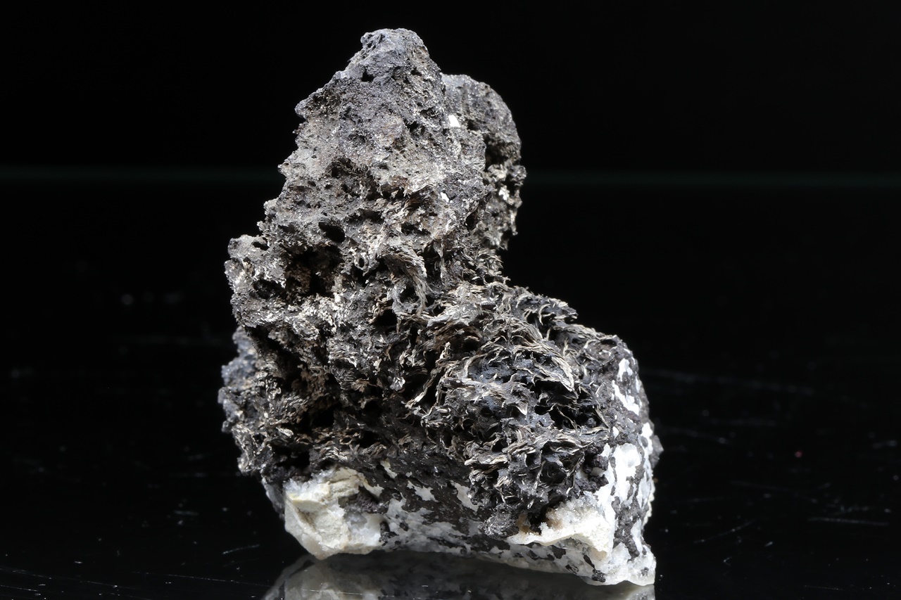 Dendritisch gewachsene Kristalle des metallisch glänzenden Dyskrazit in schwarzem Arsen, die mit weißem Quarz durchwachsen sind. Das Muster kann nicht verschickt werden, es kann nur persönlich in unserem Geschäft abgeholt werden.