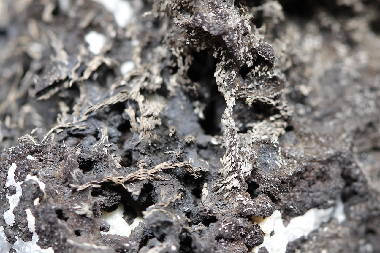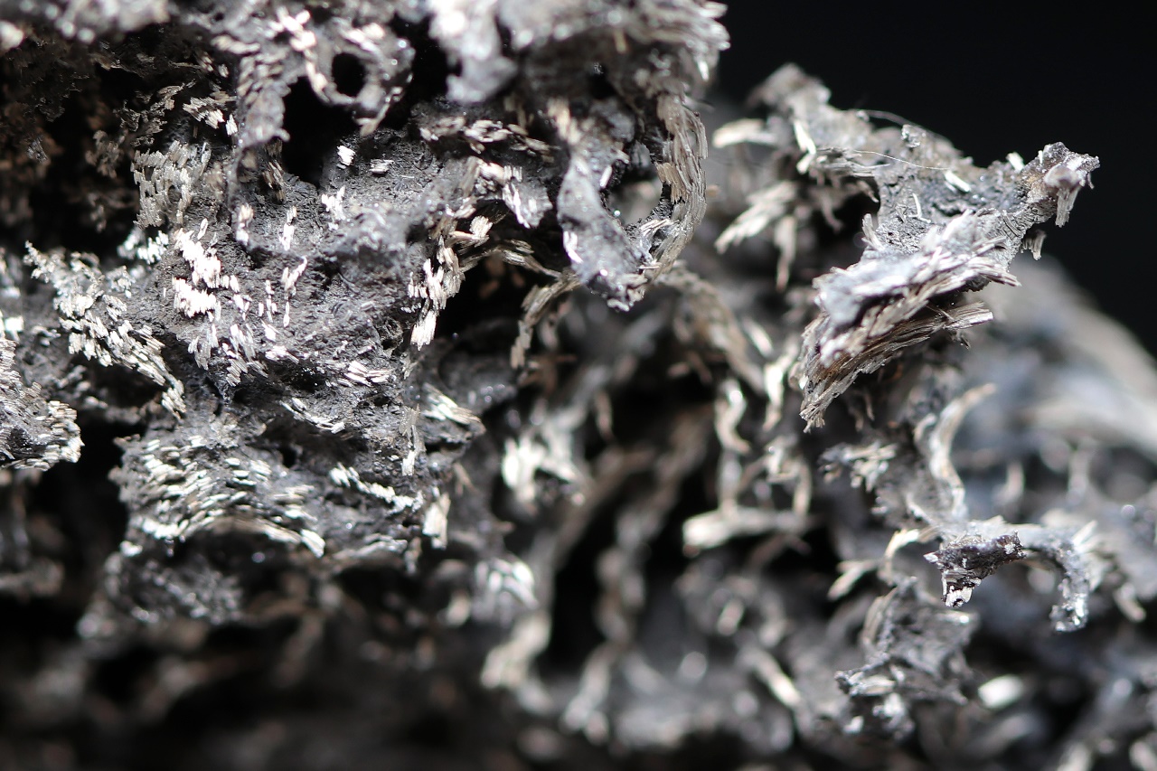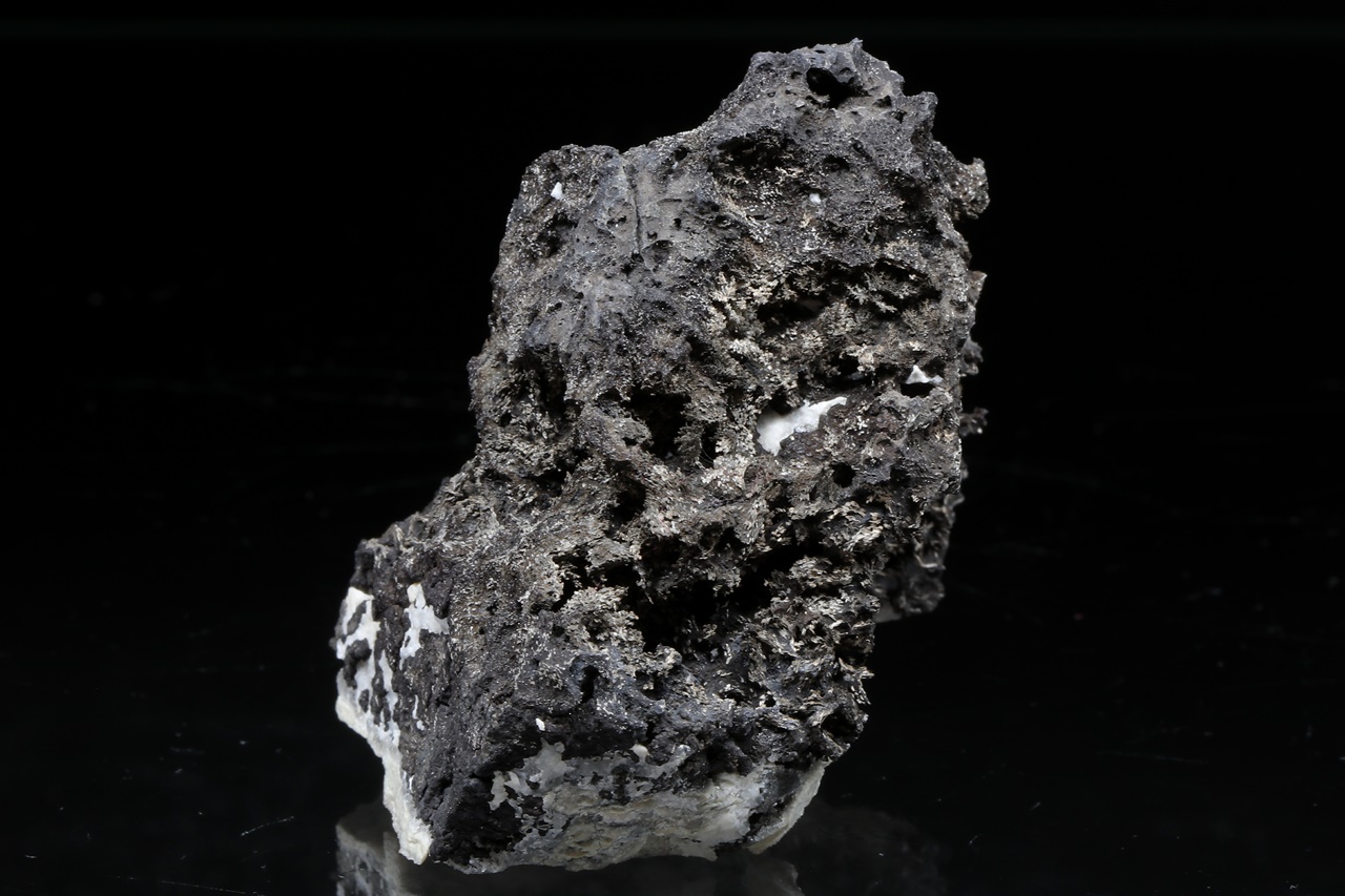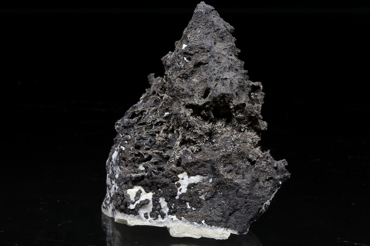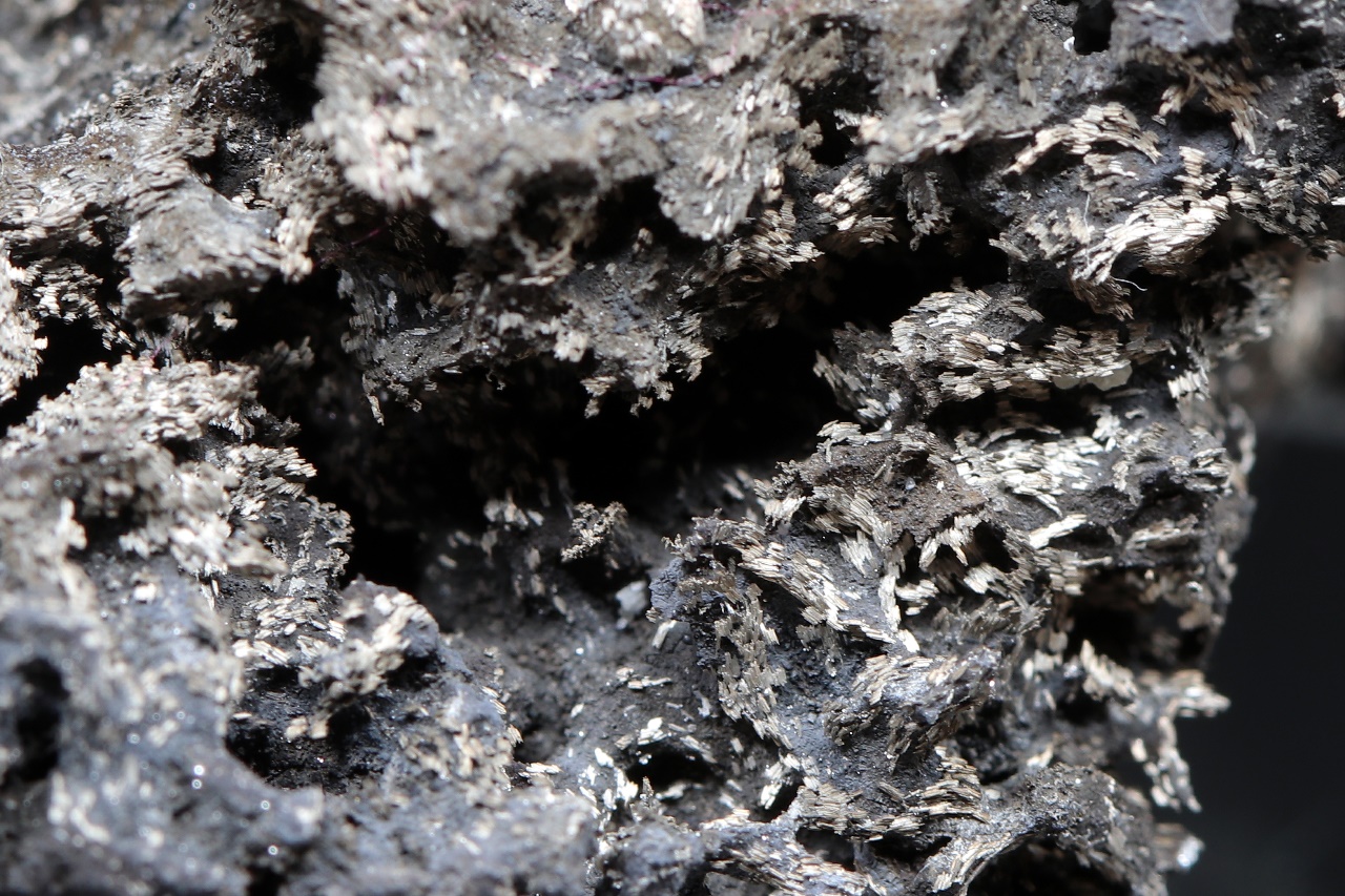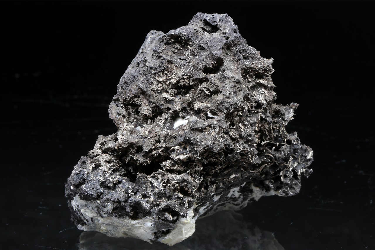 Dendritisch gewachsene Kristalle des metallisch glänzenden Dyskrazit in schwarzem Arsen, die mit weißem Quarz durchwachsen sind. Das Muster kann nicht verschickt werden, es kann nur persönlich in unserem Geschäft abgeholt werden.