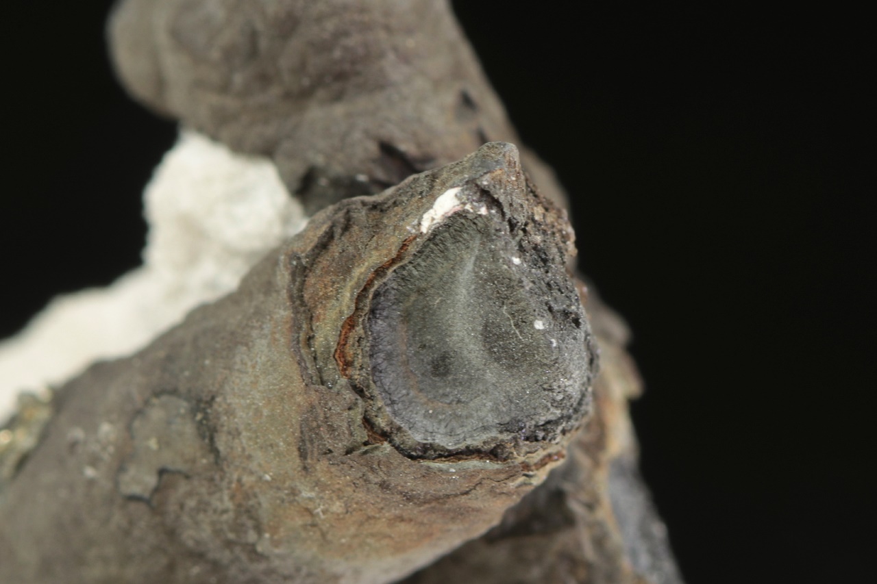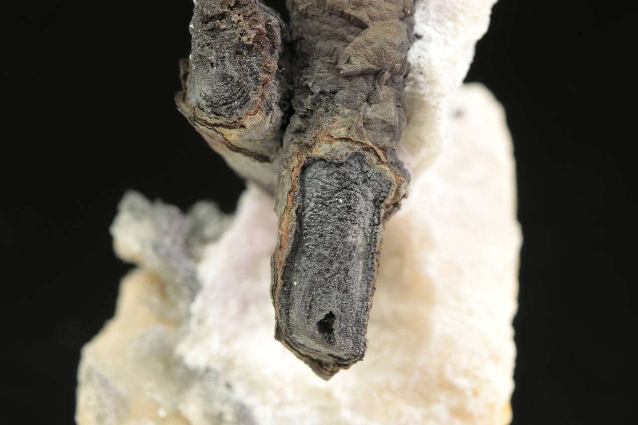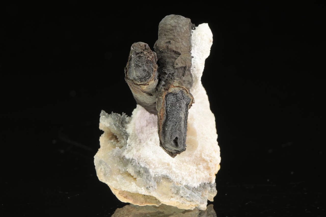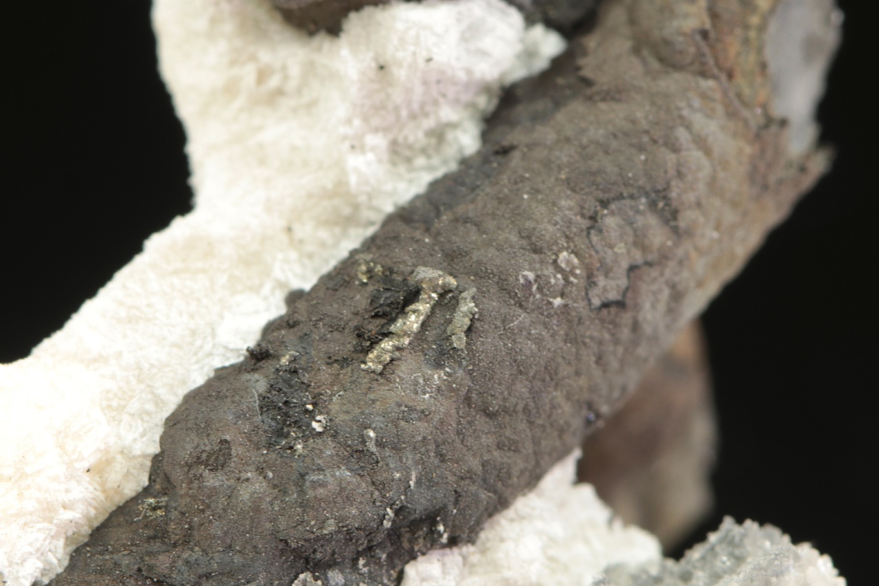 Ästhetischer Cluster von etwa 2 cm großen Dyskrazit-Kristallen, überwachsen mit schwarzem Arsen.