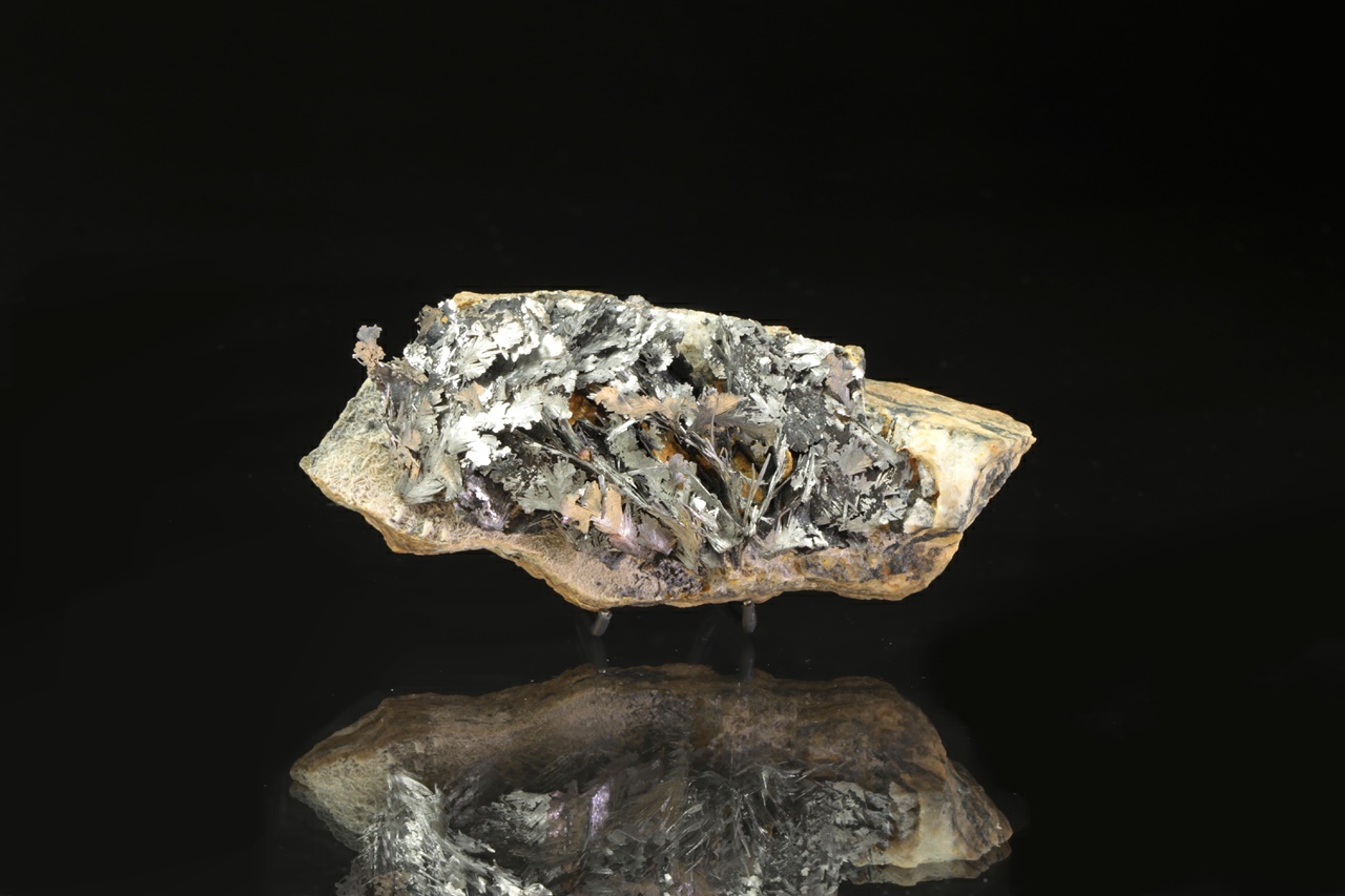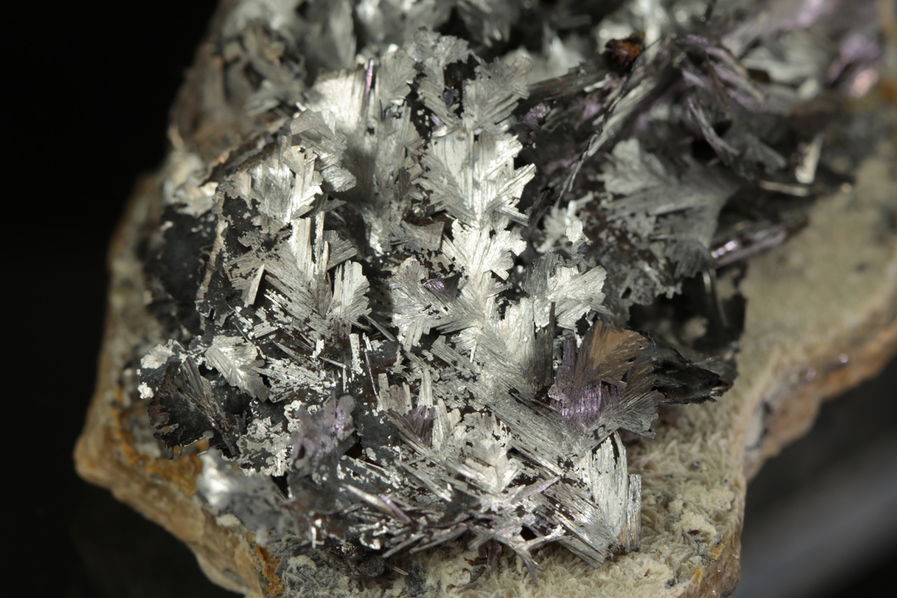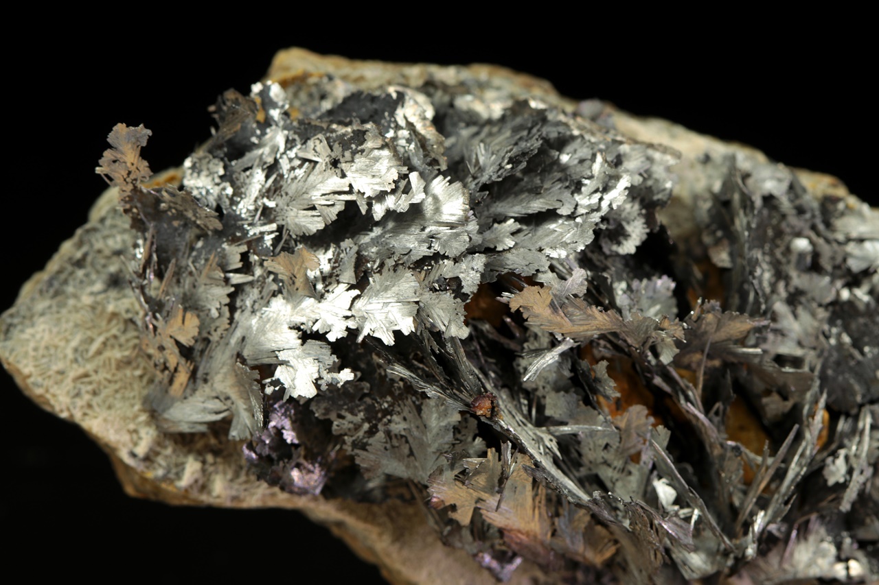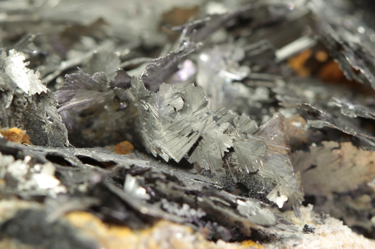 Silberglänzende, plättchenförmige Kristalle aus Silberantimonid. Dyskrasit bildet auf der Stufe Zwillinge zu dendritisch gewachsenen Kristallen. Der größte Kristall ist 2 cm groß.